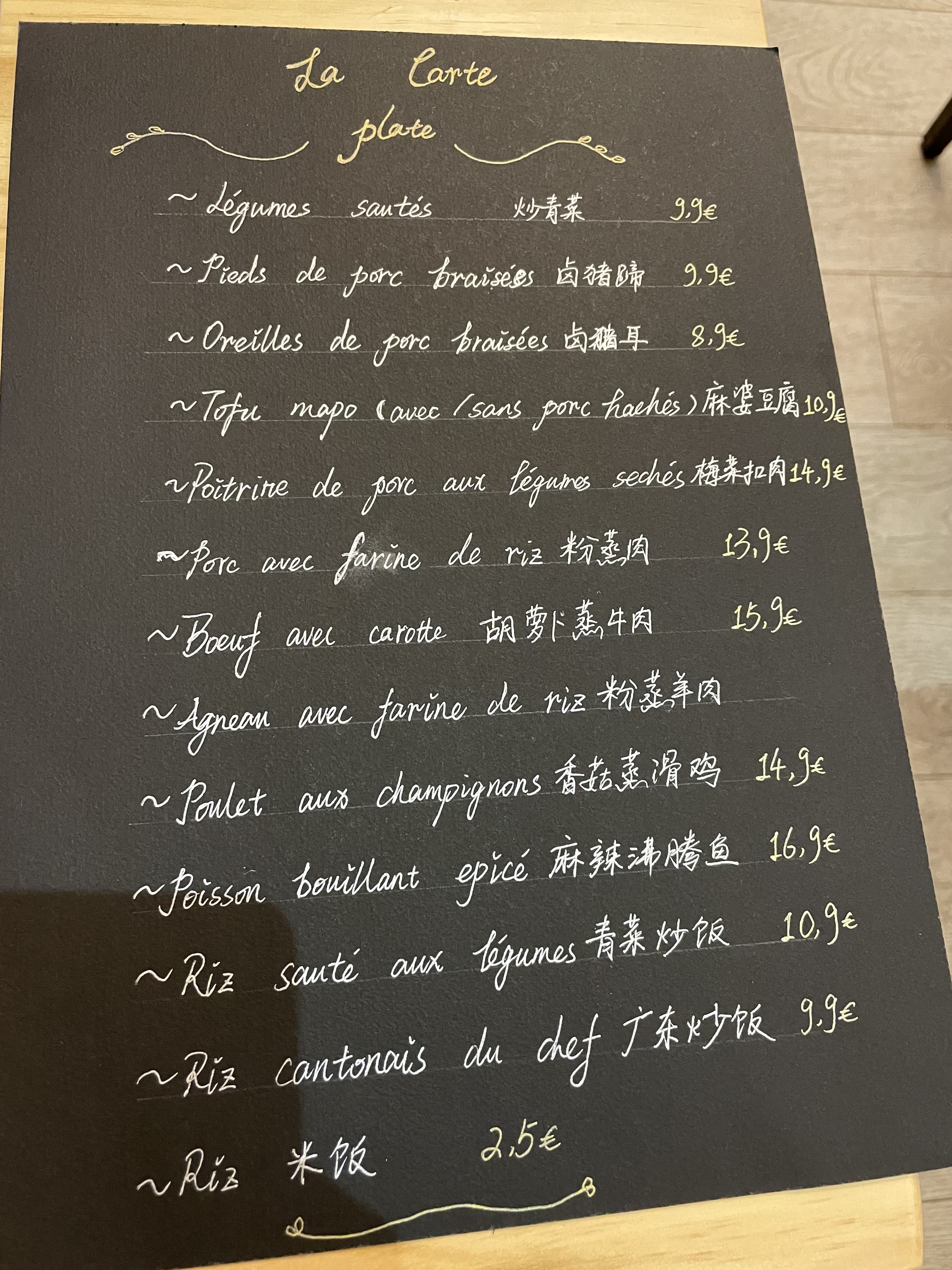 Nouveau resto (chinois traditionnel), à la place de Kaya (resto japonais) dans le quartier. Les plats sont bons et différents des autres restos chinois (Carnet Gourmand, Bon Voyage, Engimono). La soupe pimentée et acidulée est très bonne mais particulière (goût acide très prononcé), la soupe hotpot est excellente et très copieuse, le porc braisé est délicieusement fondant mais le chou fermenté a un goût très particulier. N'hésitez pas à venir tester 😊