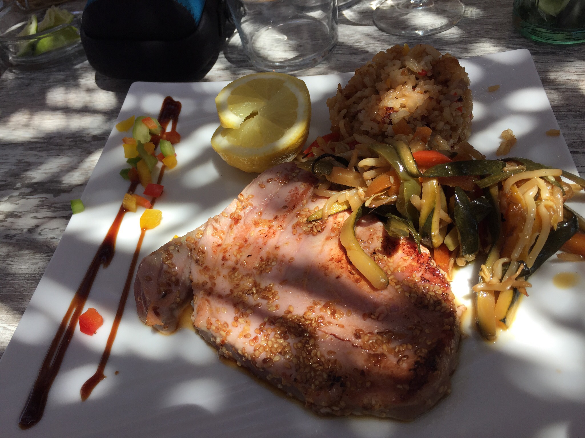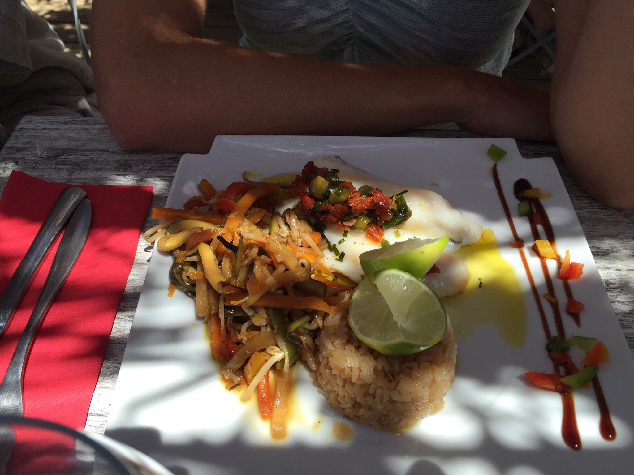 Une belle assiette autour d'une bonne dorade 😊 mais attention aux guêpes et merci au serveur et son marc de café très efficace 😉