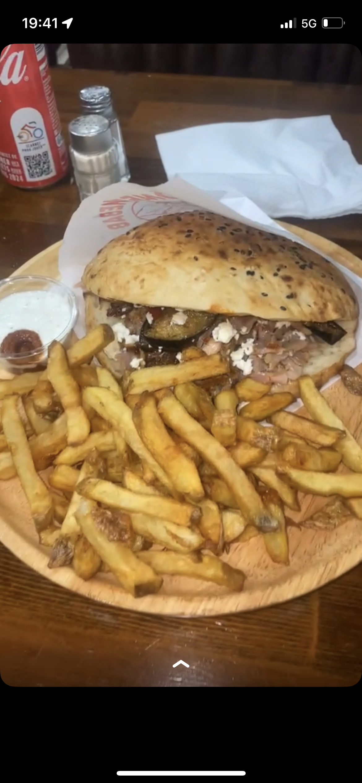 Kebab moyen Frites maison mais trops grasses Ca pourrait plaire à certains m1is perso j'aurais préféré un sandwich mieux assaisonné avec de la viande juteuses et pas top cuite. Les frites pas mal mais encore trop grasses.
