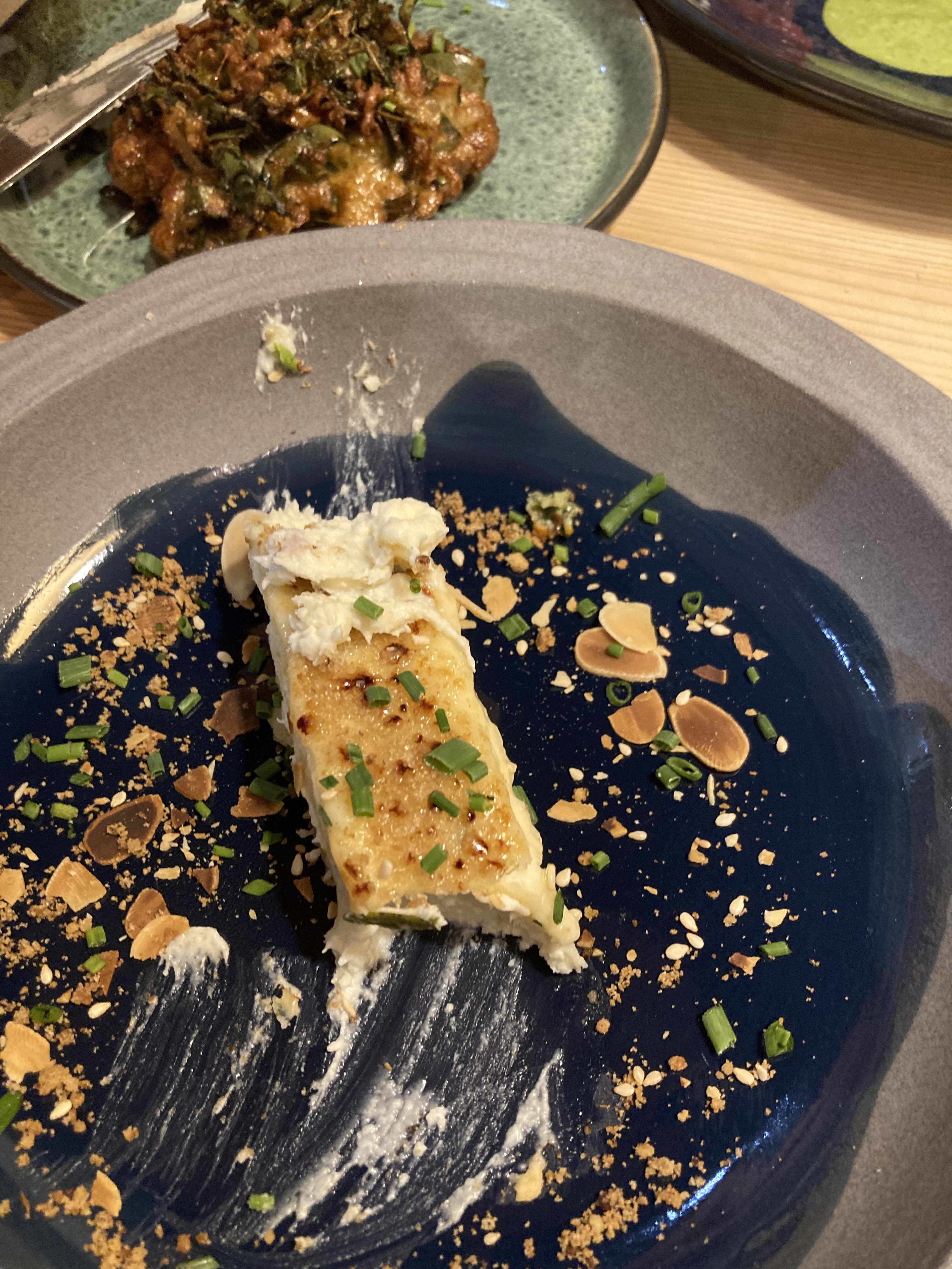 La nourriture très savoureuse, le plateau de crudités falafel, etc. était magnifique. Les raviolis étaient fantastiques. Mais le point culminant était les desserts, la tranche de caramel au chocolat et la meilleure madeleine que j'ai jamais mangée.