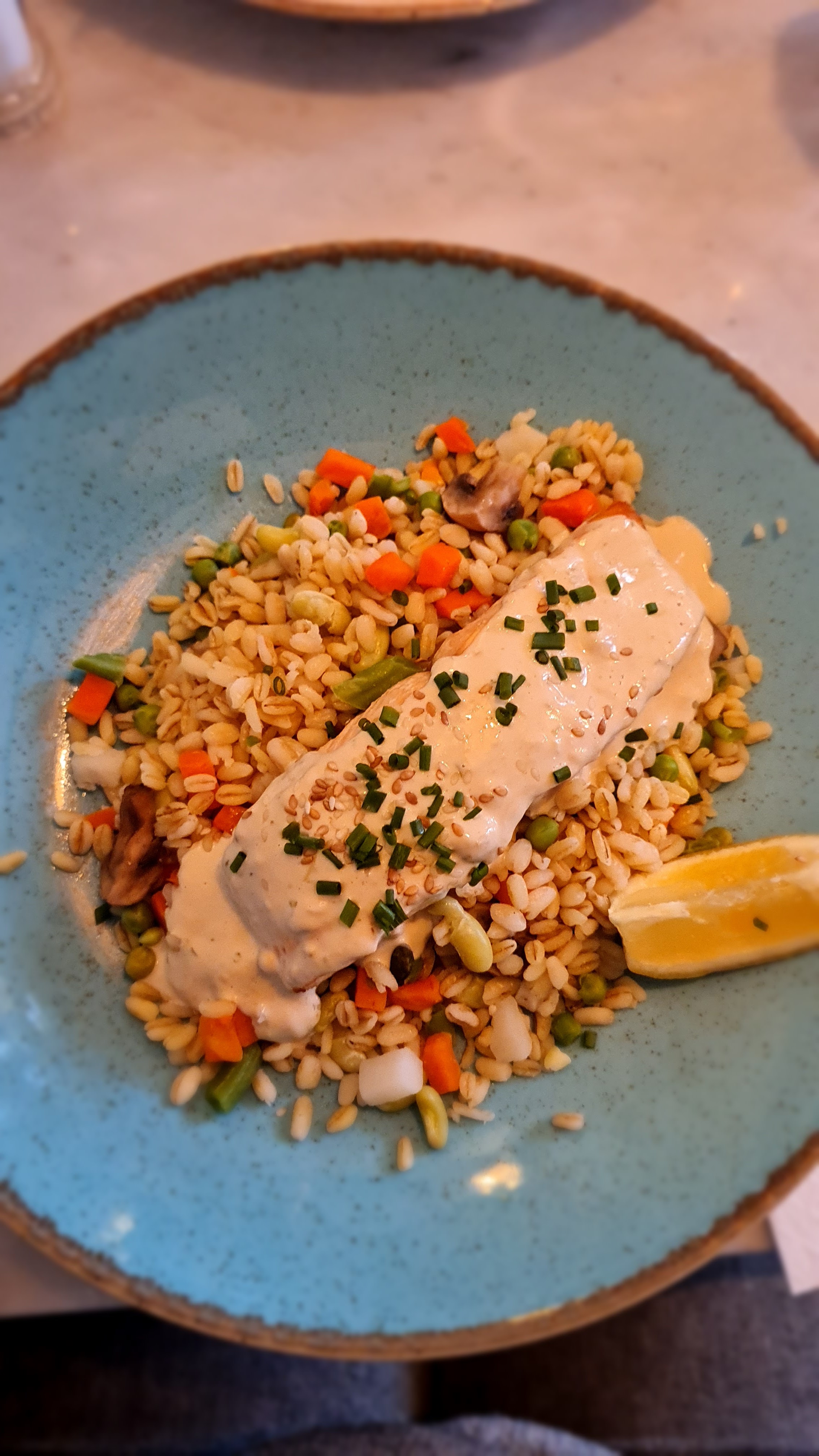 Très bon pavé de saumon/risotto et bon dessert à la mangue. Cadre très jolie et service sympathique. Je recommande !
