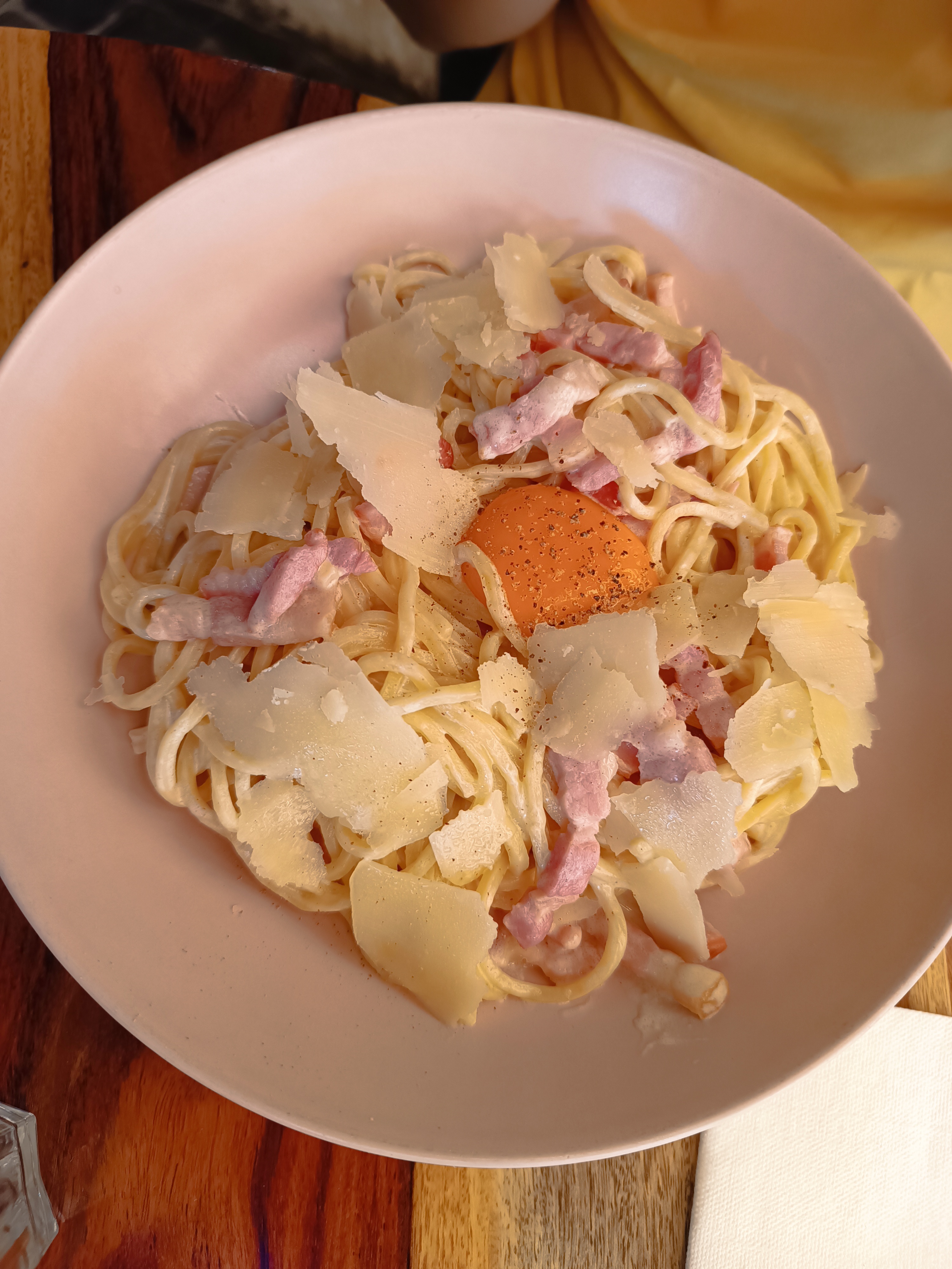 La nouvelle recette des pâtes carbo est décevante, j’avais juste demandé à ce qu’il n’y ai pas de parmesan, on m’a servi une assiette très peu garnie de pâtes avec un jaune d’œuf au fond. Après réclamation, une nouvelle assiette avec une sauce à la crème et des morceaux de gras. J’ai été très déçue, l’ancienne recette était vraiment meilleure. La salade de mon amie était peu copieuse. Bref cher pour ce qu’on a dans l’assiette! La déco est sympa certes mais cela ne fait pas tout…