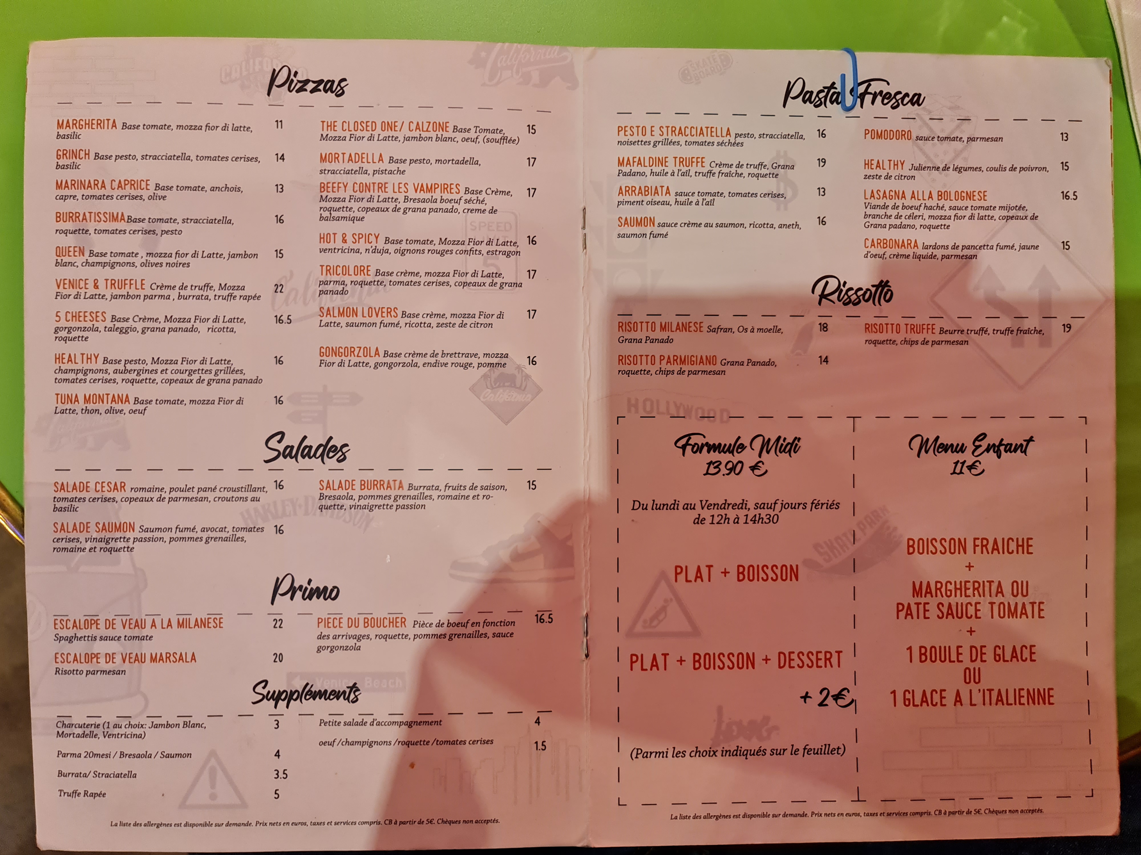 Lieu incroyable ! Des entrées, plats et desserts copieux avec des produits frais , Une carte avec du choix, La décoration nous transporte de l'Italie jusqu'en Californie, Les pizzas sont fraîches, les pâtes également ! Je recommande vivement !