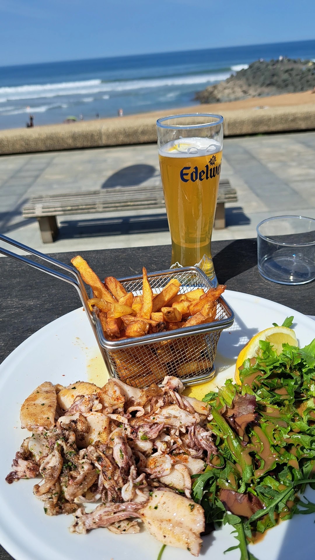 Plat commandé : chipirons ! Déçu par la texture et le goût. Trop grillé d'un côté, pas du tout de l'autre. Fade! Sensation de grain de sable en les mangeant. Sinon l'apéro et les frites..parfait. 👍