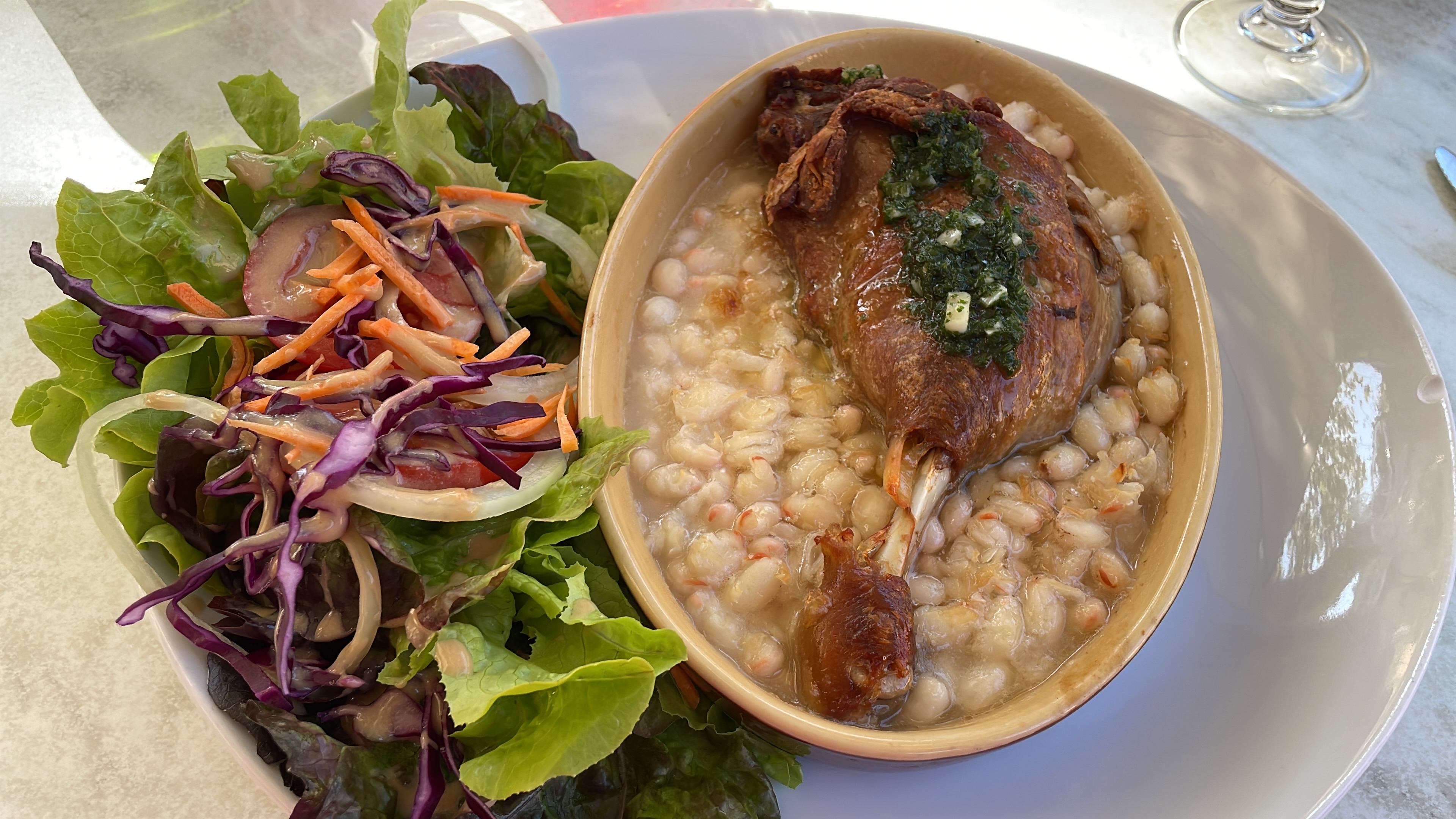 Ça avait l’air bon, mais… prévoyez une clochette ou un petit drapeau rouge pour vous faire remarquer…. Et gigotez les bras… Nous avons hélé le serveur une première fois, il a répondu qu’il revenait. Puis d’autres clients ce sont installés autour de nous, puis il est revenu prendre les commandes des autres clients arrivés après nous… et est reparti… pas très pro. Peut-être étions-nous invisibles ?? Alors nous sommes partis.