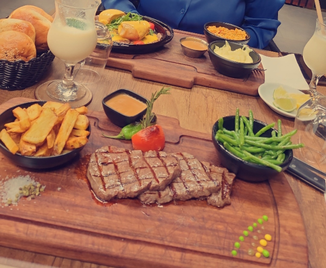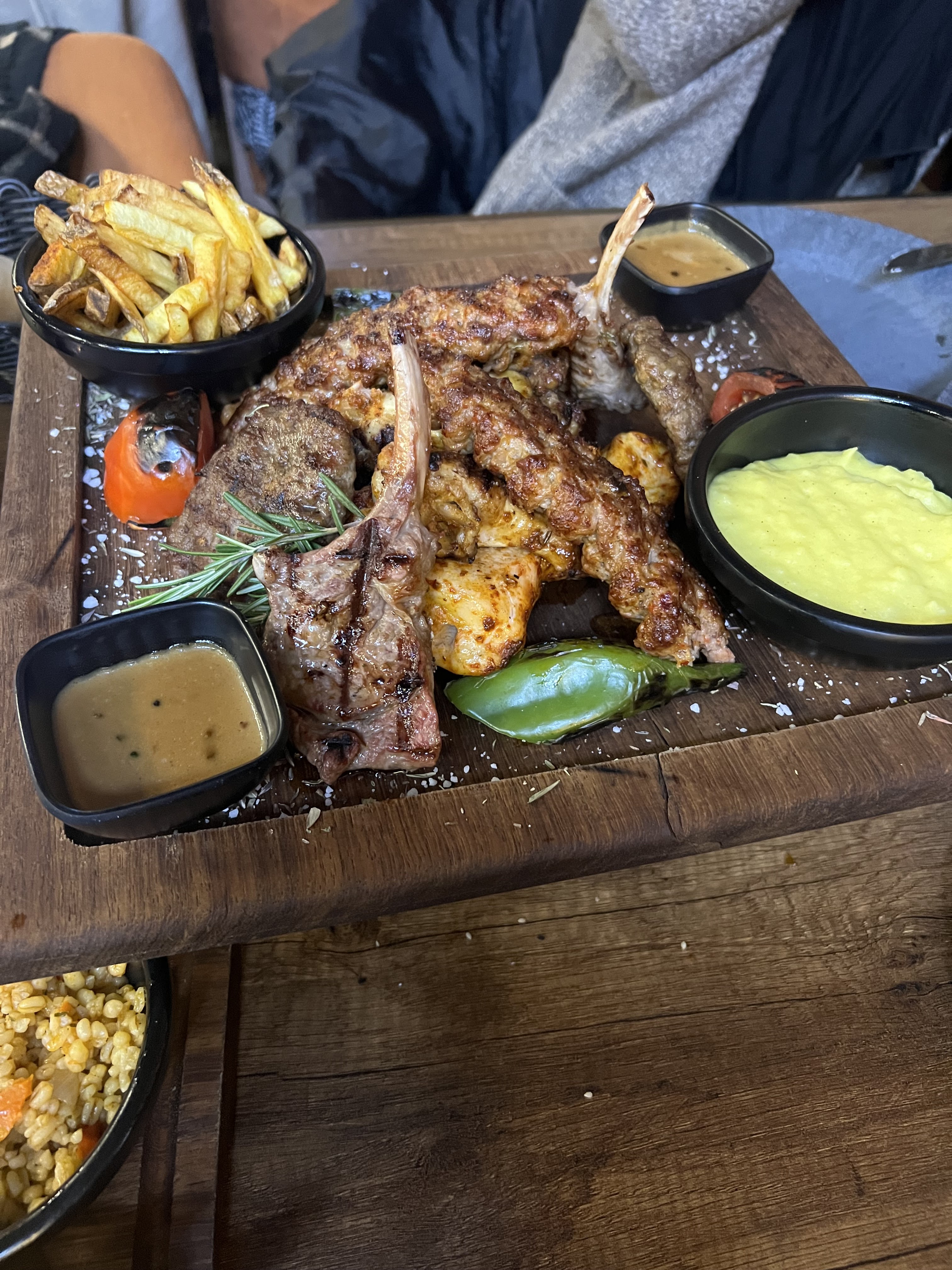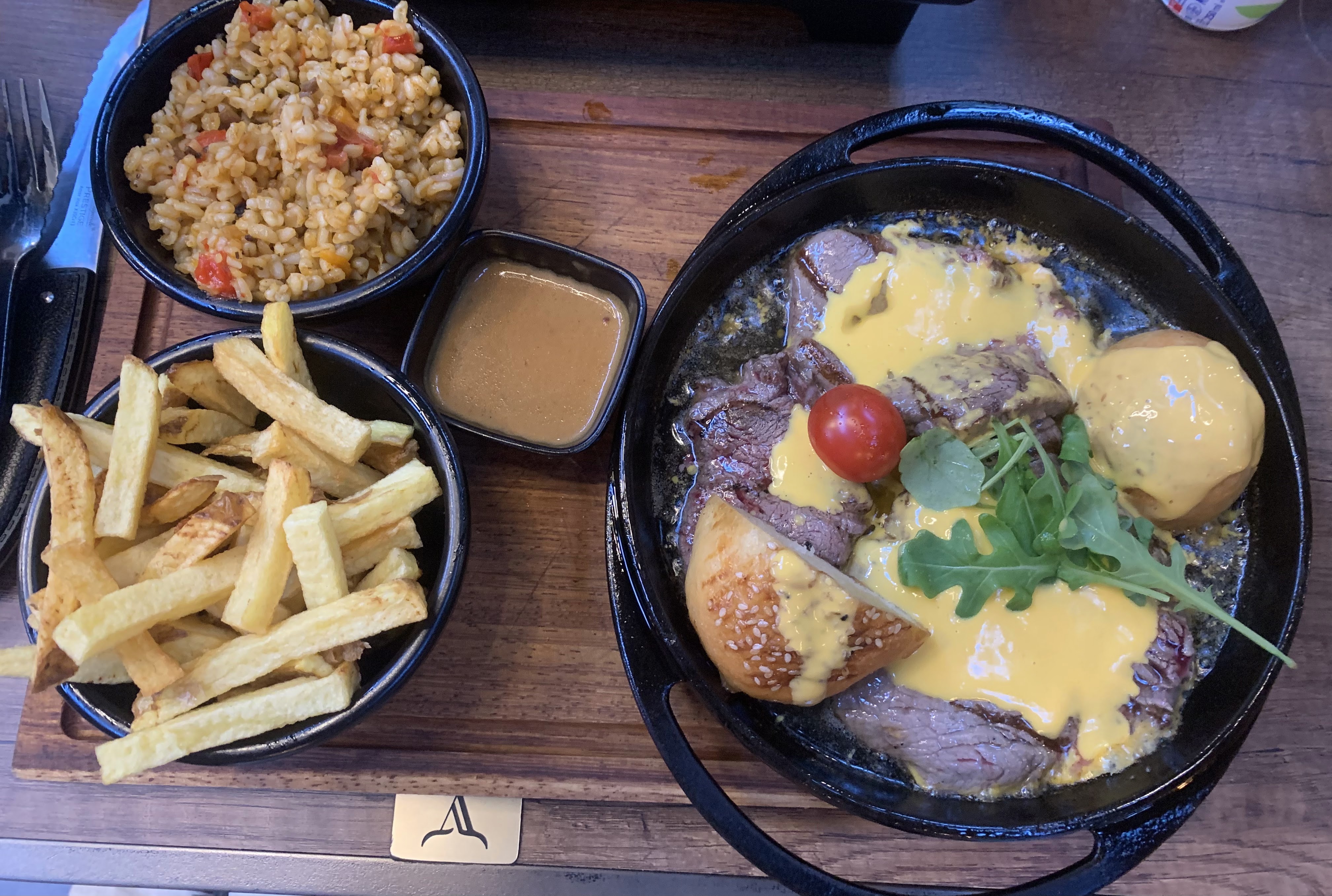 Un fabuleux moment passé avec mes camarades pour le déjeuner. Restaurant Steackhouse spécialité turc 🇹🇷🍖 halal ✌️! Grand, très propre, joli décor et un bel atmosphère. Les plats sont très bons, notamment l'entrée aubergine yaourt dont j'ai oublié le nom du plats, et le houmous pas mal aussi. Les viandes sont fraîches, bien assaisonnées, le steack fromage est vraiment succulent 😋 je me suis régalé 🥩🧀✌️ Le rapport qualité/prix est correct pour un restaurant de cet game, les portions sont corrects, ni trop ni pas assez, en tout cas prévoir une trentaine d'euro par personne voir pluS si vous ne vous bridez pas 💲 J'imagine que pour le service du soir et notamment du soir le WE doit être plus éprouvé, mais je trouve que les avis négatifs sont dures. En tout cas pour un déjeuner en semaine le service est top et il y a une formule midi à 17euro tout à fait raisonnable La salle est archi méga grande... Attention s'il y a du monde, ça peut vite avoir une ambiance de self/cantine haha Je recommande ✌️😁