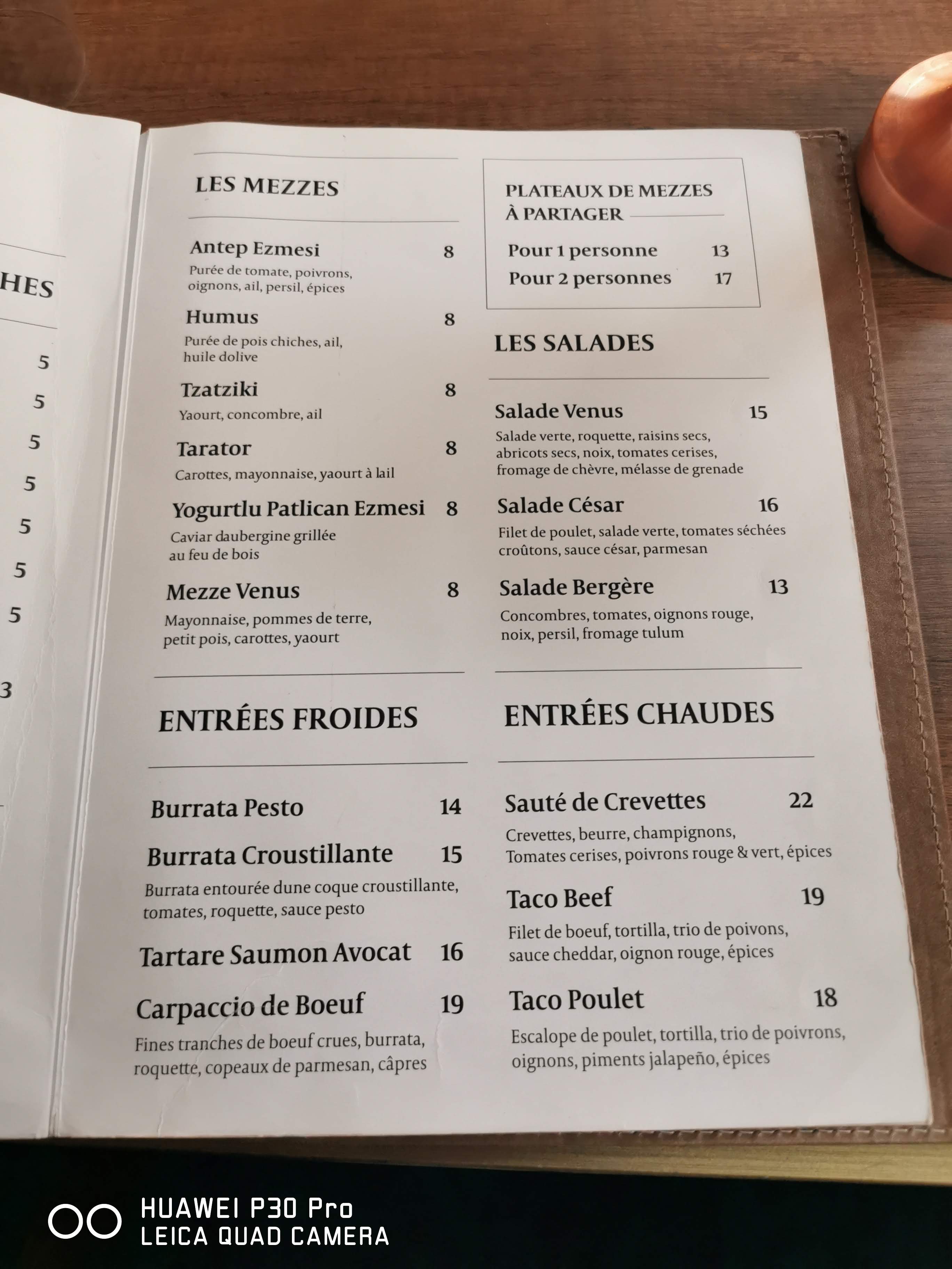 Nous sommes allé hier au Venus à l’occasion du nouvel an. Nous avons commandé, puis savouré nos plats qui étaient excellents, j’ai pris le gourmet, une baklava et un cocktail nuit bleu. Jusqu’ici tout va bien .. en fin de soirée d’énormes maux de ventre me prennent, ce qui gâche ma soirée. Je rentre chez moi avec des nausées, je me sentais vraiment pas bien. Et le lendemain encore. Je pense que cela est dû à la viande qui parfois n’est pas bien cuite, je fait référence au steak au fromage et à l’adana. Sans faire de diffamation je ne sais pas si c’est l’hygiène ou la cuisson, car j’ai vu beaucoup d’avis négatifs là dessus et je ne suis pas la première.
