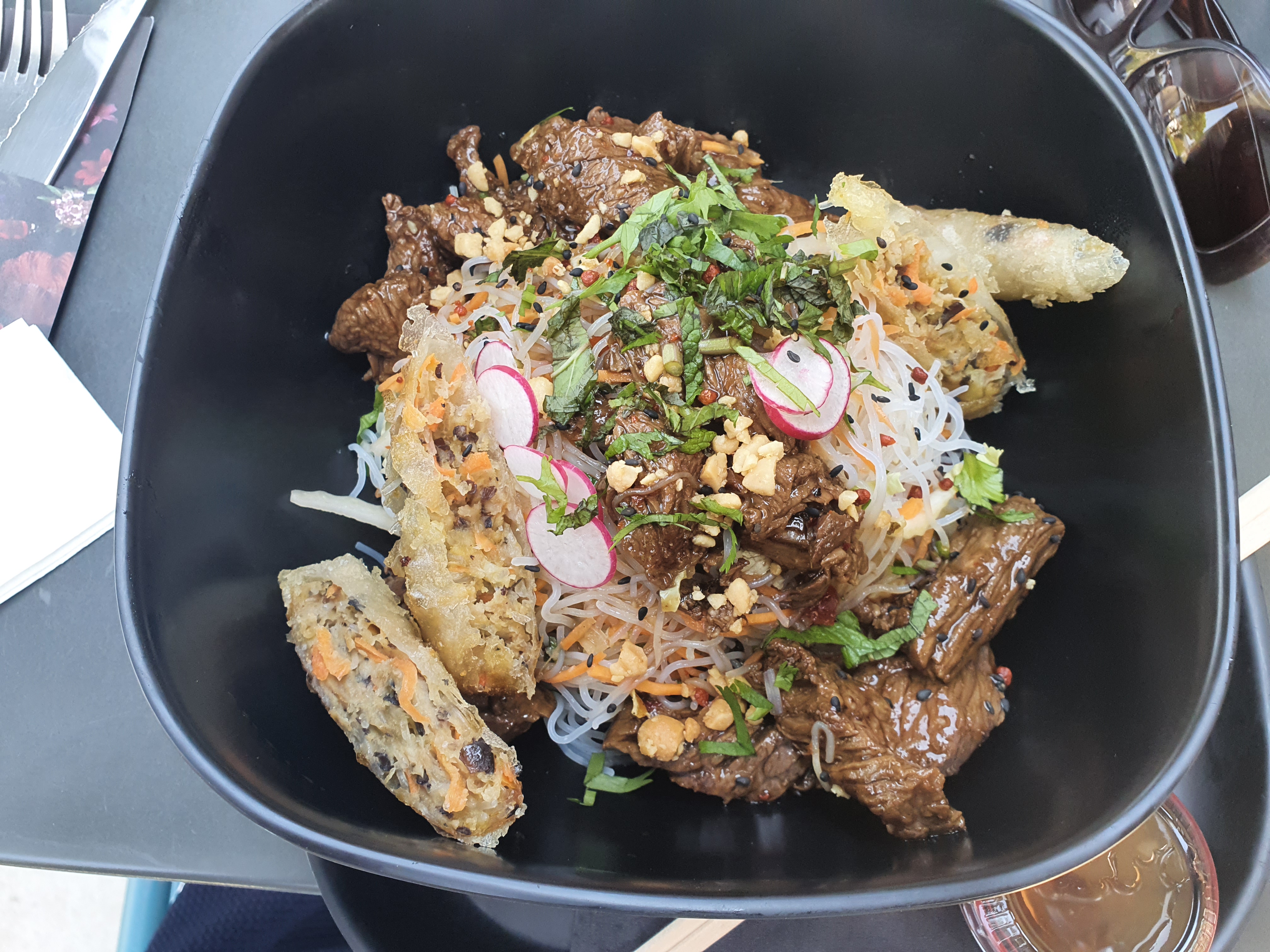 Un des meilleurs Bagel au saumon que j'ai mangé... il a même sûrement détrôné celui que j'ai mangé à New York ! J'ai aussi testé les noodles au poulet... un mélange de saveurs délicieux ! Service impeccable, personnel très accueillant et c'est appréciable ! Je reviendrai pour apprécier la vue le soir cette fois-ci 😊