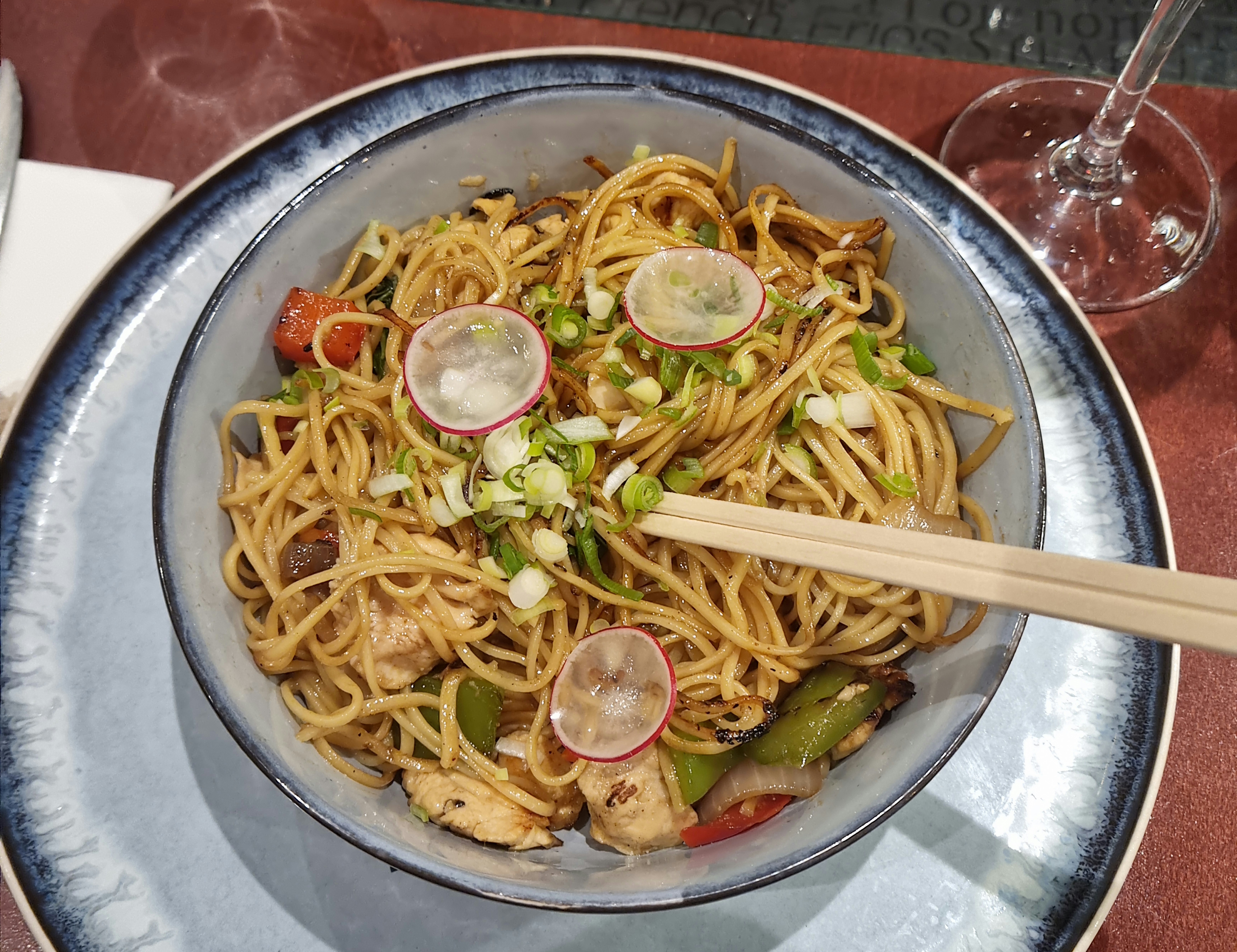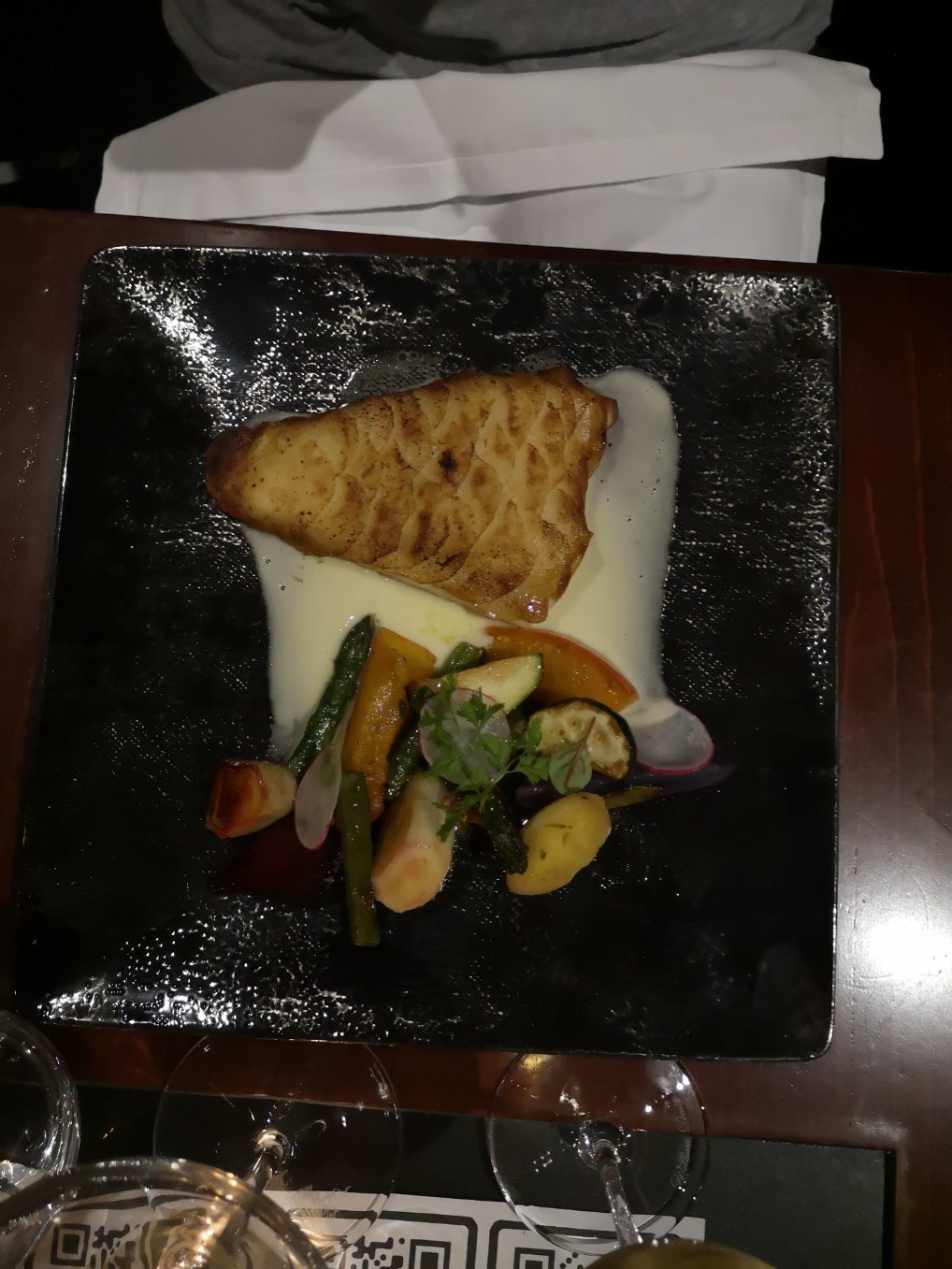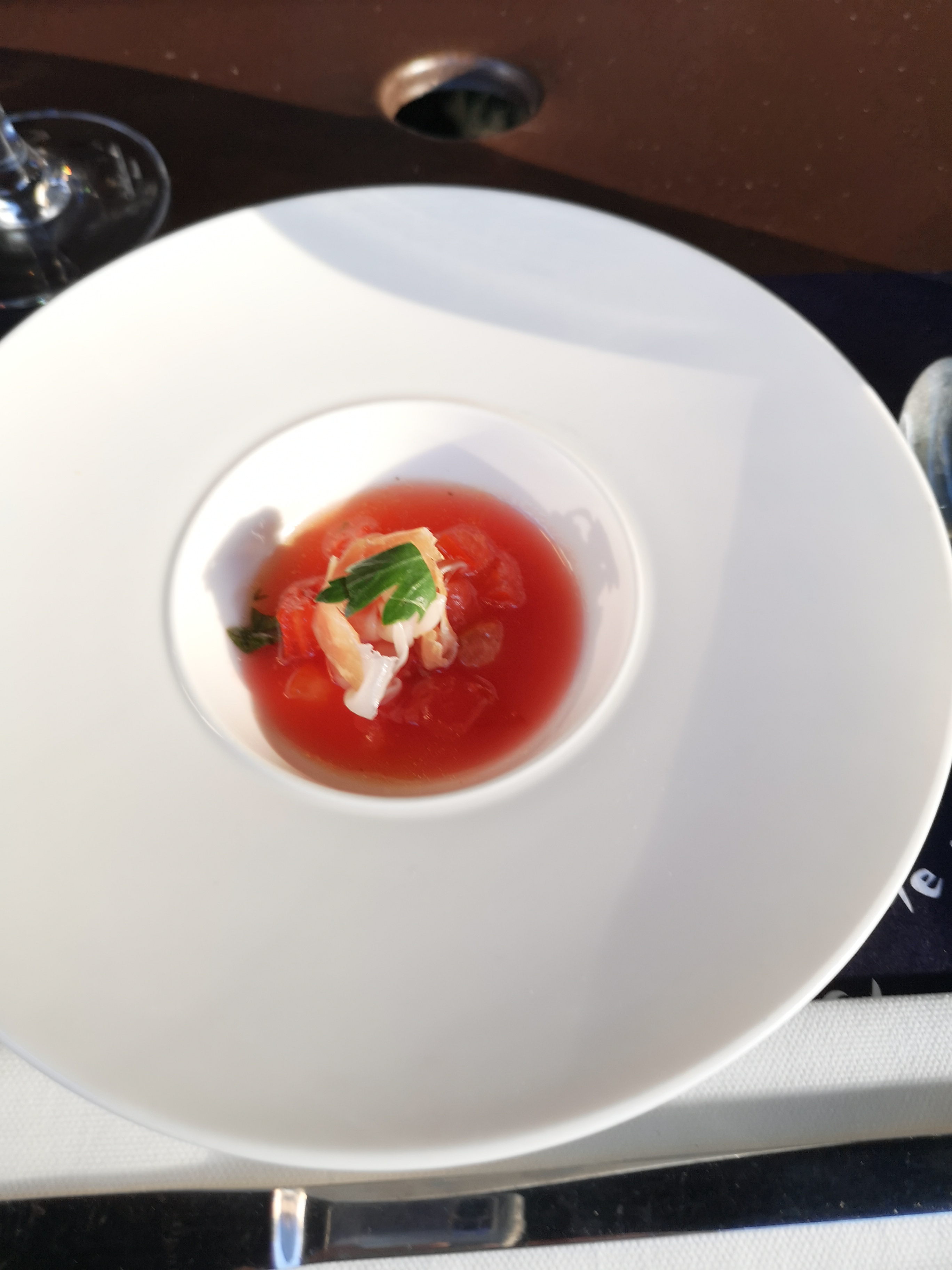Commencé avec la dégustation par le chef de carpaccio de thon, de rouleaux de printemps au poulet (apéritif de spécialité du chef), de crevettes aux herbes avec sel et poivre, de riz au jasmin, de peau sur un rouget poêlé ou de rouget au fenouil frais dans une réduction de chorizo. Ma femme a eu un délicieux Chablis et j'ai eu un fantastique Champagne Grande Cru. Terminer par une glace au sabayon et au champagne avec des myrtilles fraîches, des fraises, des airelles et des framboises. Nikolai est un excellent serveur !