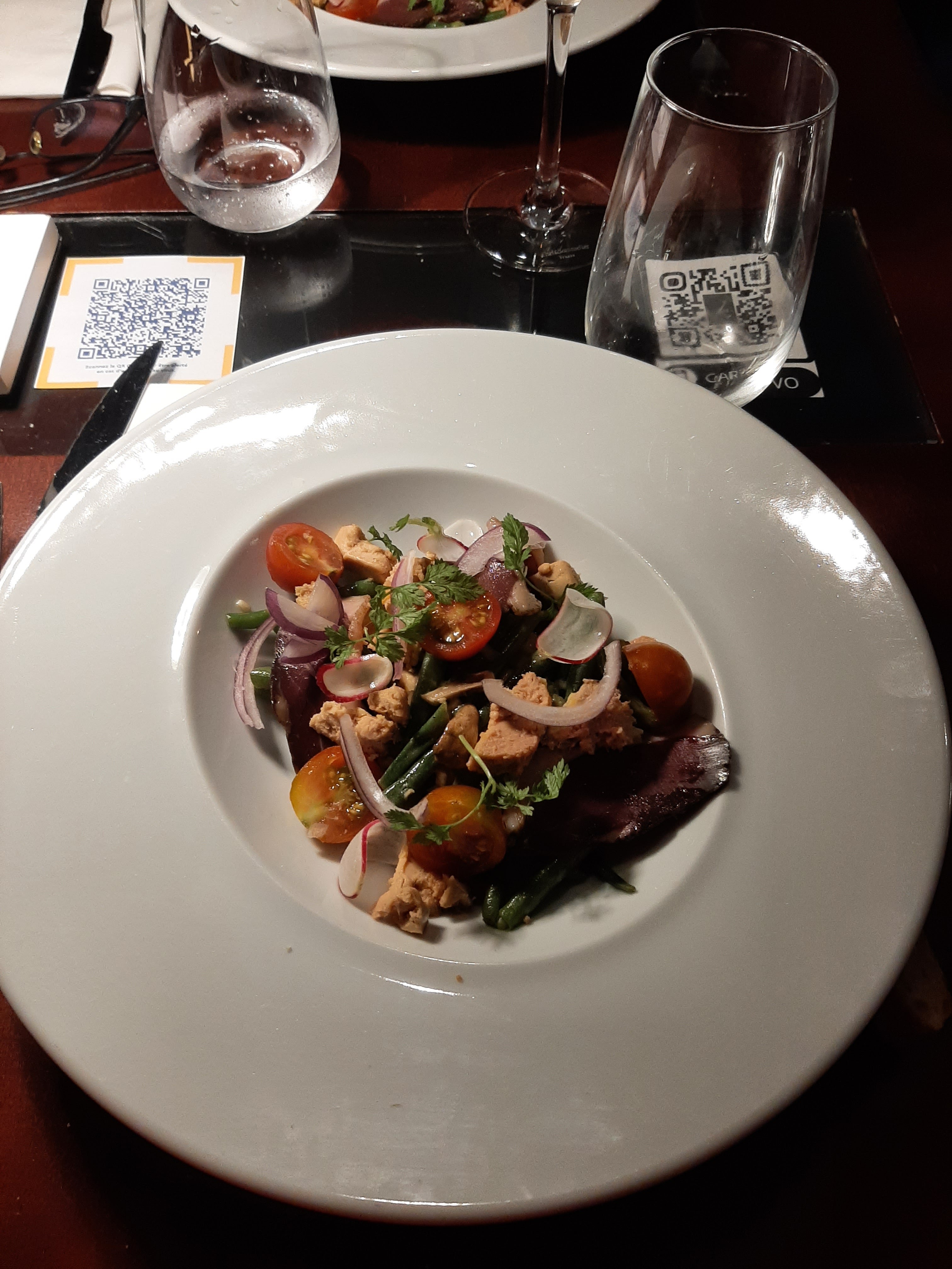 Sur le papier, ça avait l'air d'être top. Pis je ne sais pas ce qui ma déçu...y paraît que les plats respectaient les produits de saison. Donc le dessert : framboises/cassis en ingrédients ?? Bon et efficace, mais que penser (produits surgelés???) Pour le reste au vue du prix...rien de wahou. Donc correct sans plus.