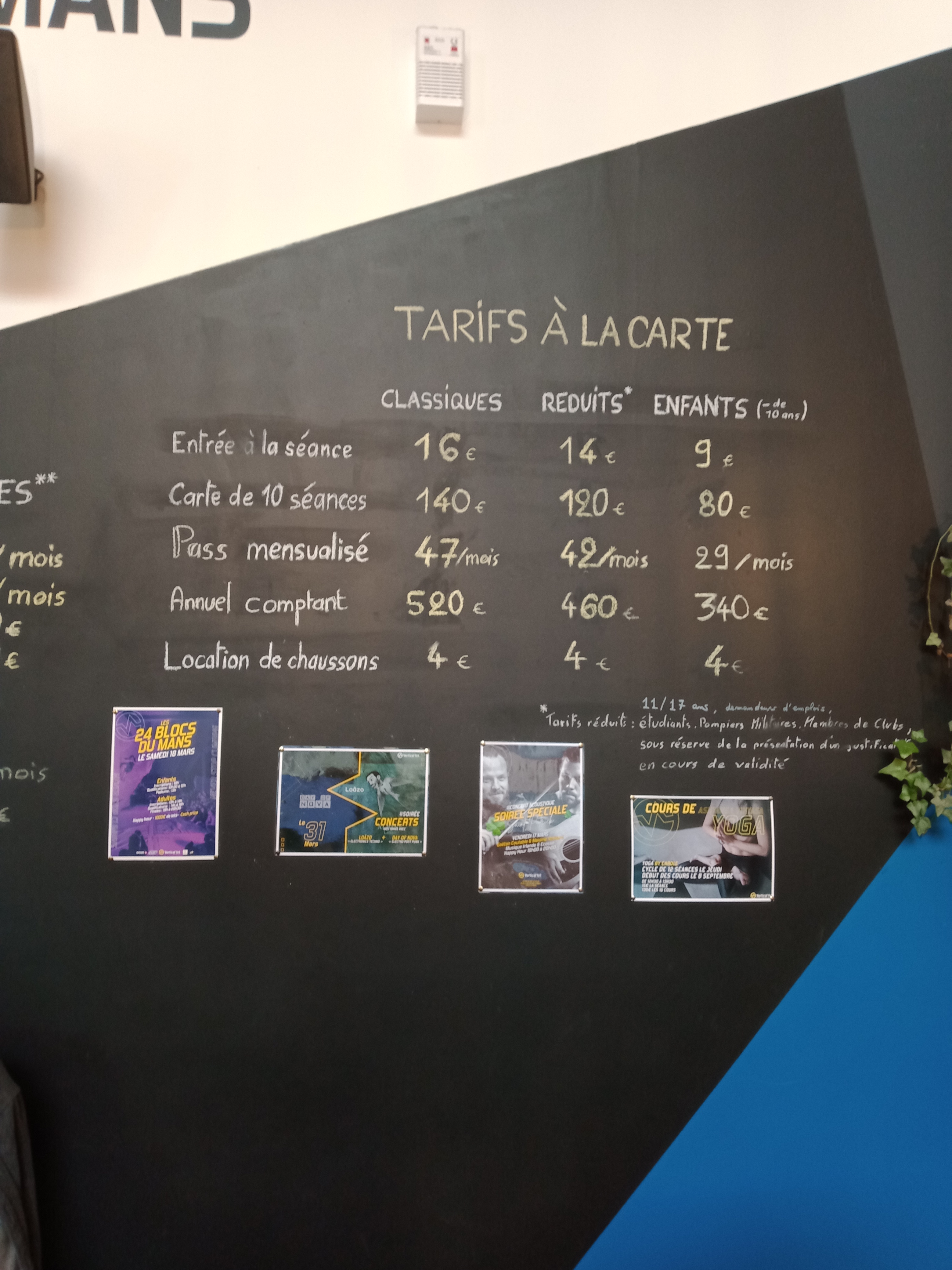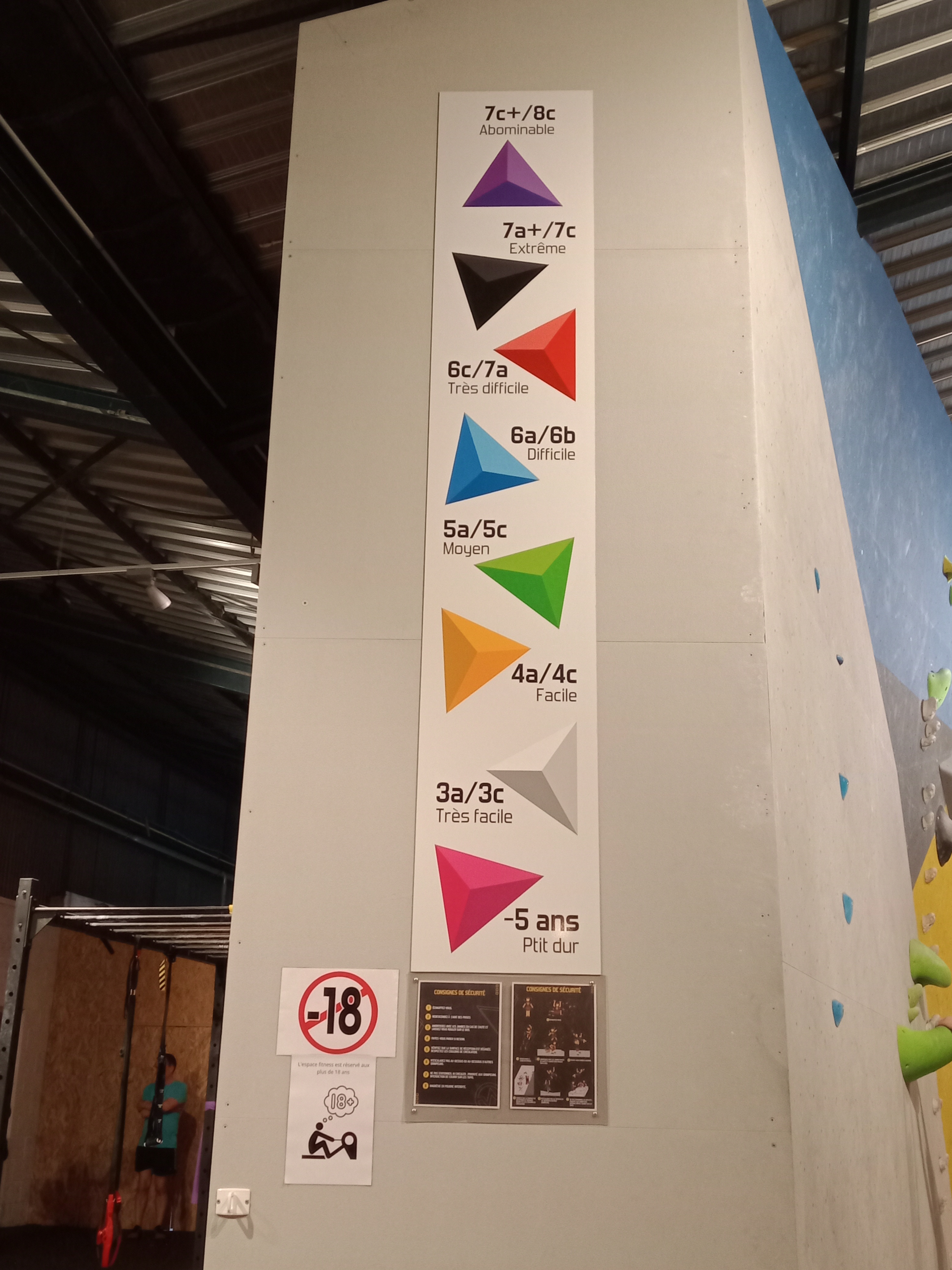 Prix légèrement élevé mais salle agréable avec des nombreuses voix. Mention pour la comparaison avec la classification international des difficultés des voies !