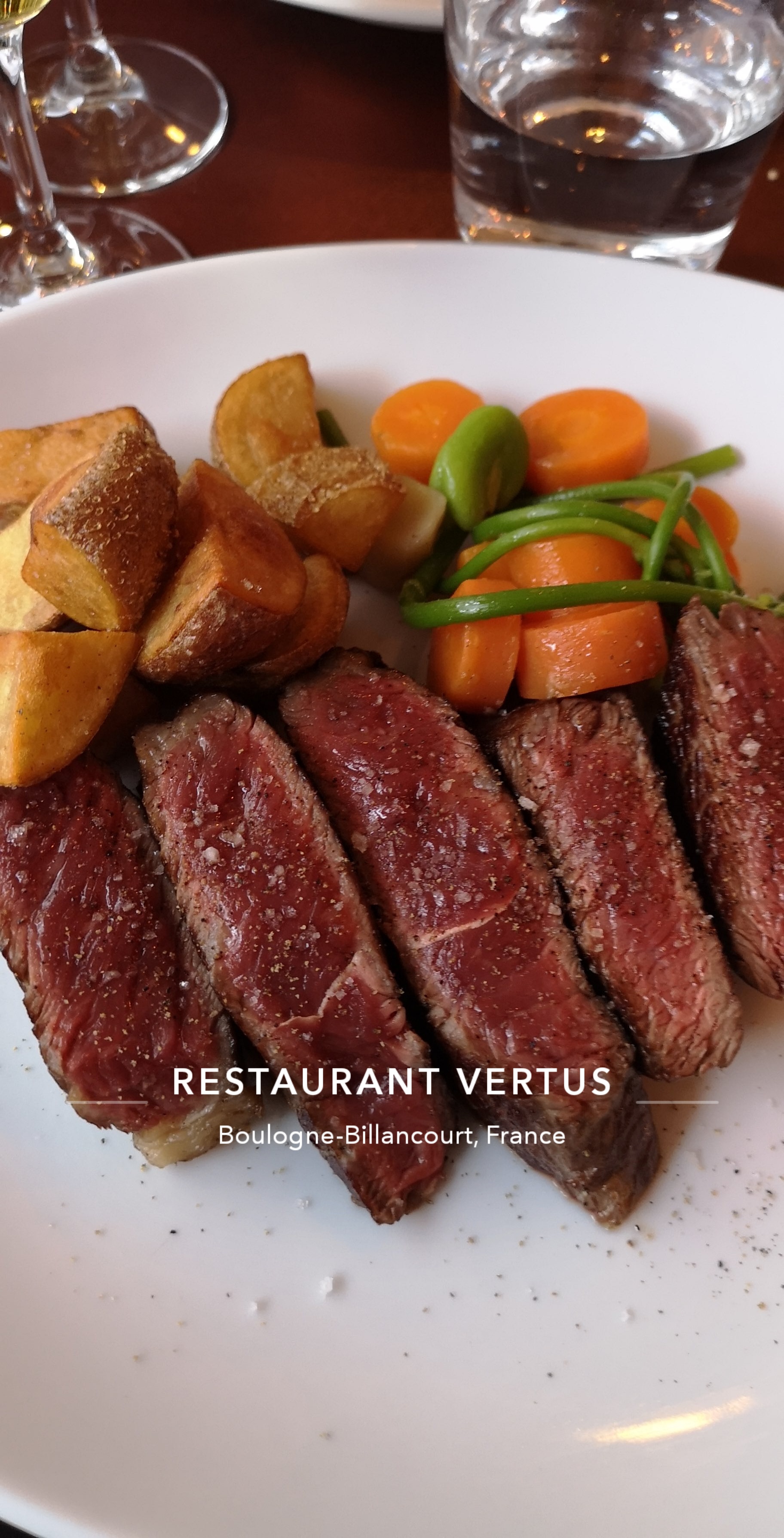 L'accueil est professionnel, à défaut d'être chaleureux. Coté plat, nous avons opté pour le boeuf de galice (1kg pour 2) à 64€ / personne. La viande est tendre, bien présentée et la cuisson parfaite. Ceci dit, la quantité n'y est pas (je doute des 1kg) comparé à d'autres restaurants pas très éloigné du Vertus, comme l'Ogre, et l'assaisonnement manque de caractère. En conclusion, belle adresse mais rapport qualité / prix à revoir.
