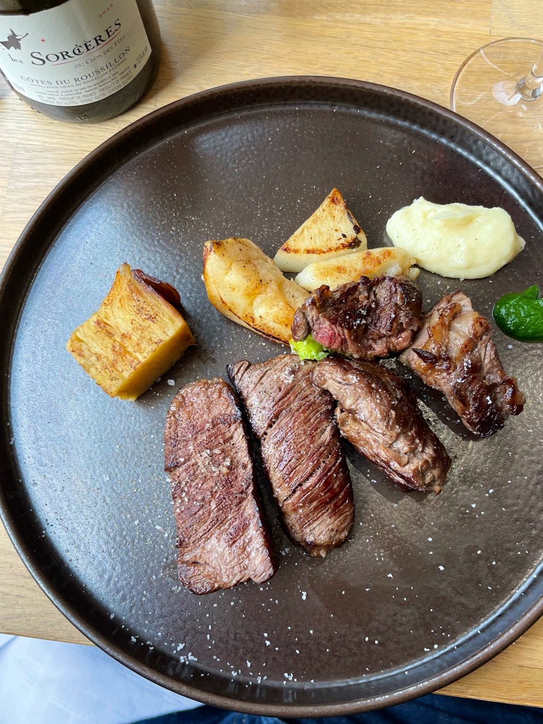 Une côte de bœuf de Galice, maturée 50 jours : un régal! Accompagnée d'une bouteille des Sorcières (Languedoc-Roussillon) à prix sage et formant un parfait accord. Une carte des vins qui donne le tournis, mais pas assez de bouteilles accessibles toutefois. Les légumes, sont simples et très bien cuits : ils mériteraient peut être une découpe et une présentation plus... fantaisiste ? (carottes). Bravo á ce duo : Rei le sommelier, adorable et expert et à Mitsuru, le chef, qui vient tailler la bavette en fin de repas 😜. A noter : l'amuse bouche gaspacho et aussi, en fromage, un pont l'évêque affiné de la meilleure manière. Meme l'expresso est délicieux... Un décor simple et zen + des mets, de grande qualité bien cuisinés = Bref, le combo parfait. Je recommande vivement. Longue vie à ce restaurant !