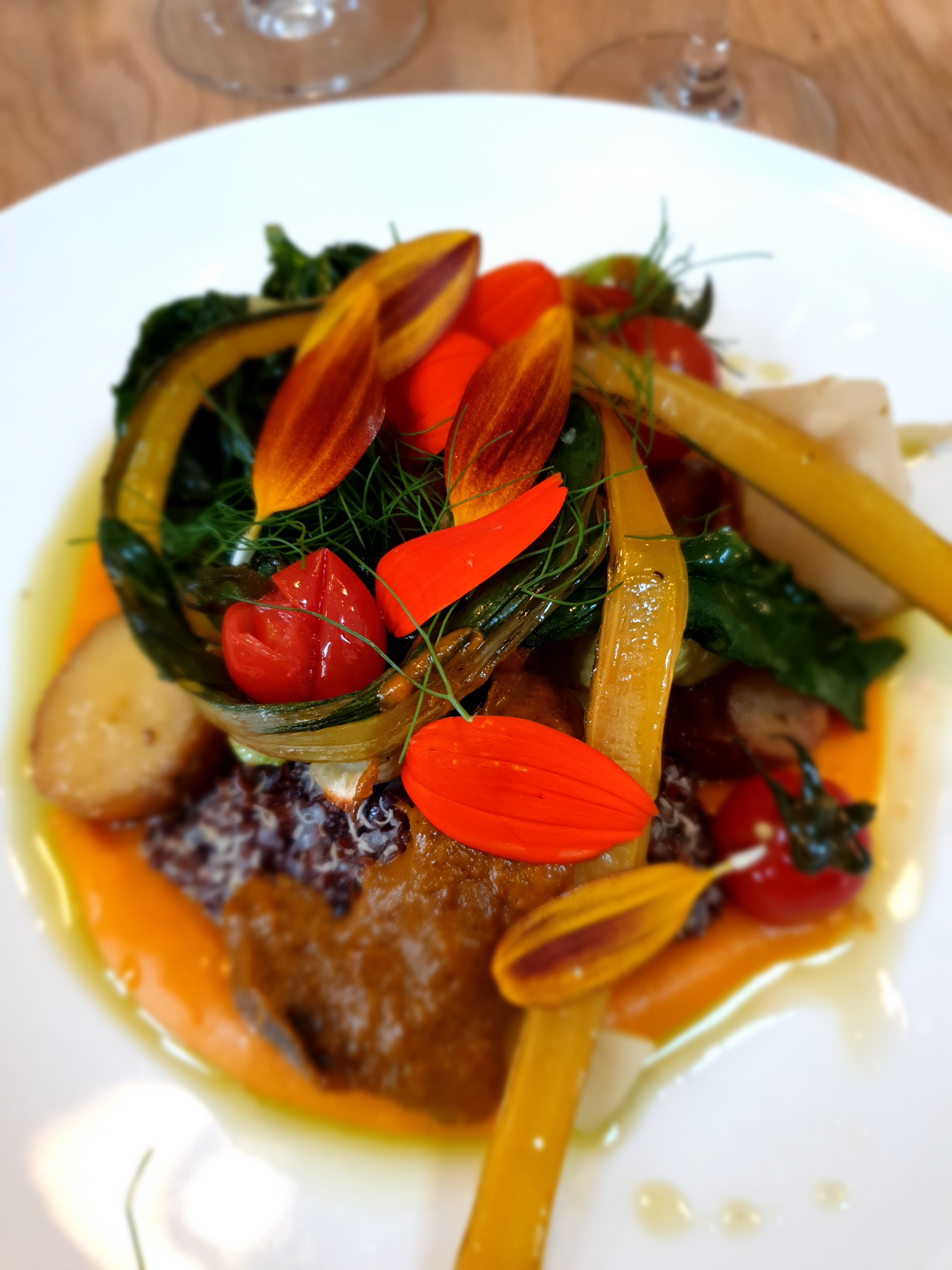 La majorité des restaurants traditionnels ne propose rien d'intéressant pour les adeptes de la cuisine végétale. Ici, le légume est choisi avec intelligence, combiné avec des fleurs, et dressé avec finesse. Les produits, locaux et de saison, sont travaillés avec justesse et maîtrise : c'est une cuisine du bon sens. La qualité se retrouve également dans le service, et pour finir le lieu est accueillant.