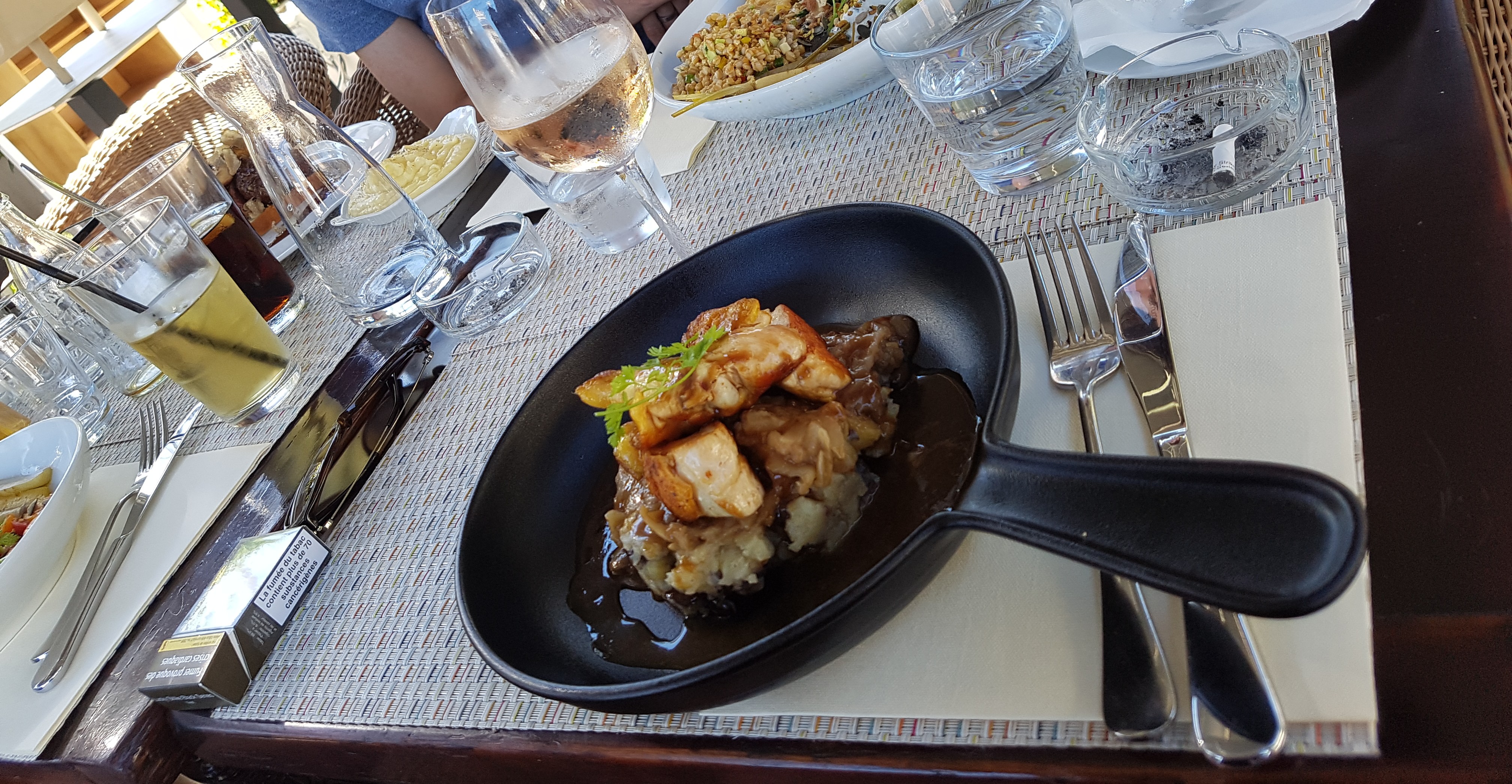 Tout ce que la Côte d’Azur a de mieux à vous offrir, des plats plats moyens et des accompagnements médiocres (pains « boule » surgelés digne du Flunch, ne parlons pas des frites surgelées, découpées avec soin puis vendues chez Métro), la viande n’est même pas locale (el famoso « Black Angus » qui fait rêver les touristes russes). Je vous conseille également le Rhum au Baba (et non l’inverse) et sa Panacota alla Gélatine (très répandue dans les restaurants d’autoroute). La vue ! Exceptionnelle sur les Yachts, ou sur les paravents en métal derrière vous. Un bonheur !