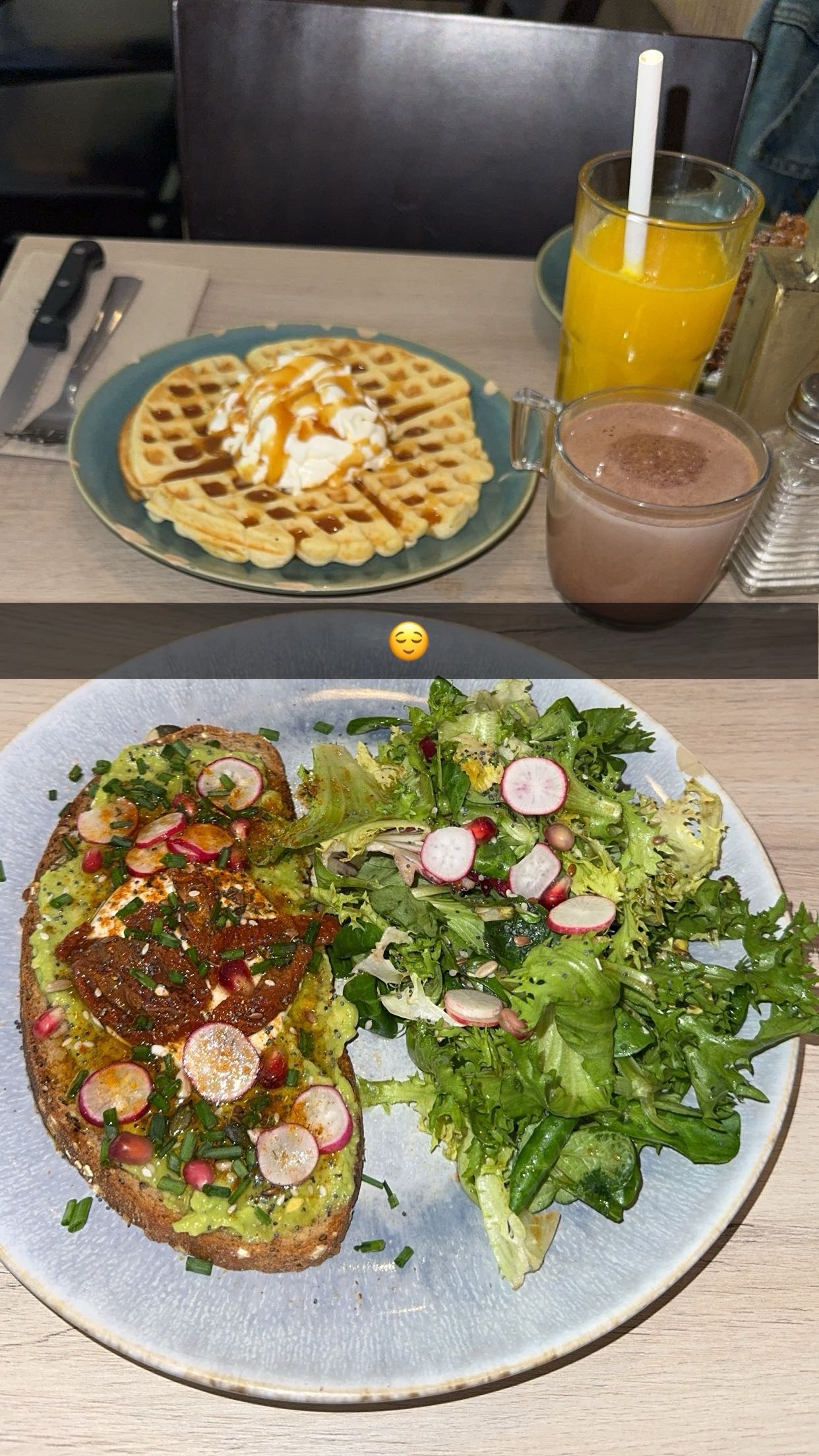 Le service et l’ambiance étaient cools, mais la nourriture sans plus. La burrata n’avait pas de goût, la gaufre œuf et sirop d’érable sympa mais sans plus, le pain perdu manquait de goût aussi. Pas d’alternative au lait de vache, dommage. Heureusement que l’addition était à -50%. Nous reviendrons peut être pour tester d’autres plats mais pas en priorité.