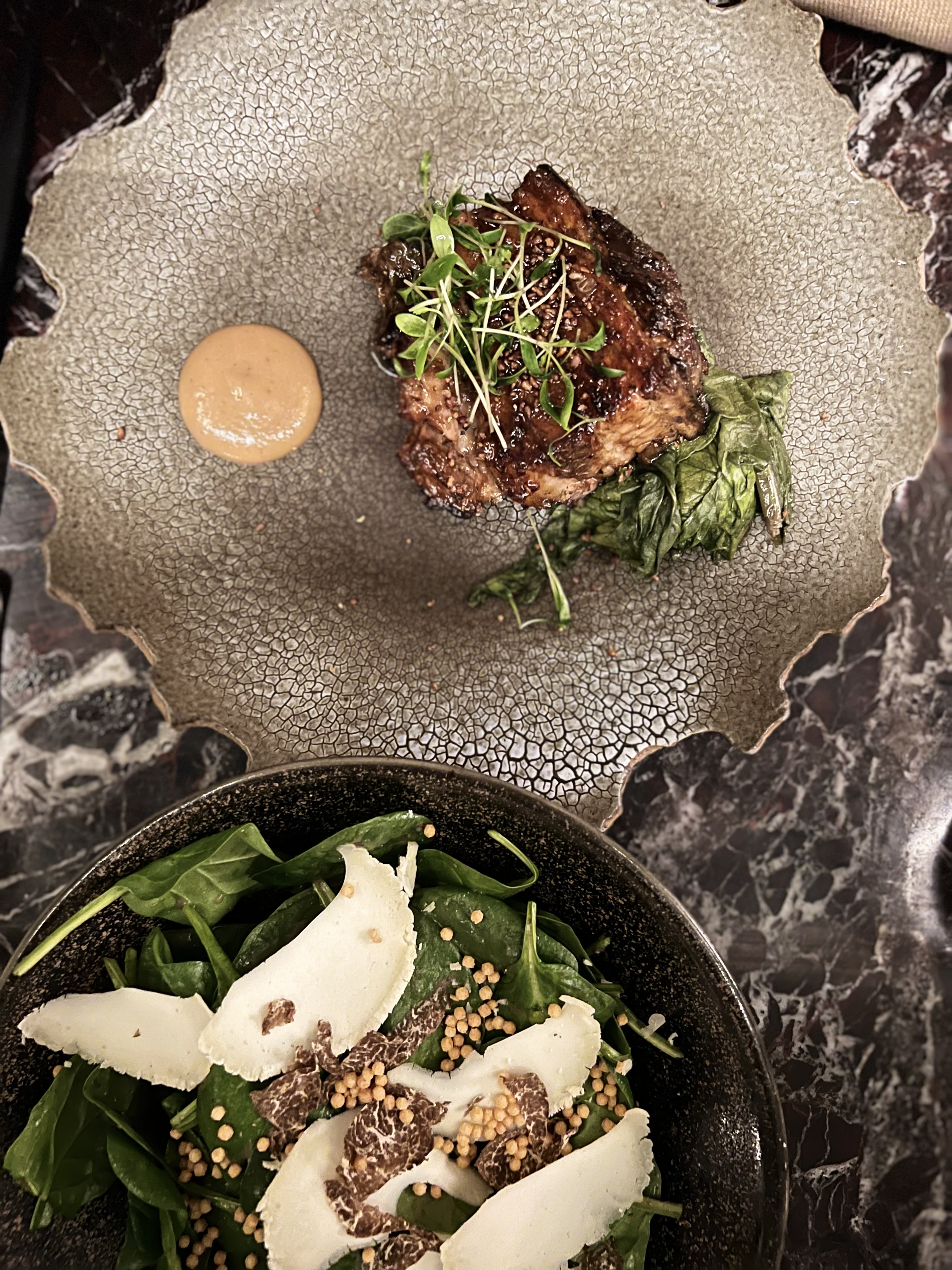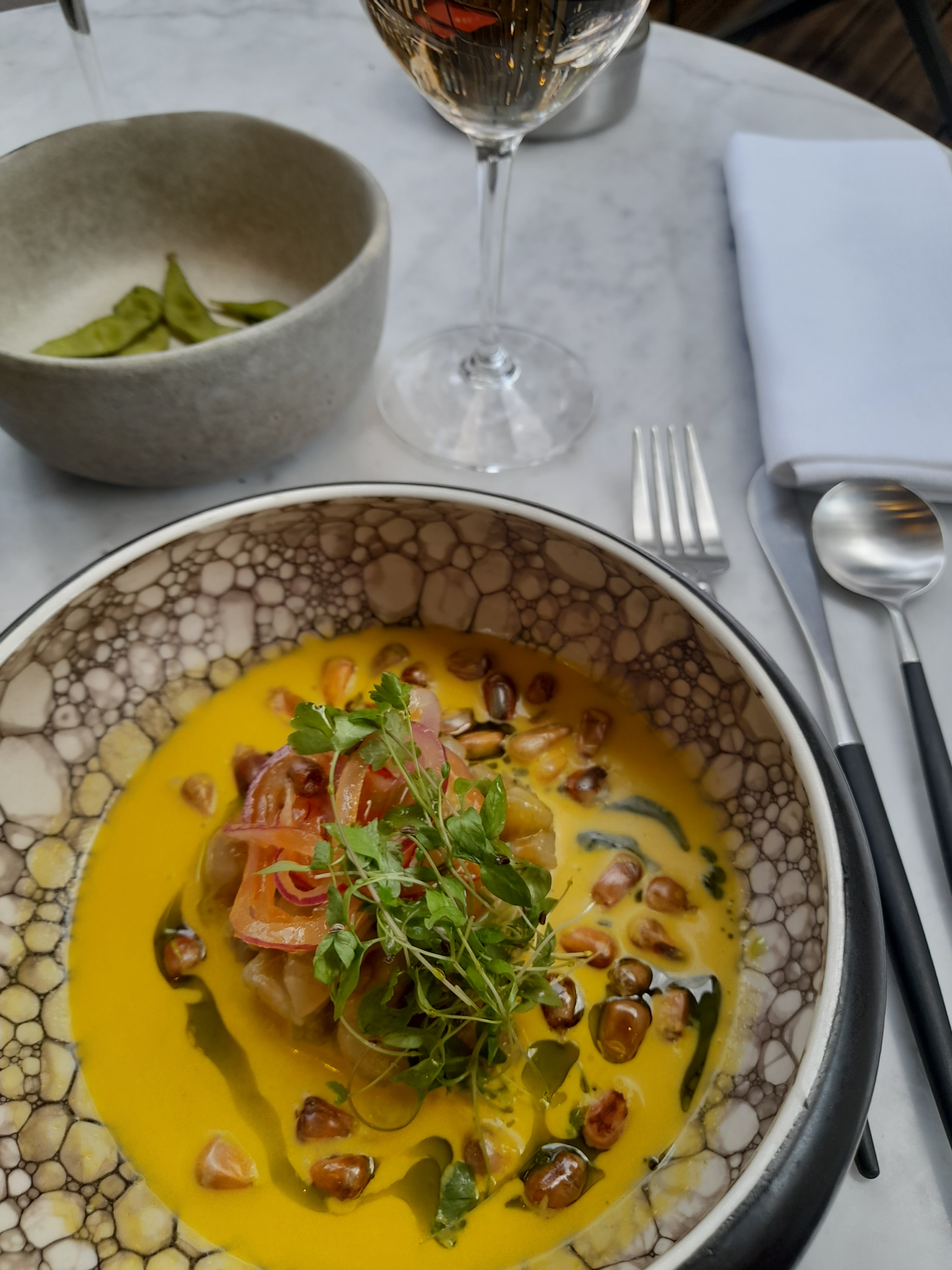 Un lieu spacieux avec une bonne ambiance. Le service est agréable, les recettes sont recherchées. J’ai bien aimé le ceviche de rascasse mariné. Par contre un peu moins le thon matcha, algue et cerise. Je trouvais que je ne sentais ni l’algue, ni le matcha, ni la cerise. L’ensalada de pousse d’epinard à la truffe d’été était formidable. La pomme de terre confite à la l’ail sans plus. L’aubergine au miso pas mal. Je recommande.