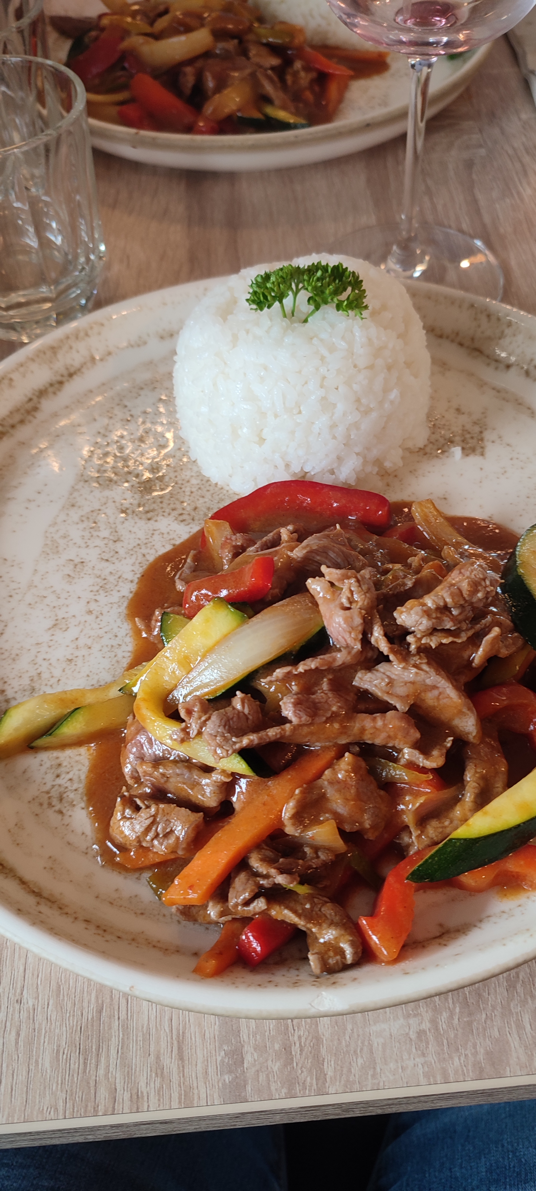 Redécouverte de ce restaurant. Il y a quelques années il s agissait d un buffet à volonté. Surprise de découvrir ce soir un vrai restaurant à la décoration loin du kitsch asiatique! Style. Cosy et class. Les plats sont copieux et top bons! Pour ma part un porc caramel succulent. Une mention spéciale pour un service effectué par une demoiselle hyper professionnelle comme on en croise peu. Souriante, aimant son métier...cela se sent et cela se voit. Qu elle puisse encore rayonner longtemps. C est tellement rare un service dans un restaurant aussi joyeux!