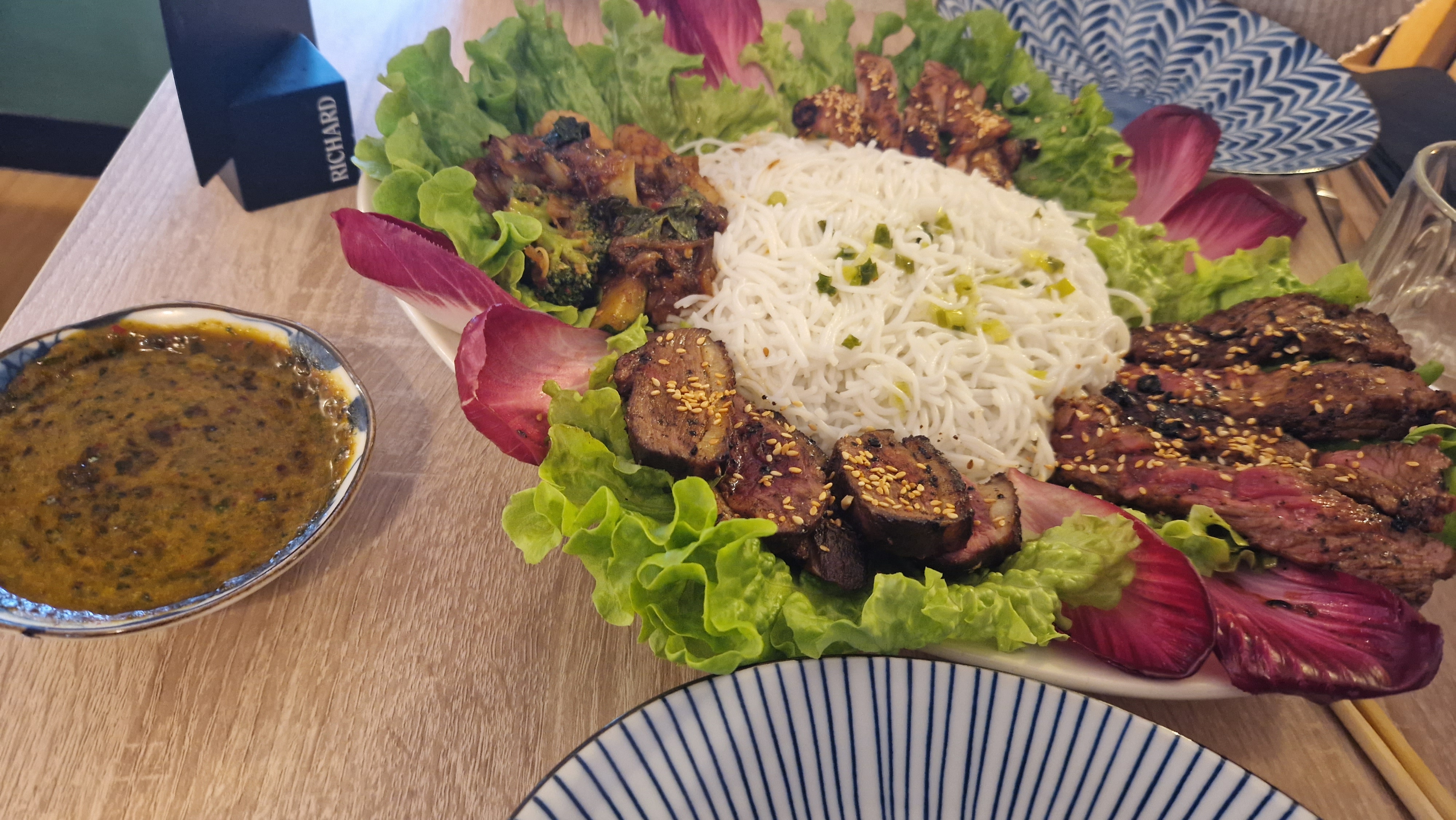 Je précise d'abord qu'il est très rare que je laisse un commentaire Google, mais quand j'estime que ça en vaut la peine voici ce que ça donne. Nous sommes venus en couple le samedi 26 mars, réservation en début d'après-midi pour le soir. Nous avions envie d'un restaurant asiatique surtout avec des choix japonais. Le personnel a été vraiment très serviable tout le long du repas. La serveuse que nous avons eu est adorable, nous avons rarement vu ça. C'était la première fois que nous testions ces plats, elle nous a très bien expliqué en quoi ils consistaient. Nous avons décidés de partager différents plats afin de pouvoir goûter à plusieurs choses. Des assiettes ont été mises à notre disposition pour que le partage soit plus faciles. Les plats étaient ... délicieux !! Nous avons découvert des saveurs, d'autant plus que c'était très copieux et nous sommes repartis avec une boîte pour emporter les restes. Les prix sont très abordables, surtout quand on voit la quantité qu'il y a dans l'assiette!! Le cadre et l'ambiance sont géniaux, nous n'avons absolument rien à redire. Nous sommes végétariens et nous avons trouvé qu'il y avait un très large choix de produits adaptés à notre alimentation. Nous vous conseillons d'ailleurs le plat de nouilles aux légumes : UNE TUERIE !! Et les cocktails sans alcool sont délicieux également. Nous reviendrons lorsque nous serons dans le coin c'est certain!! PS: excellent choix de musiques, il s'agissait d'une playlist de musiques d'aujourd'hui à la mode mais en version calme ce qui fait que nous n'avons pas été fatigué par le son qui était au contraire très relaxant et agréable. Merci encore à toute l'équipe pour votre super travail !!! Et à bientôt ;)