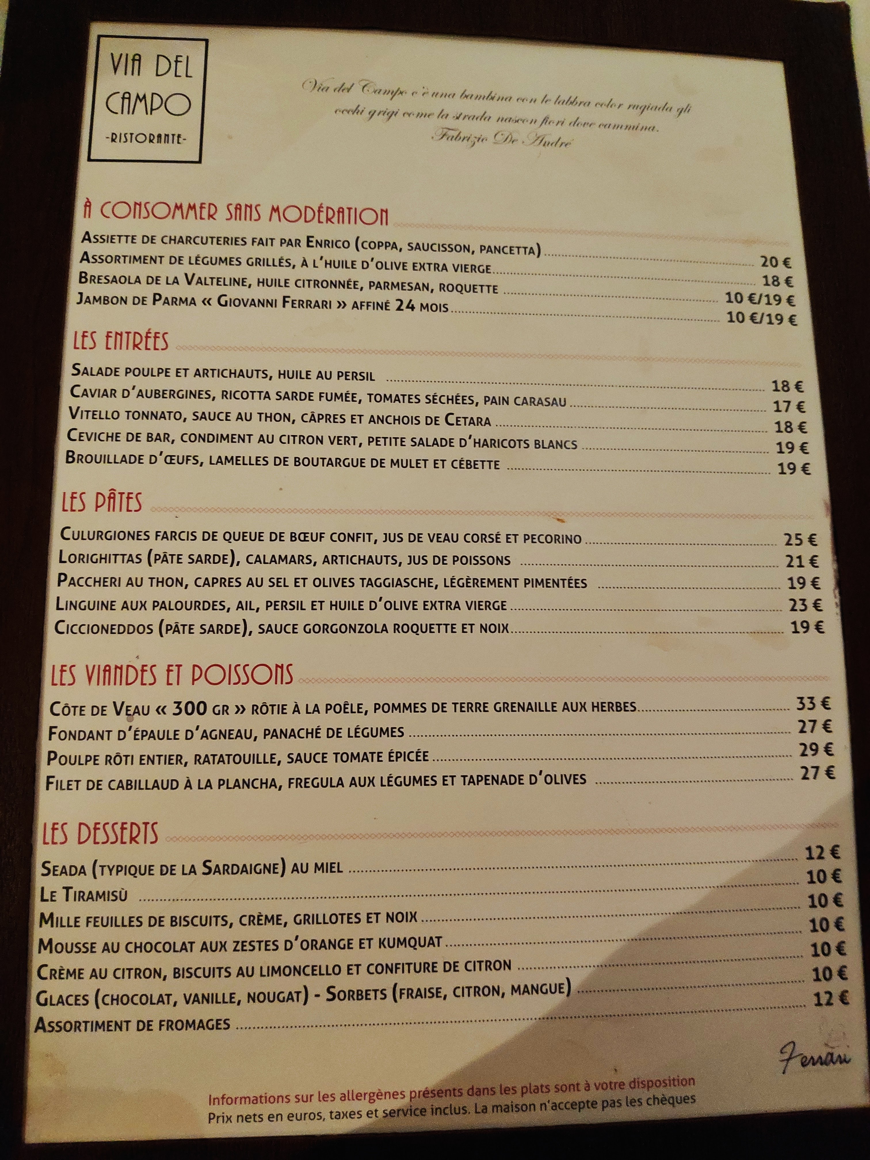Accueil chalereux, cuisine sarde raffinée et excellente, les vins au verre très bien conseillés pour accompagner les plats. Je recommande très bonne table