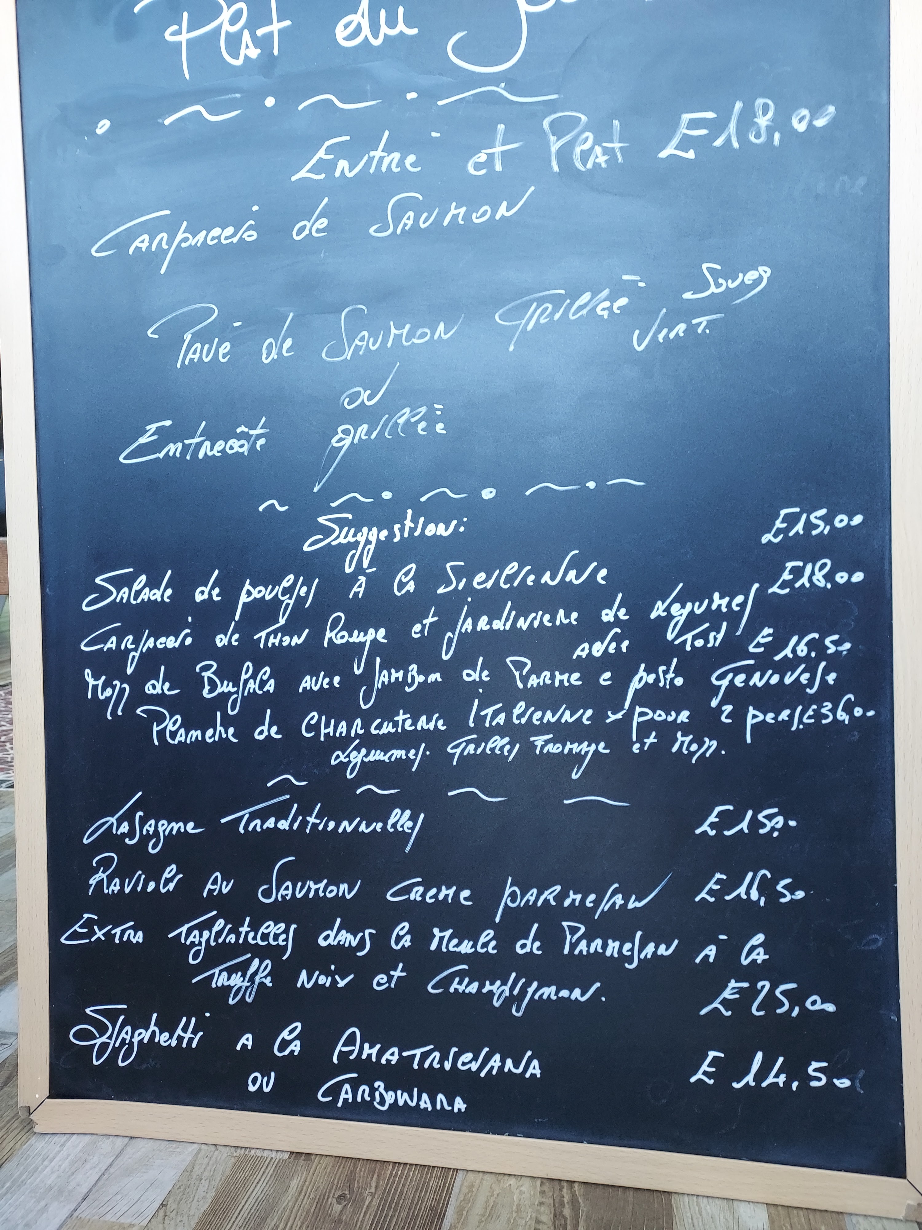 Tagliatelles de bœuf qui n’était pas en tagliatelle, la sauce fade, et les pattes quelconques 25€. Le risotto de gambas et asperges, c’est du riz rond avec des bout d’asperges et des crevettes…23€ les pizza on l’air vraiment bonne c’est ce que je recommandes entre 13 et 15 euros. Vraiment déçus sur les plats à la cartes !