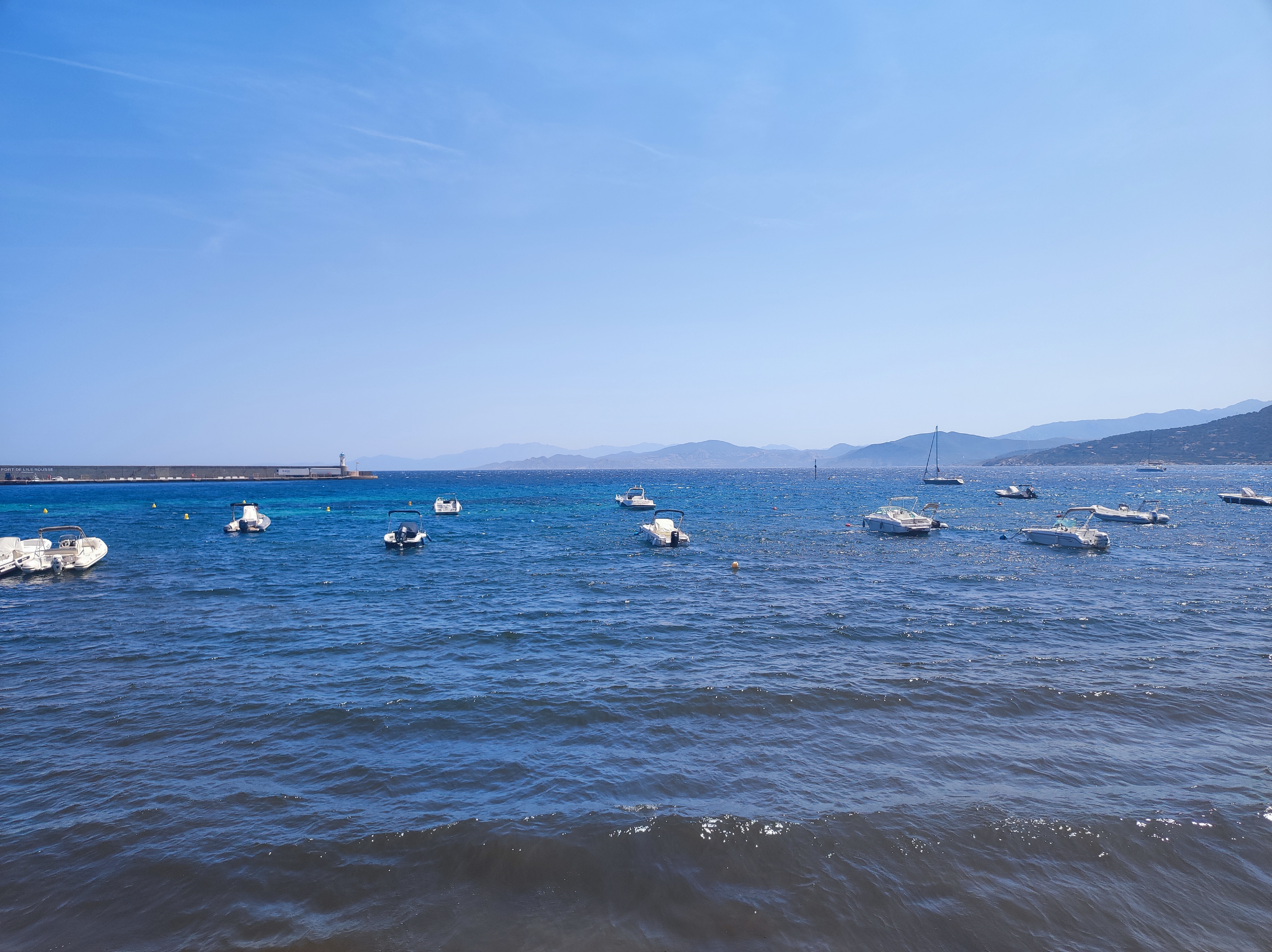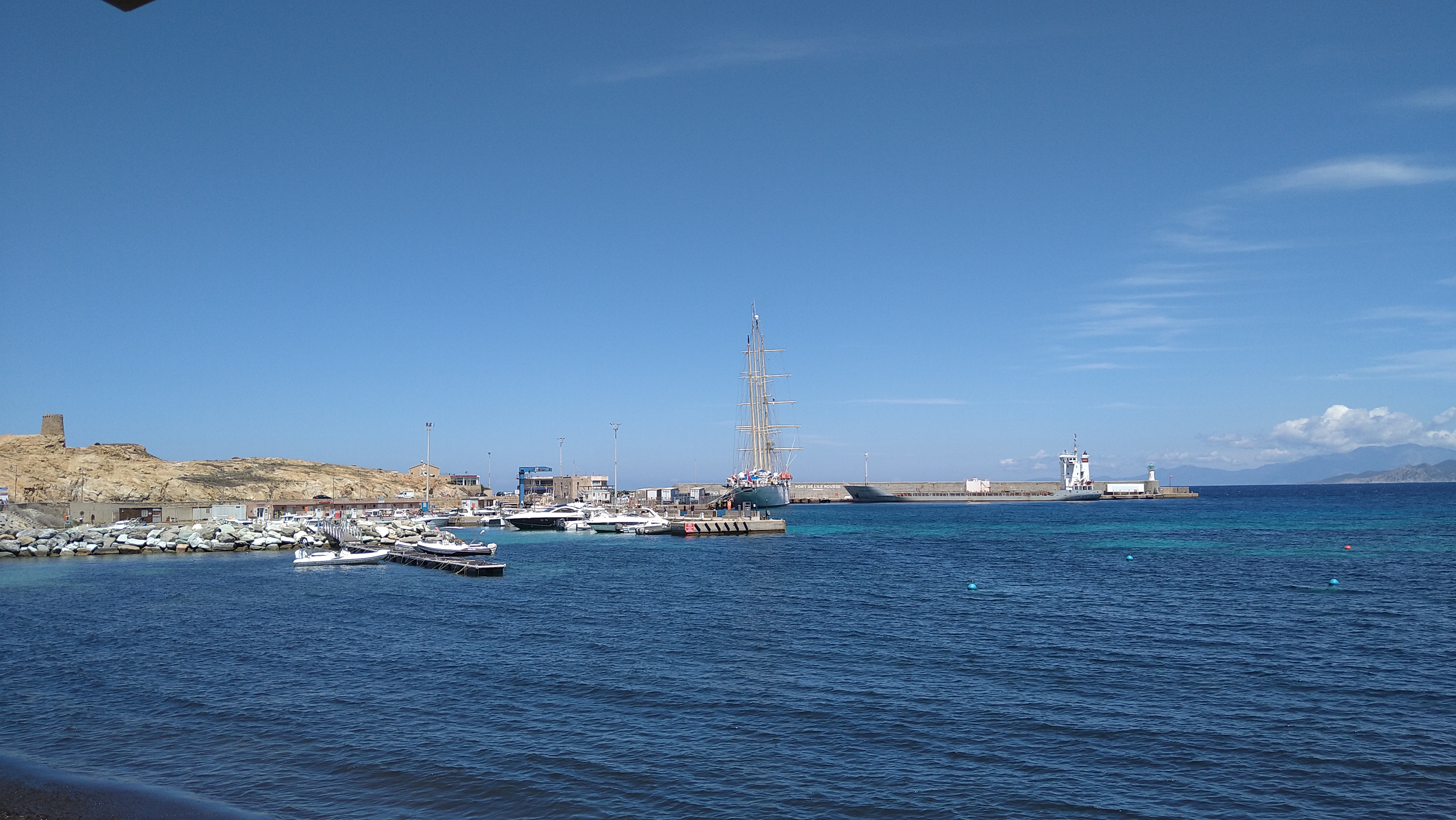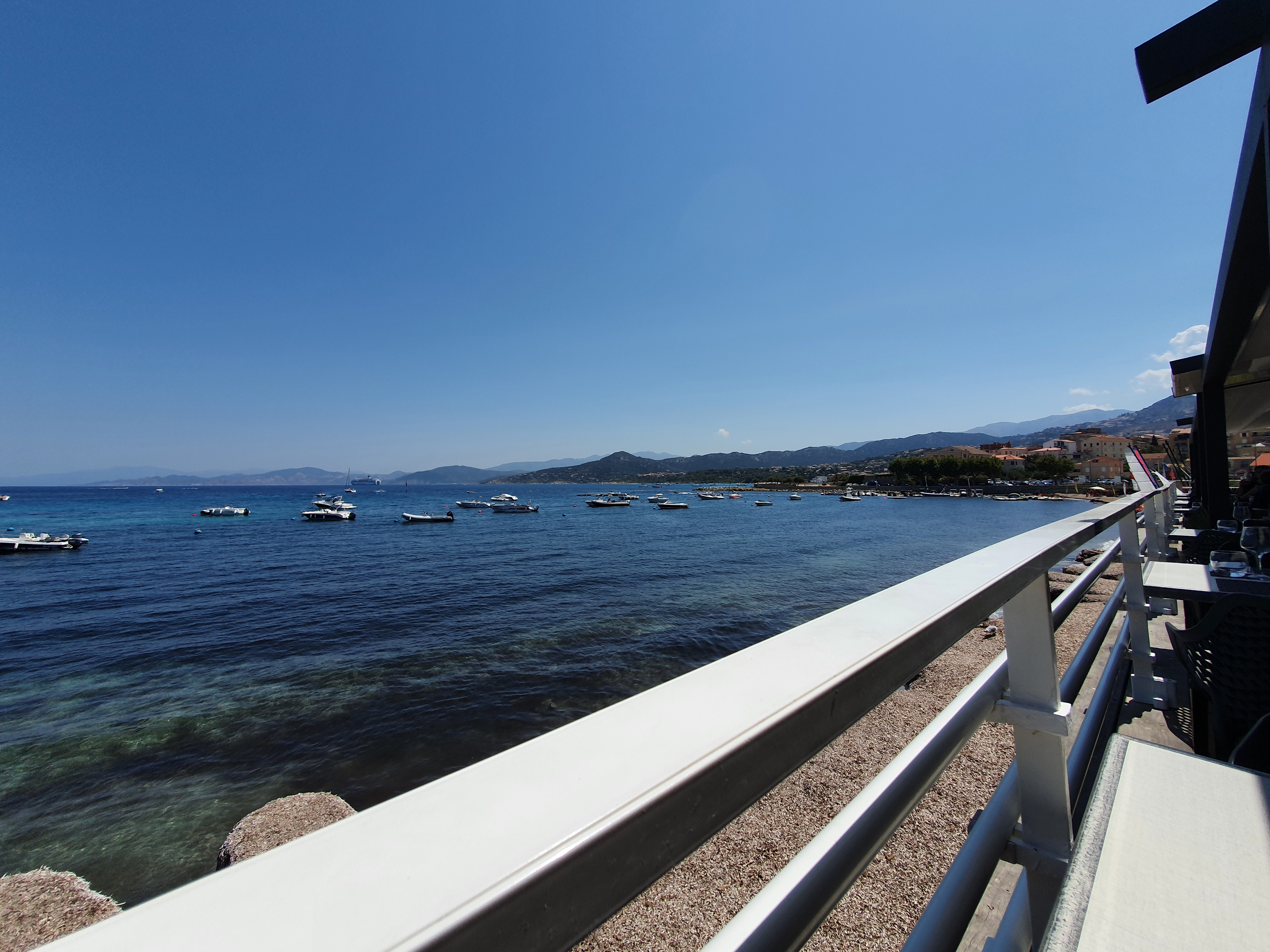 Petit déjeuner au bord de la mer, avec une belle vue dégagée sur la mer, le port de l'ile Rousse et la montagne en fond de paysage. Parfait pour attendre le bateau de la traversée vers le continent