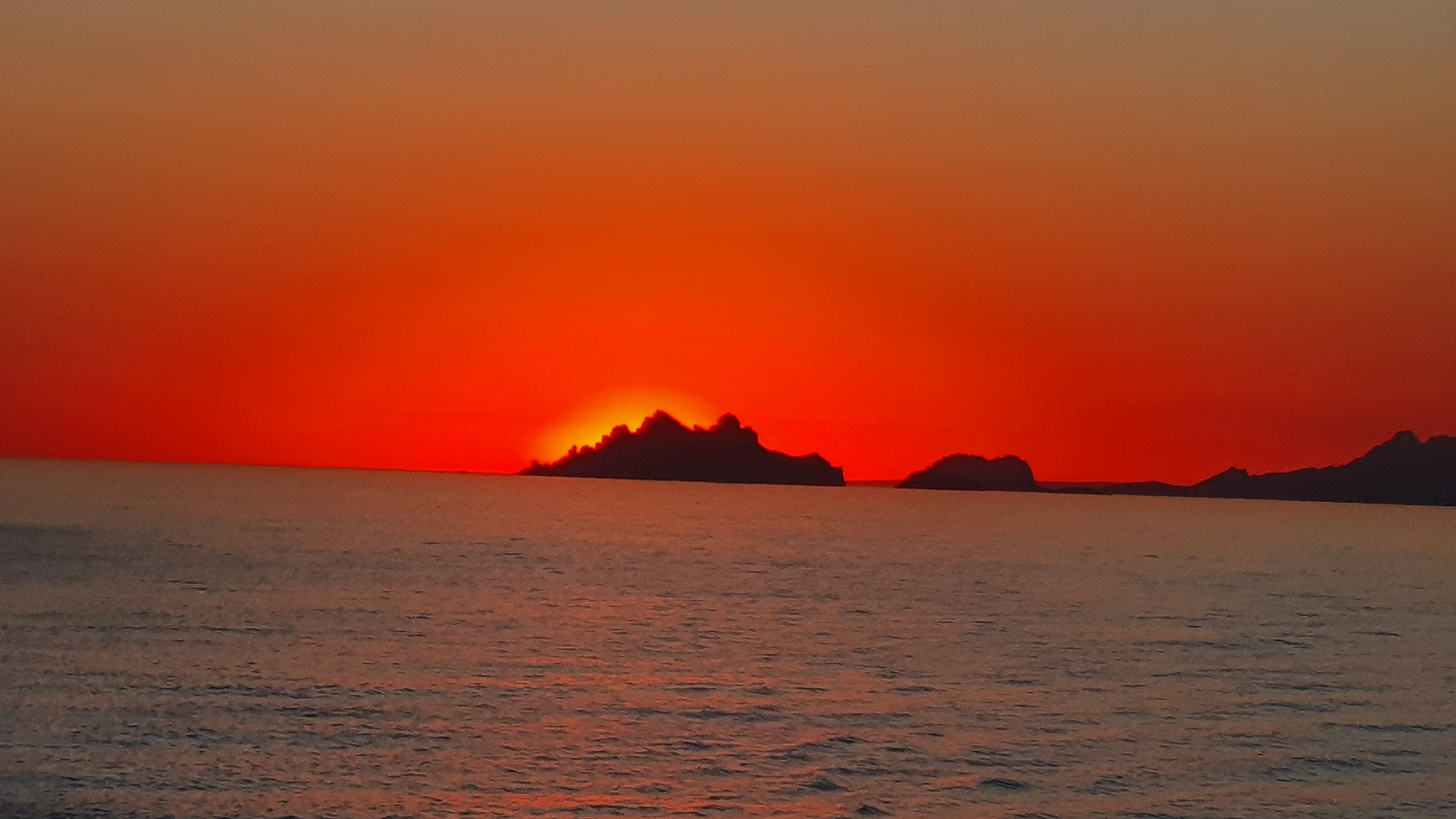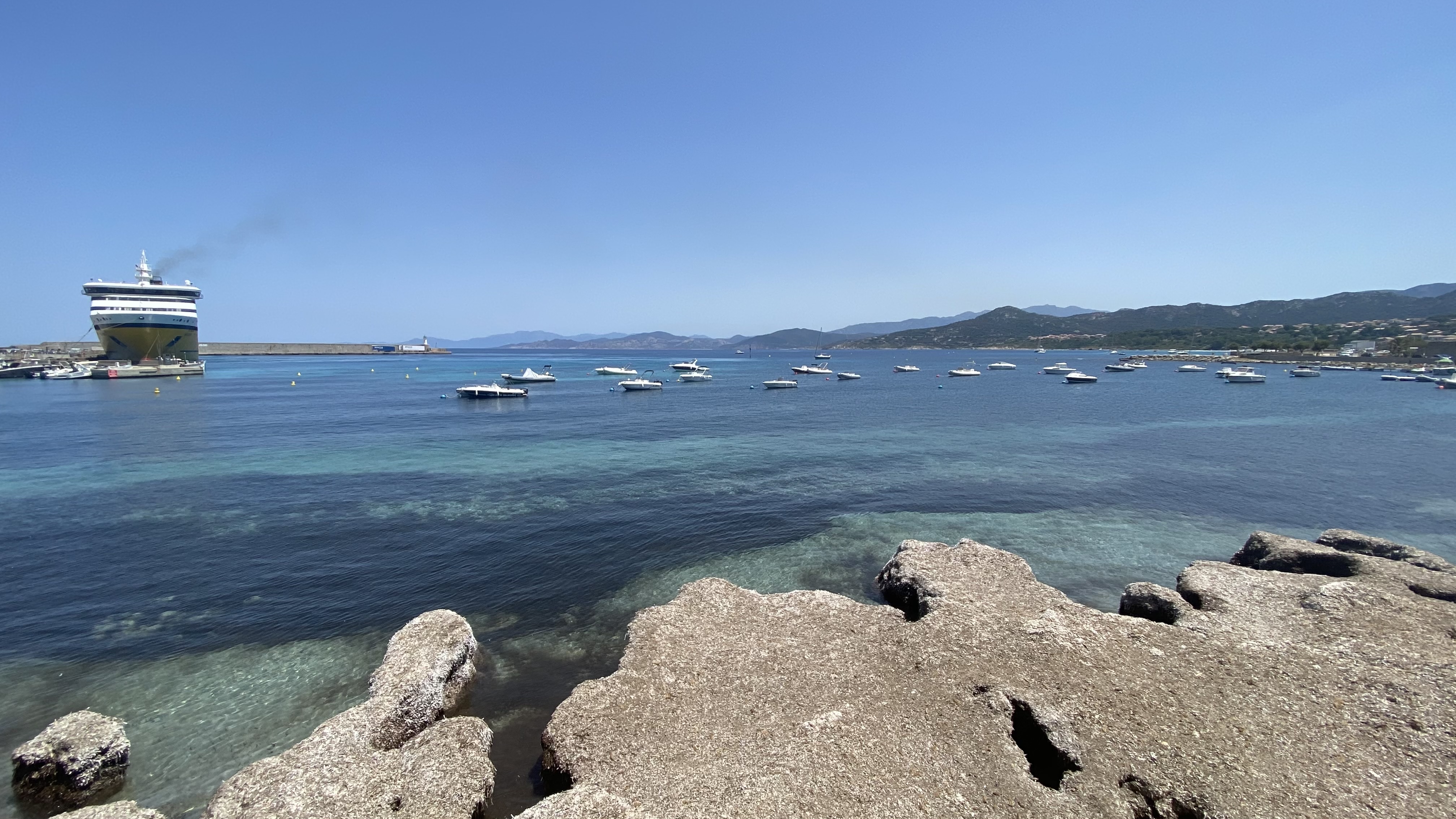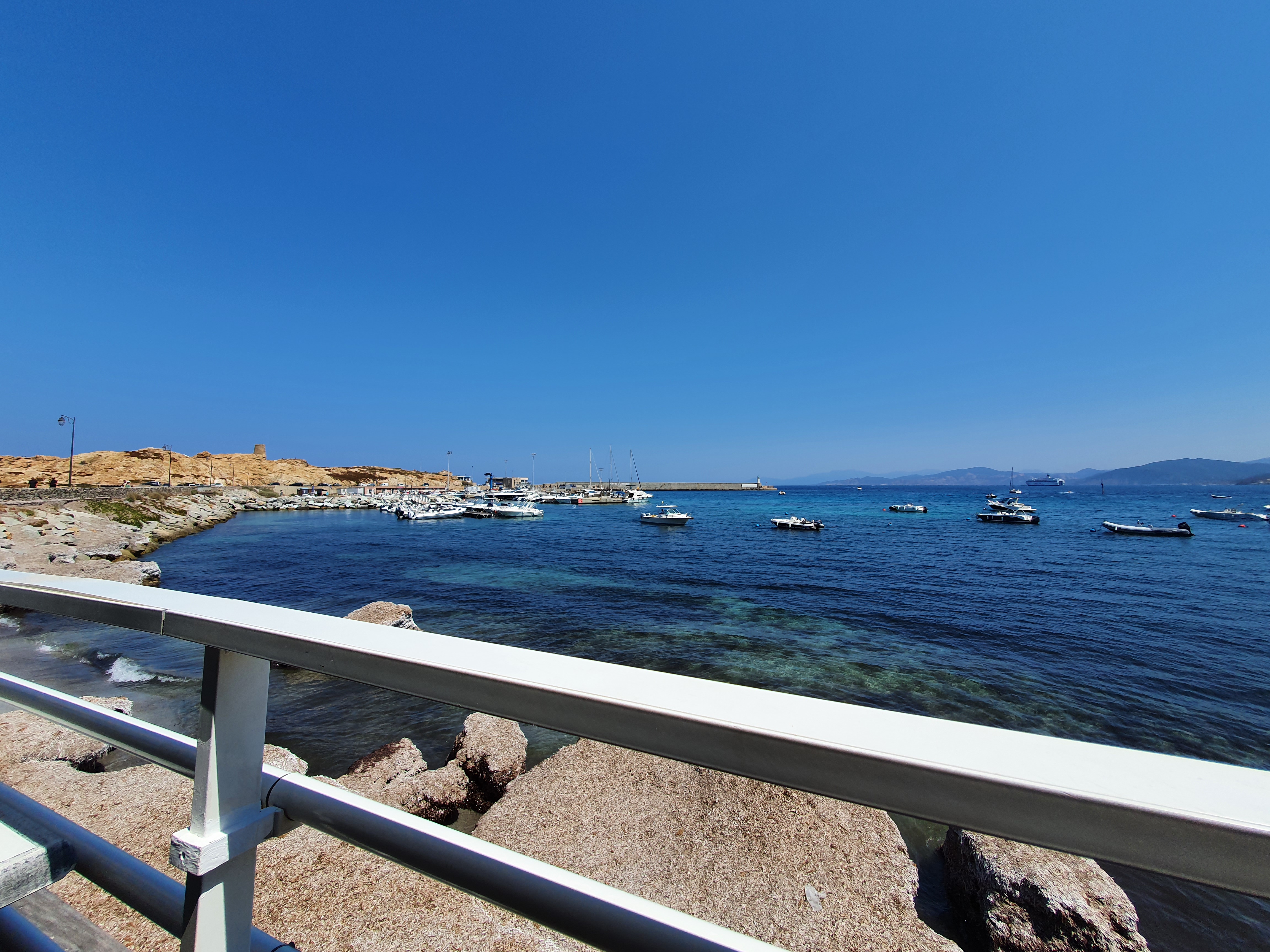 Petit déjeuner au bord de la mer, avec une belle vue dégagée sur la mer, le port de l'ile Rousse et la montagne en fond de paysage. Parfait pour attendre le bateau de la traversée vers le continent