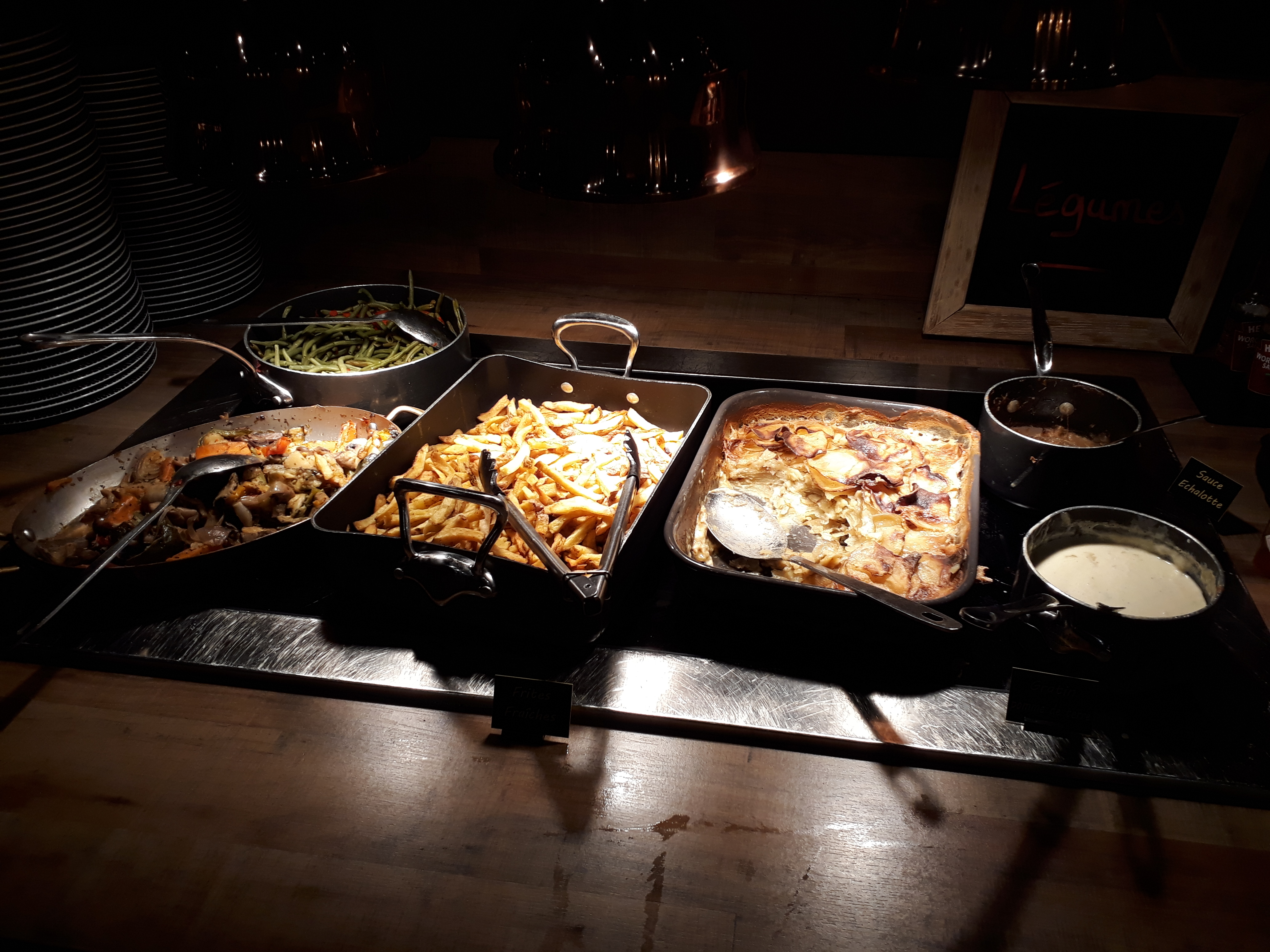 Plutôt pas mal dans l'ensemble. Personnel souriant, attentif et réactif. Buffet relativement bien garni. Nous avons particulièrement apprécié les cuisses de canard confites et l'agneau cuisson longue au thym, un pur délice ! Par contre, personnellement je n'ai pas trouvé terribles les pommes de terre roties, elles avaient un goût de rechauffé. L'avantage est de pouvoir prendre le vin au verre, ce qui permet d'accorder avec chaque plat goûté. Le prix est très correct : 19,80 € le week-end pour le buffet à volonté (entrée et plat) sans dessert. Ce n'est pas de la grande gastronomie, mais il y a de très bonnes choses.