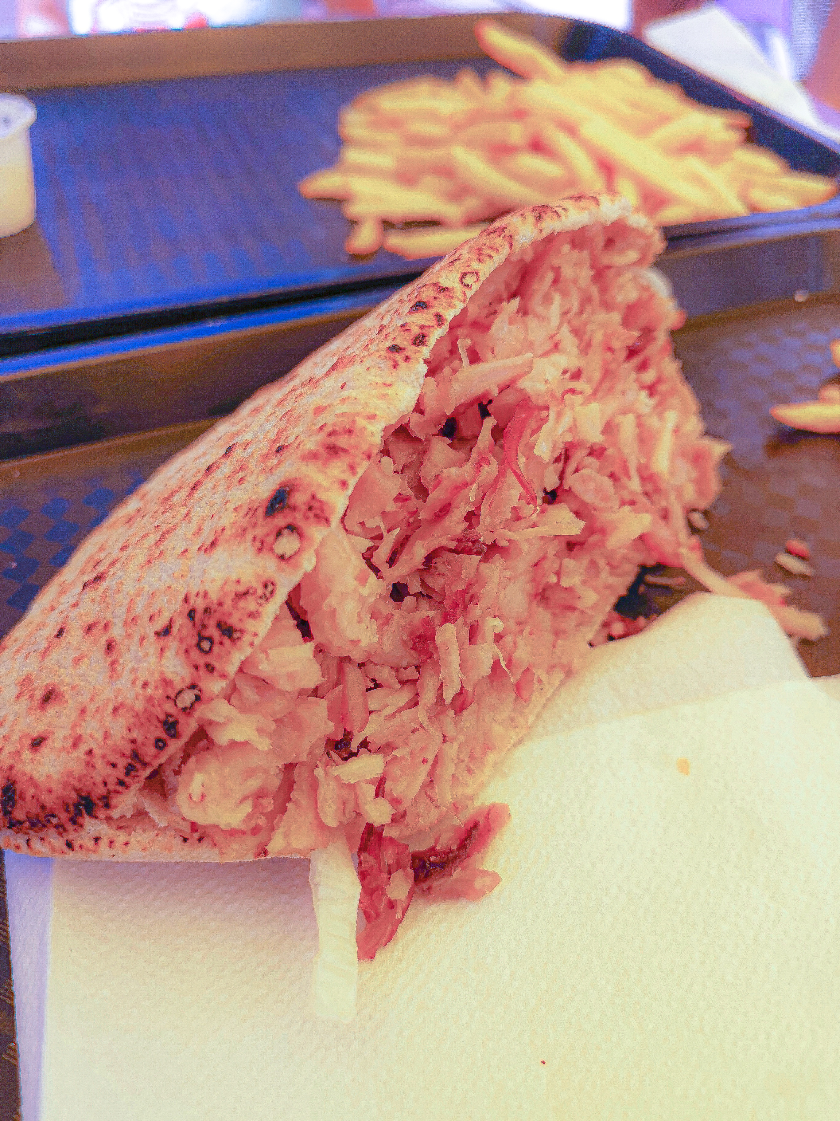 Trop cher , viande en charpie (pas de gros morceaux) ,les deux sauces sont dans le même pot, très peu de frites . Pour leur décharge il était très tard et ça ne doit pas être le cas tous les jours