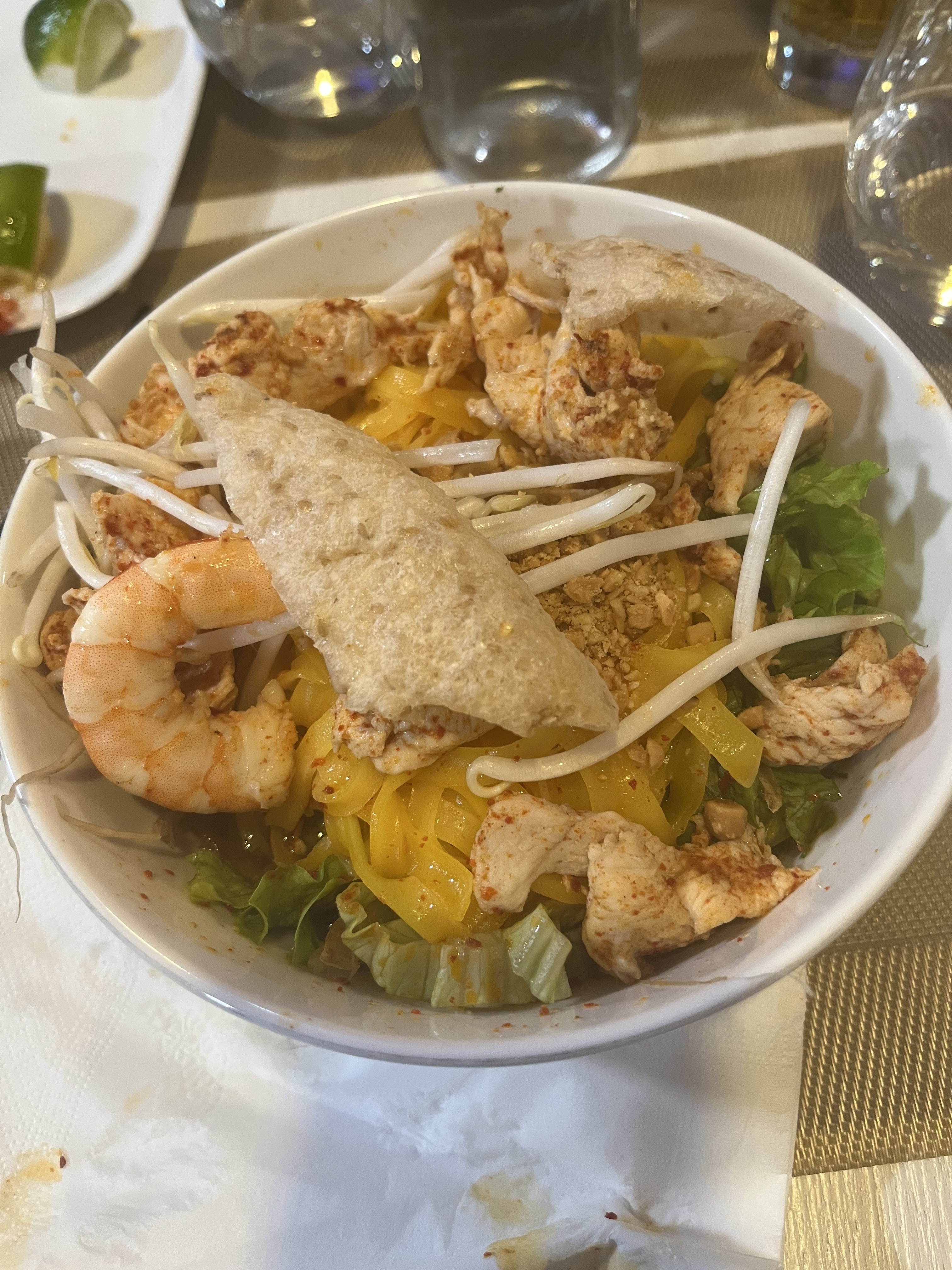 Je m’y suis rendue un soir avec des amis. Le staff est très agréable. J’ai pris un pad thai végétarien tandis que mes amis se sont rabattus sur les plats vietnamiens proposés. Les quantités étaient très bien pour le prix. Ce n’est pas le meilleur pad thai que j’ai mangé mais mes amis ont bien aimé leur plat et nous avons passé un bon moment !