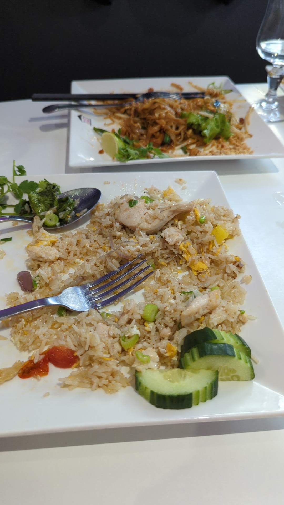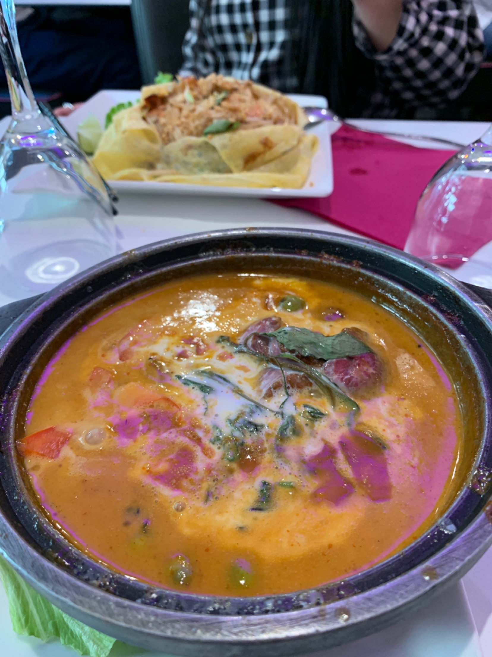 Bon accueil, serveurs gentils et souriants, service un peu brouillon. Plats très savoureux mais un peu trop piquant à mon goût. Prix très convenable, je recommande. Sur la photo : canard au curry rouge, et pad Thai entouré d’une omelette ! 👍🏻