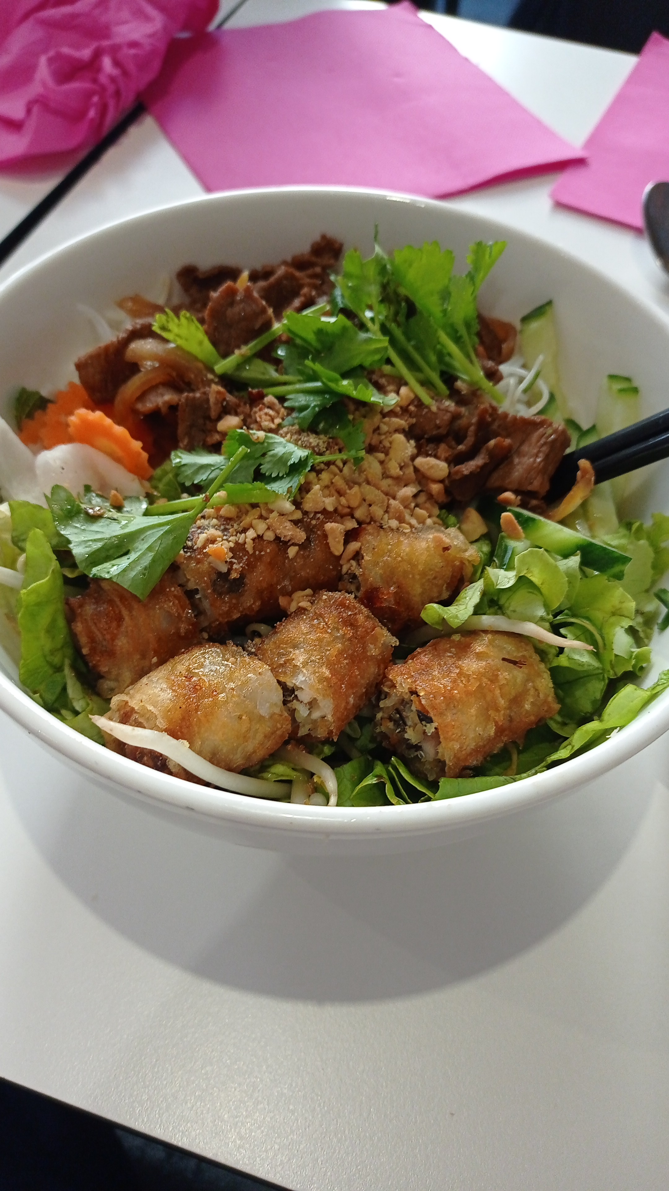 Venus entre collègues pour le déjeuner, lieu clair, moderne et plutôt propre. Service convenable mais plutôt lent quand on reprend le travail après. La carte est bien remplie (trop peut être ?), les prix sont dans la fourchette haute, raviolis chinois pour moi > corrects, raviolis vietnamien pour mon collègue les crevettes piégées dans le raviolis n'étaient même pas décortiquées > entrée non finie. BoBhun au bœuf pour moi > plat tout juste chaud et loin d'être exceptionnel, beaucoup de verdure pour le volume et peu de viande surtout pour le prix. Pad thaï pour mon collègue idem peu garni en viande, beaucoup de verdure et a peine chaud. Café a 3€ !!!! quand on viens de commander entrée + plat le café a 3€ ne passe pas vraiment. Résultat première et dernière fois dans ce resto.