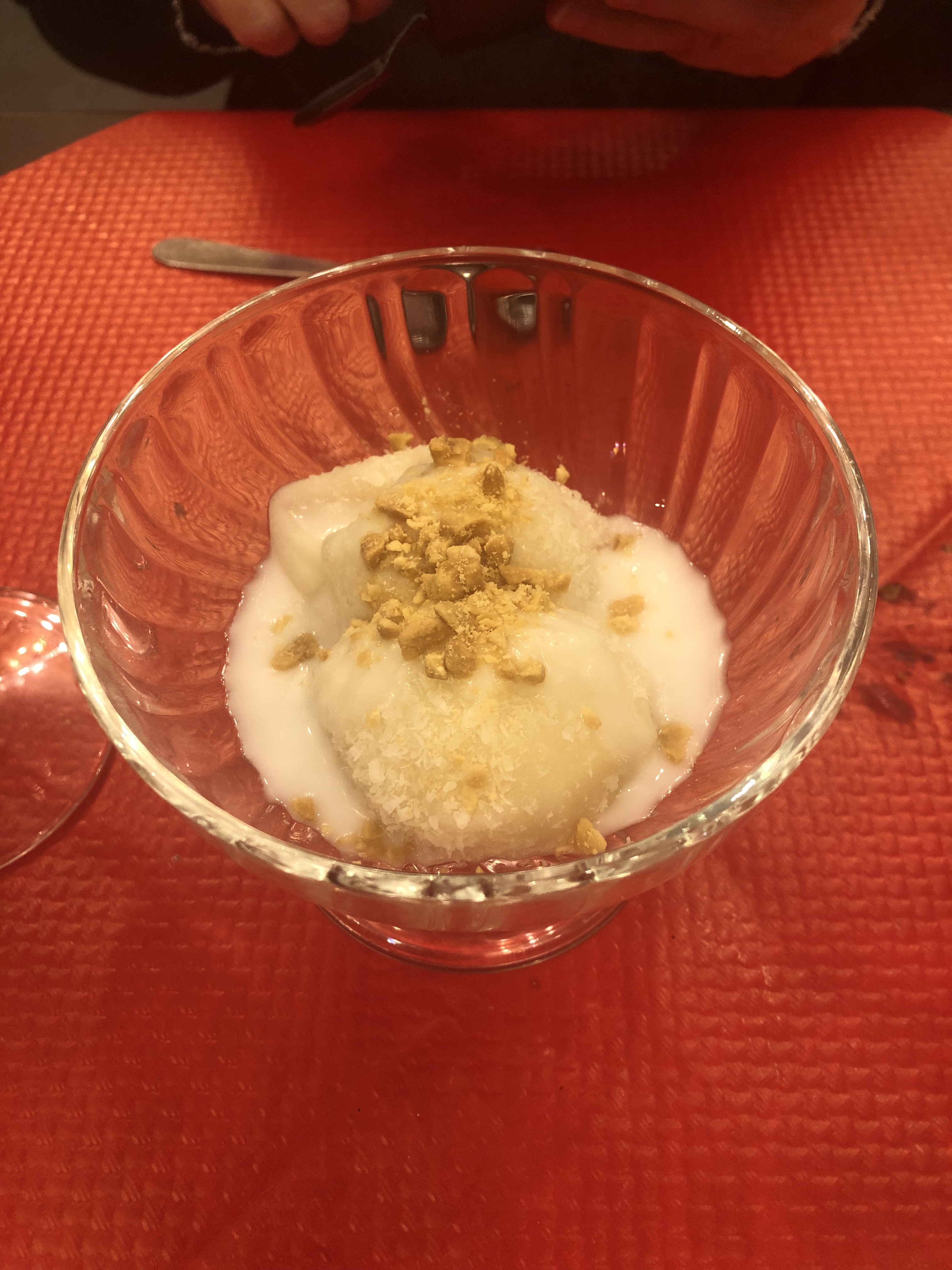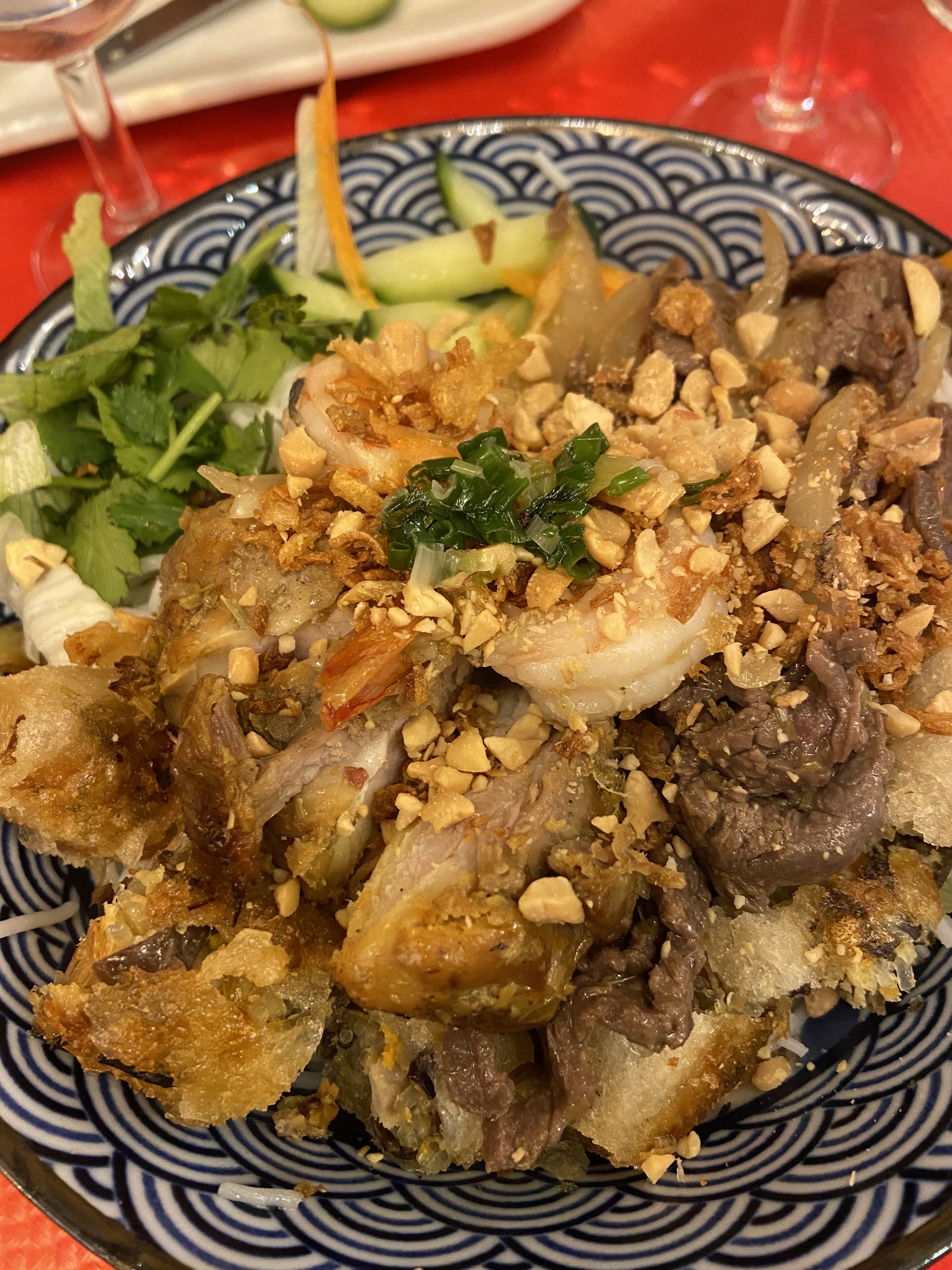 Quelques Cha Gio ga (des nems au poulet), une belle découverte Mi xao gion soit, des nouilles croustillantes accompagnées de légumes, de crevettes et de porc et des litchis pour terminer. J'ai eu les yeux plus gros que le ventre 😀. Mais que c'était bon !