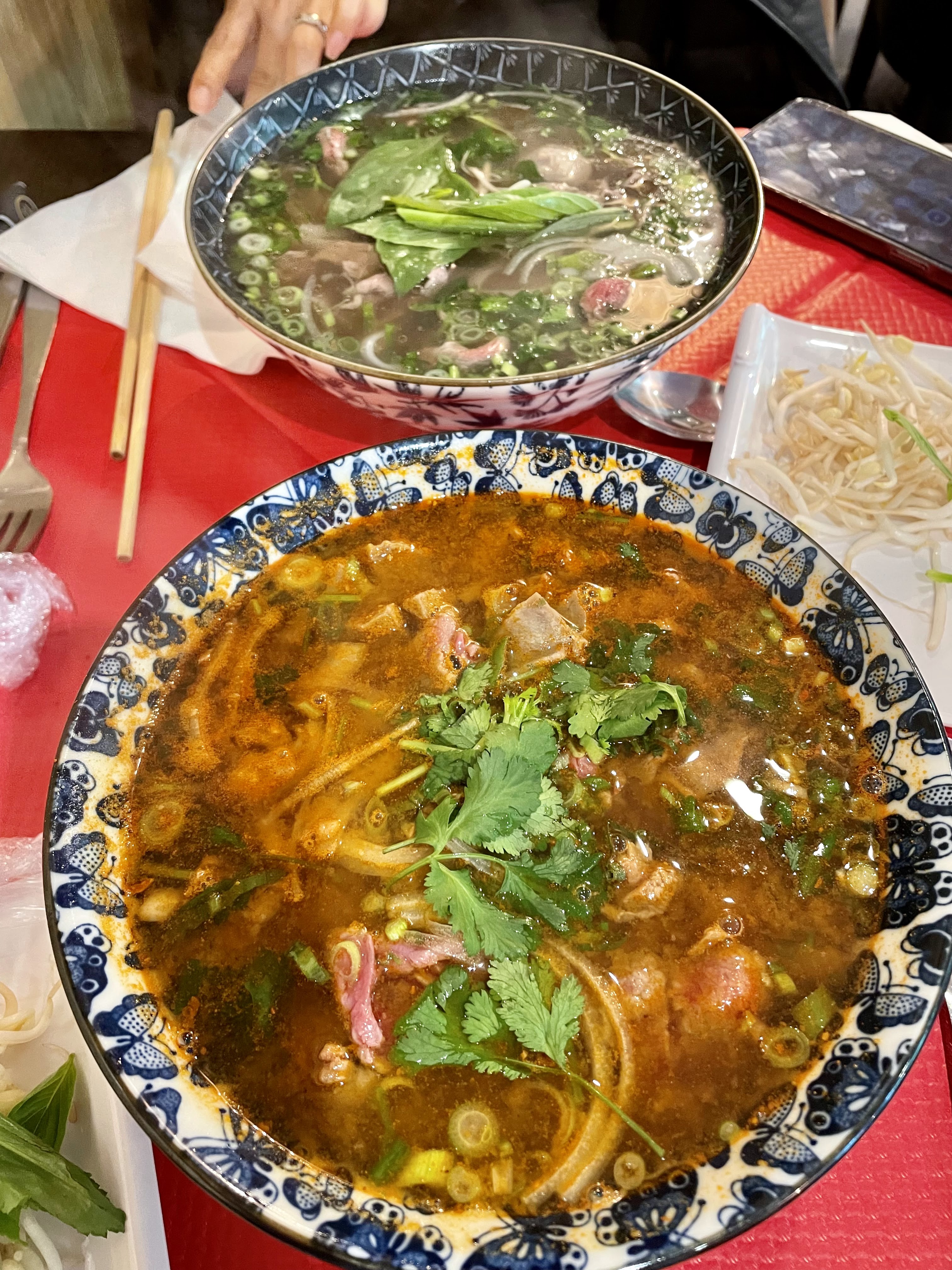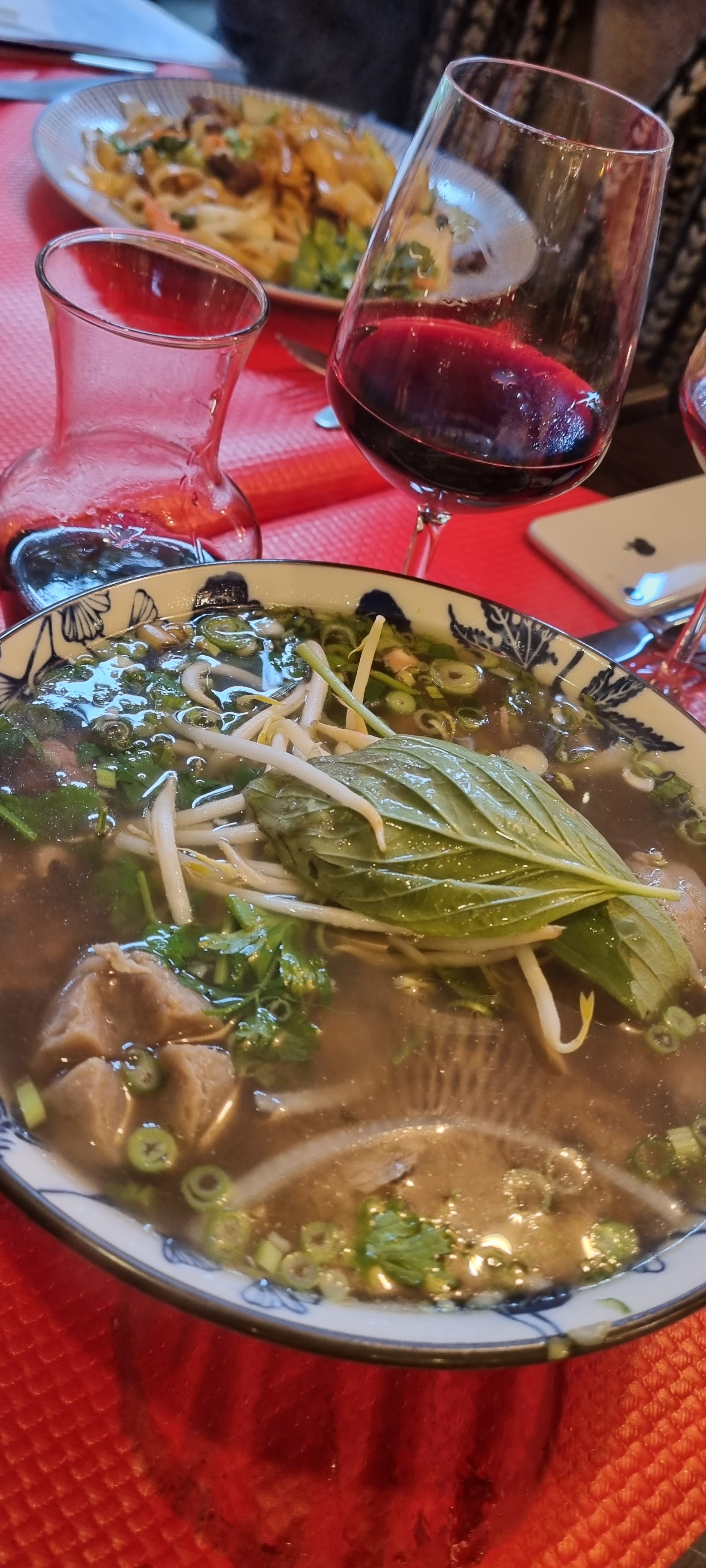 Bonne surprise pour ma part ! Accueil chaleureux avec grand sourire,joli décoration surtout l’éclairage du plafond 🎈🥰 Soupe Phô bonne mais pas assez gourmande pour moi 😂 ( oui je suis gourmande… il fait froid ce soir 😅) quand à la salade de bœuf … je m’attendais à une saveur différente mais elle était pas mal ! On a dû demandé plusieurs fois pour avoir des baguettes 🥢 🙄🤔 En revanche la sauce ou le piment 🌶️ ça arrivent très rapidement 🥳