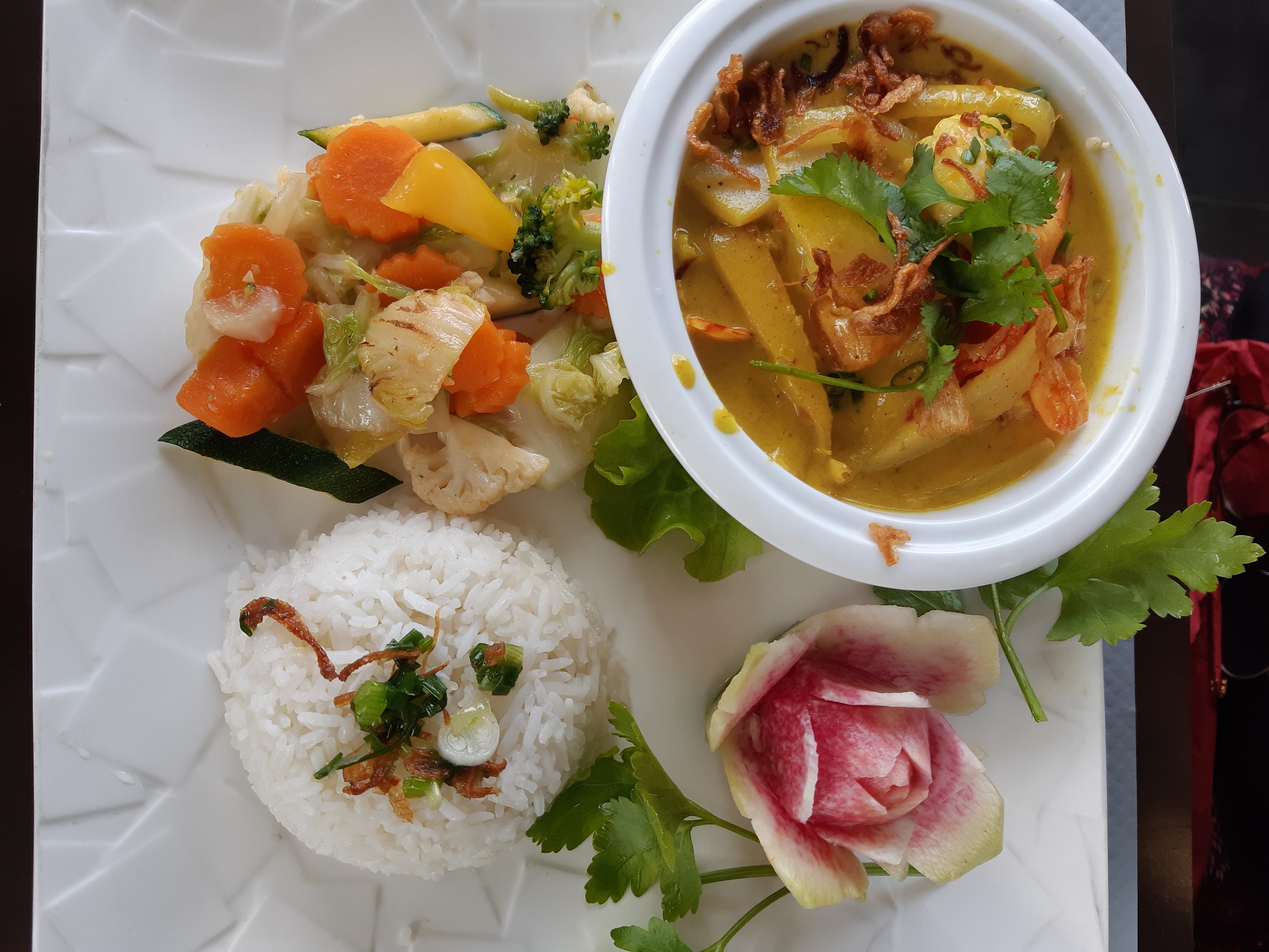 Grosse déception. Nous étions habitués à venir manger dans ce restaurant, ou le rapport qualité-prix était excellent et où les petites attentions étaient courantes et agréables. Depuis le COVID, la quantité et la qualité de nourriture a horriblement baissé : La moitié de ce qui y était servi est présente dans l'assiette, et adieu le litchi dans le cocktail, les épices parfaitement dosées, les morceaux de mangue et d'ananas dans les plats ; et bonjour à une quantité de sucre excessive, que ce soit dans les cocktails ou les plats, présente uniquement pour compenser le manque de saveur. Côté cuisson, on n'est pas mieux servi, avec des crevettes caoutchouc, et du riz pas cuit (qui au monde peut rater du riz ?). La serveuse n'était pas agréable et stressante, et les belles images affichées sur l'écran dans la salle de restauration ne sont plus que de l'histoire l'ancienne. Bien sûr, les prix ont augmenté, histoire d'ajouter à la déception déjà bien présente. Et pour couronner le tout, quand nos avons fait les remarques plus haut à la serveuse, elle nous a gentiment dit de faire avec, et aucun geste commercial n'a été fait. En conclusion, nous ne remettrons plus jamais les pieds dans ce restaurant.