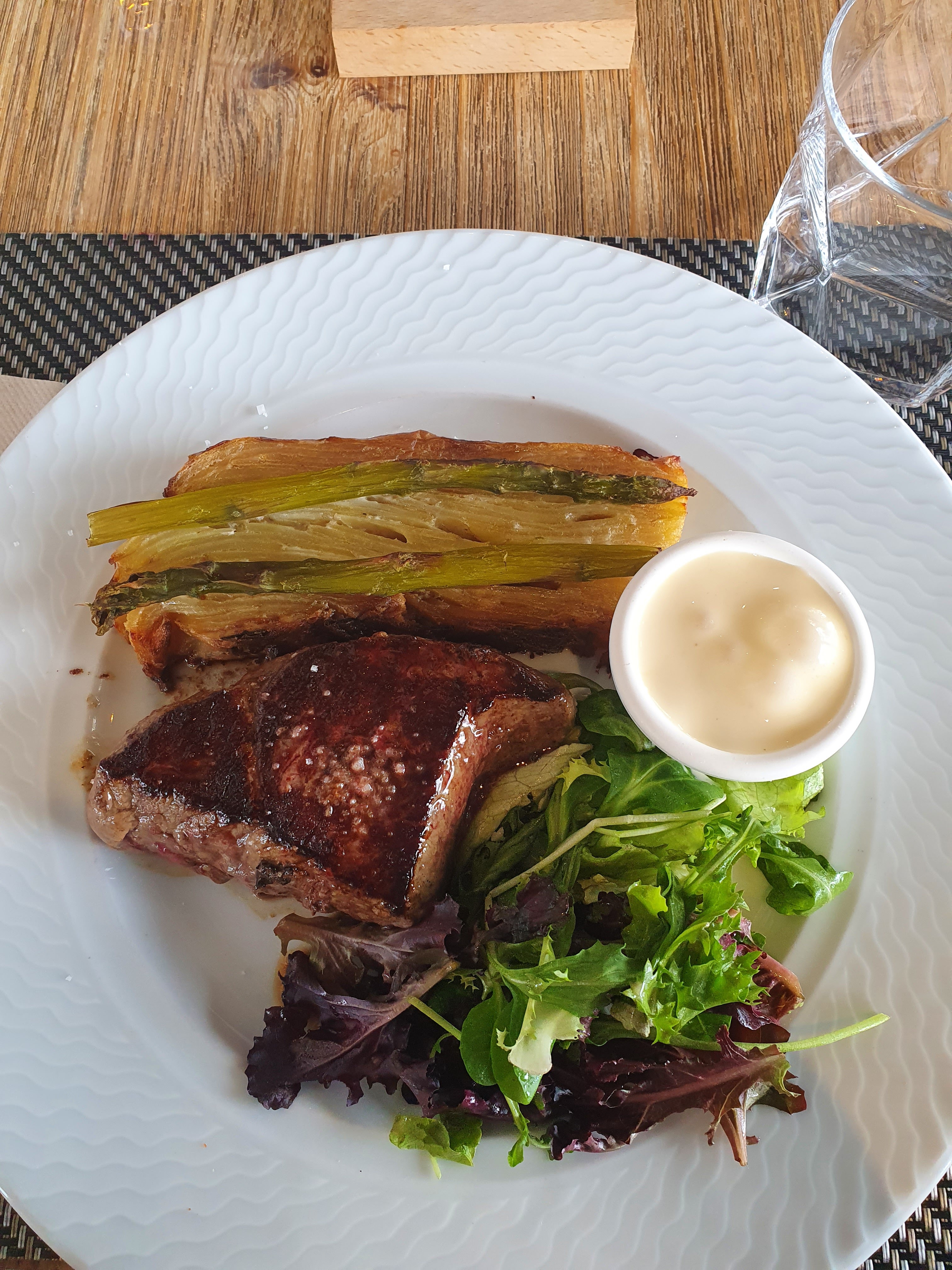 Situé en zone commerciale, au coin d’une rue avec de larges baies vitrées, l’accueil y est sympathique , le service rapide et correct. J’ai pris la formule entre, plat, dessert pour 29€90. Le foie gras en entre était bon bien servi. La pièce de bœuf cuite comme demandé mais ni la fourchette ni mes dents n’ont pu en venir à bout. J’ai abandonné après un tiers péniblement mastiqué. Le café gourmand était bon. Ayant vu que je n’avais quasiment pas mangé la viande ils m’ont offert le verre de vin.