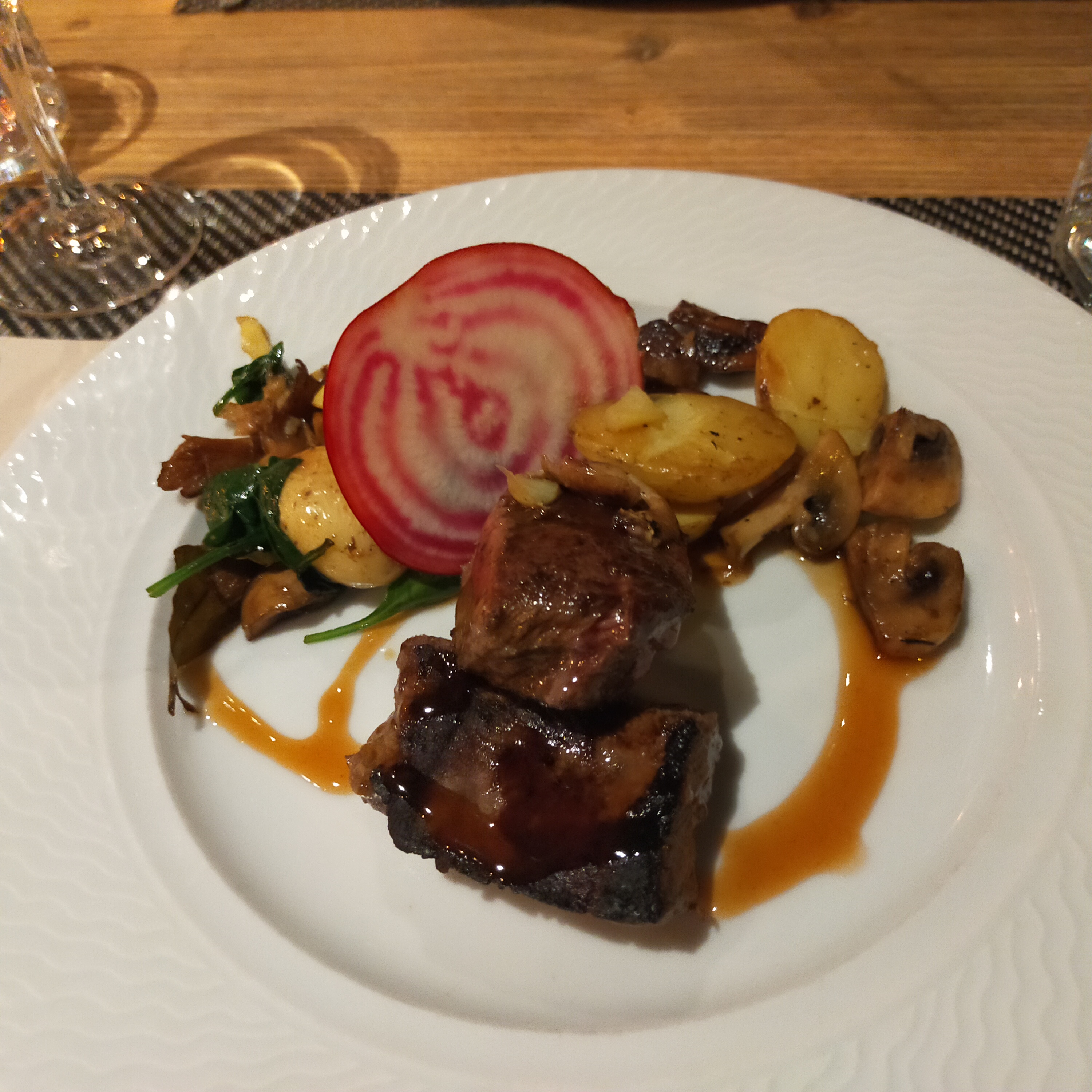 Accueil agréable. Décor superbe. Entrée délicieuse. Viande cuite comme je l'ai demandée mais trop dure. Impossible à manger. Dessert : royal chocolat poire. On a eu du mal à trouver la poire