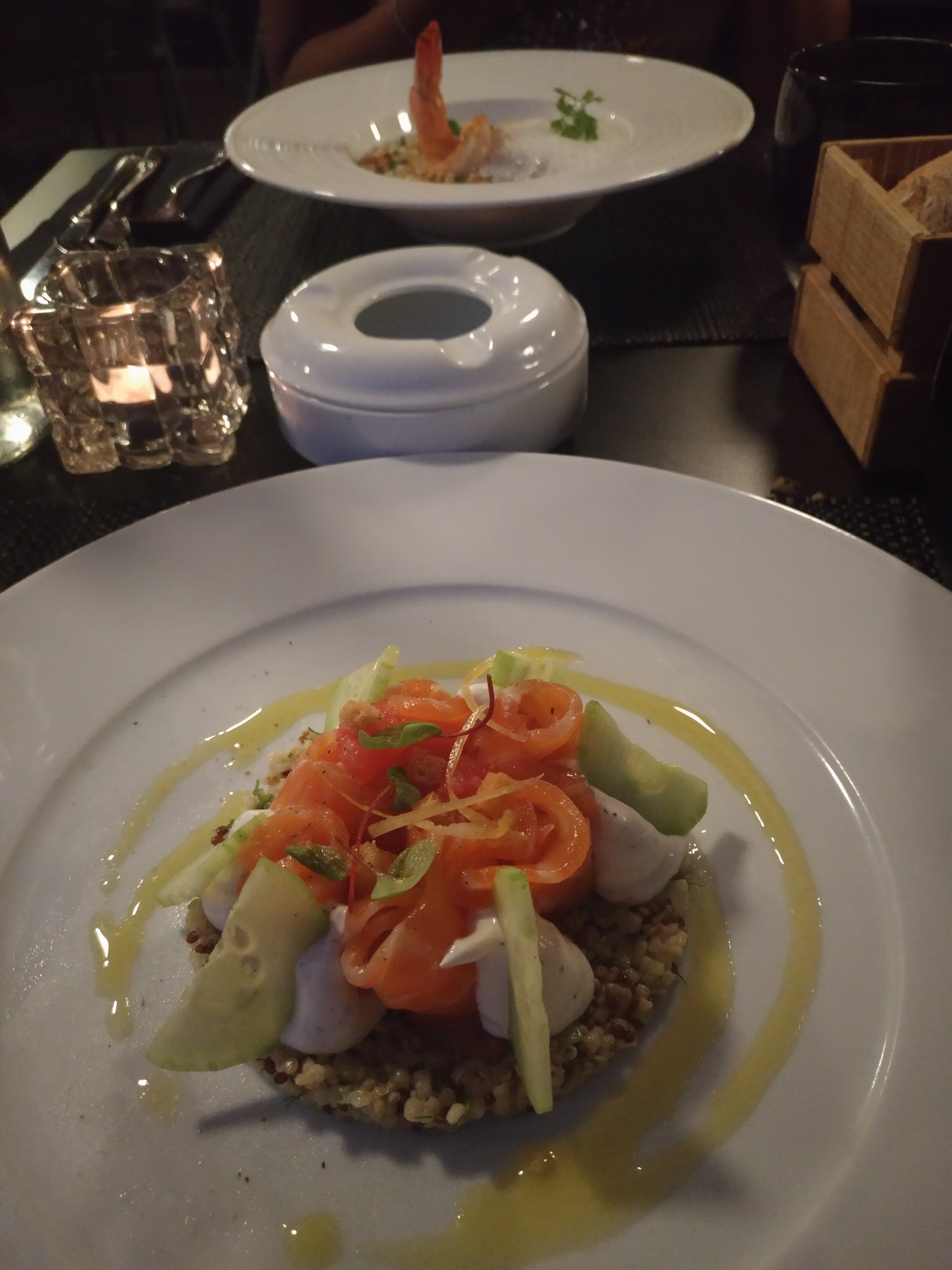 Bon mauvaise expérience, quantité dans l'assiette très minimaliste gambas à la carte en entrée à plus de 30 euros 3 mini gambas dans l'assiette autant dire gaspacho et ses petites gambas ... Le gigot c'est pareil 3 petits morceaux dans l'assiette viande dur et nerveuse...malgré l'effort des serveurs pour changé les plats le filet de bœuf très bon on nous enleve la bouteille de vin pas terminé qu'une serveuse à poser sur la table a côté et qui disparaît comme par magie on nous a offert 2 coupes de champagne pour rattraper les diverses péripéties mais honnêtement je ne re-commande pas du tout déçu par l'ensemble