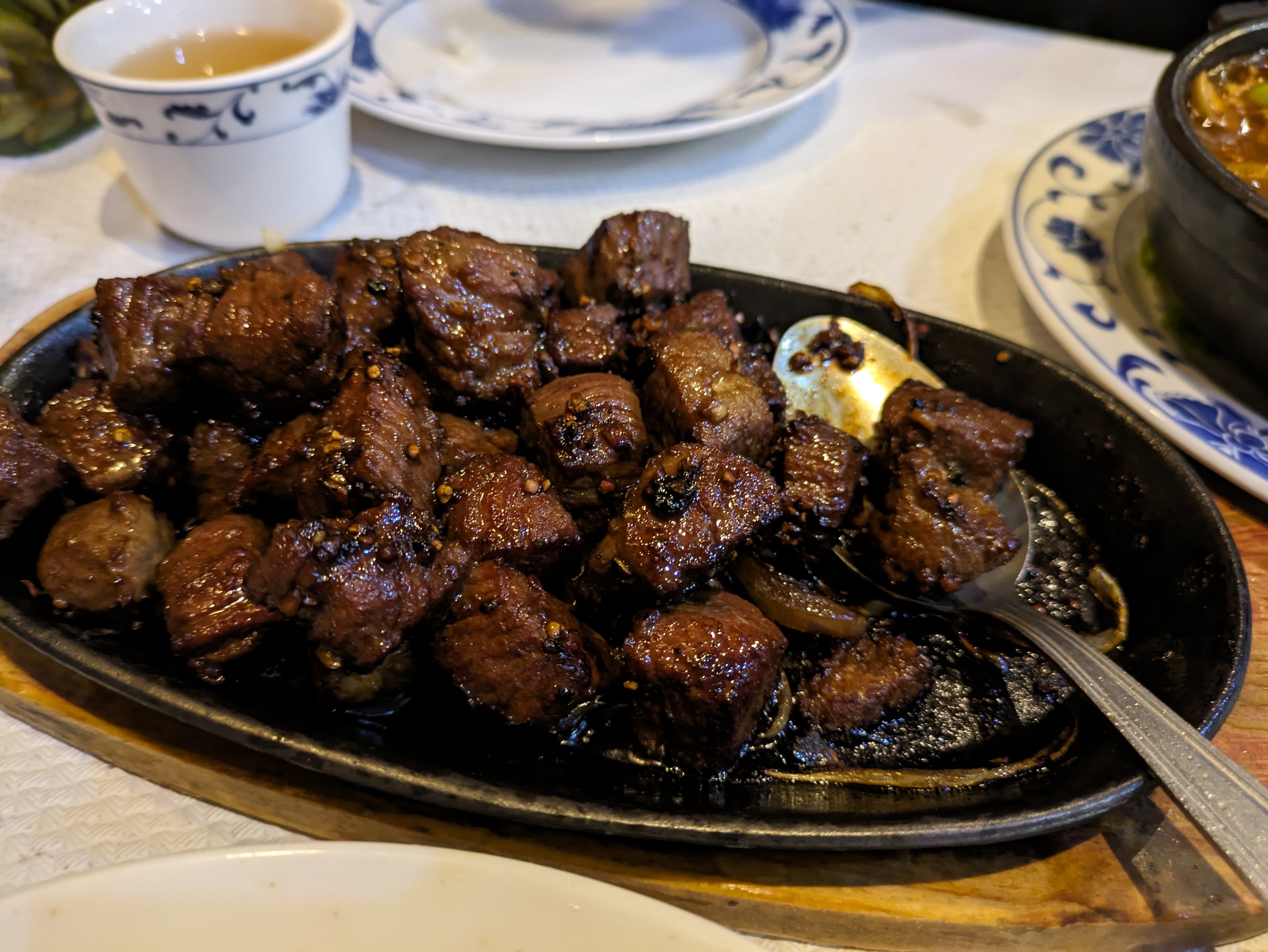 Des plats cantonais authentiques ! J'étais heureux de venir ici pour goûter à la maison. Cubes de bœuf au poivre noir commandés, chou chinois braisé aux champignons, porc au poisson salé avec pot d'aubergines, calamars frits au piment à l'ail et côtes levées au jaune d'œuf salé. J'ai été particulièrement satisfait des côtes levées au jaune d'œuf salé !
