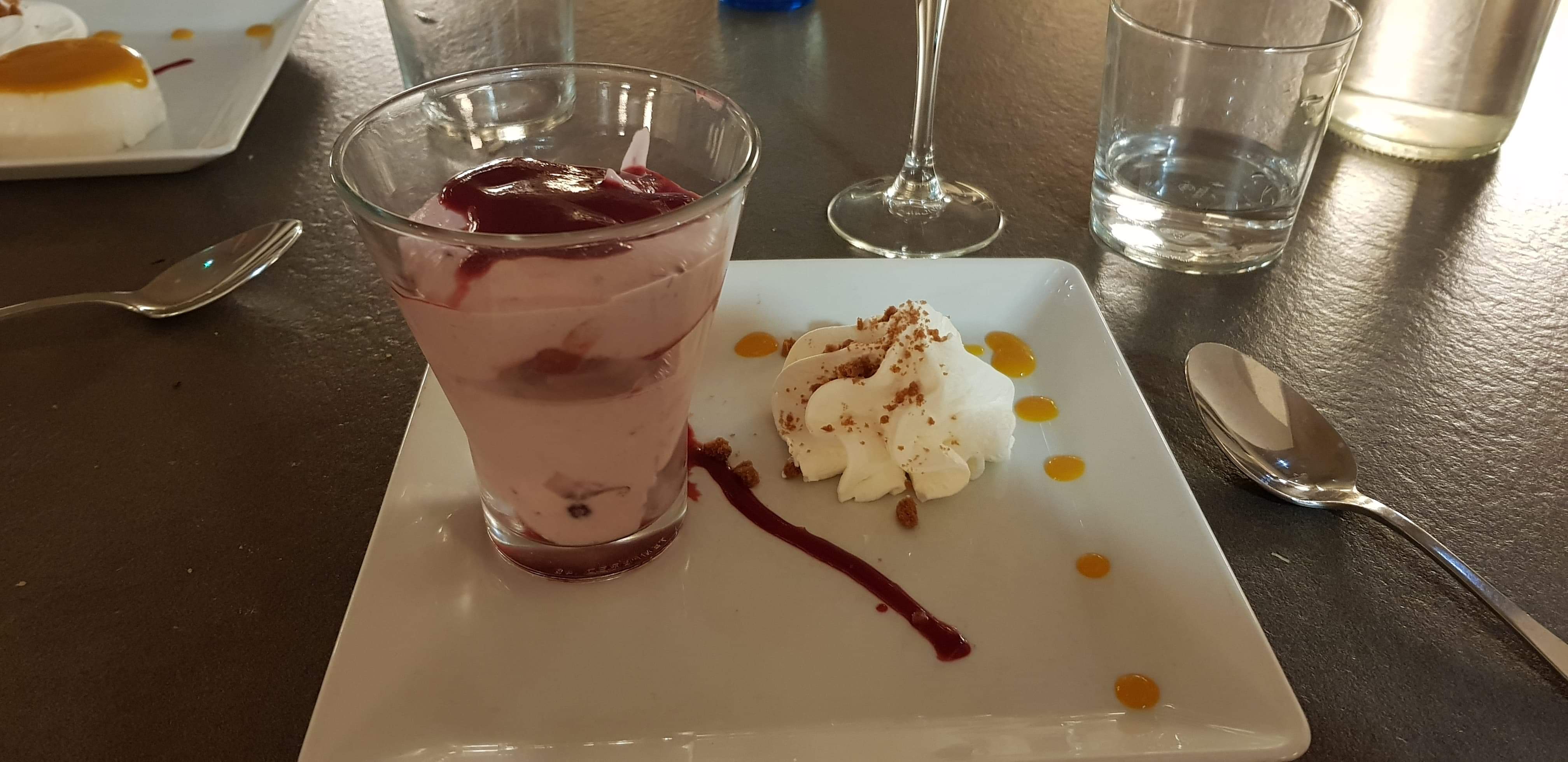 Dîner le soir Cuisine moyenne. Quantité un peu limite pour le prix. Cabillaud trop cuit et tout petit morceau par rapport à mes 2 collègues... Desserts : assez drole ce sont tous les mêmes de couleurs différentes. Même forme même moule même consistance, on se serait cru à la cantine 😅 Les plaids gentiment prêtés pour la fraîcheur méritent d etre lavés car ils ne sentent pas le propre. Hormis ça le cadre est joli et le service agréable.