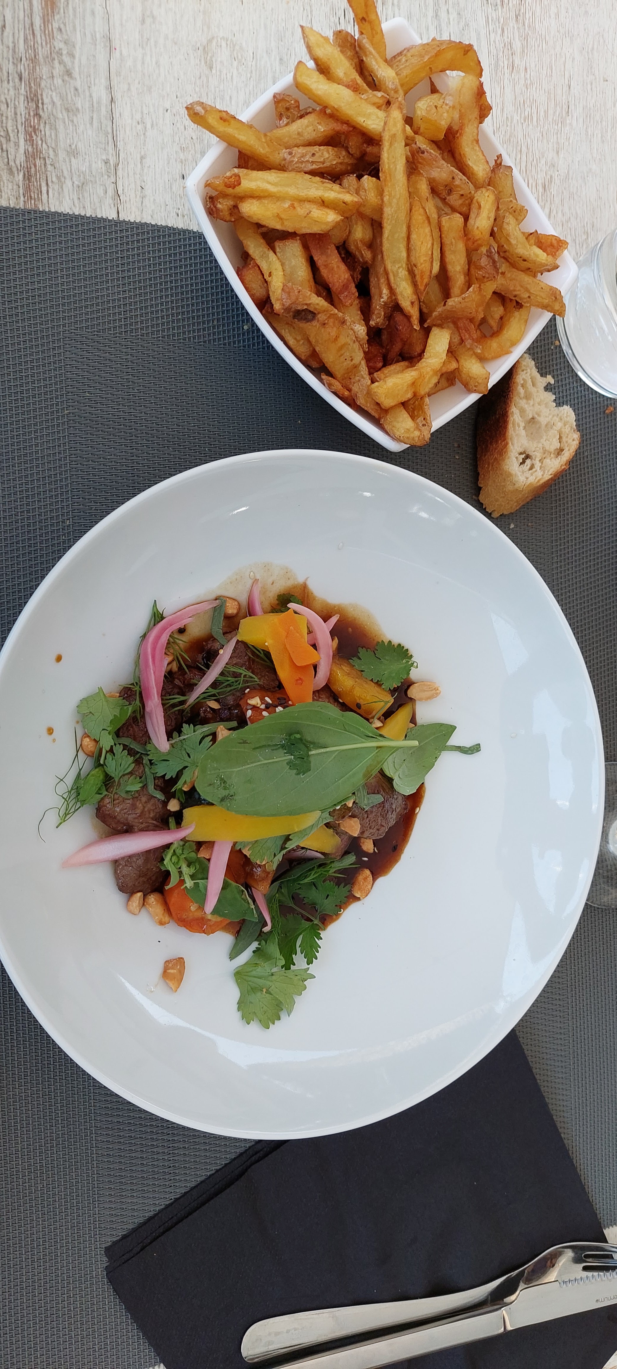 Moment très agréable dans un très joli cadre .cuisine avec des notes asiatique. Service impeccable et rapide ( pas besoin de réclamer du pain ou une carafe d eau fraîche)par une équipe jeune et très dynamique. Je vous recommande
