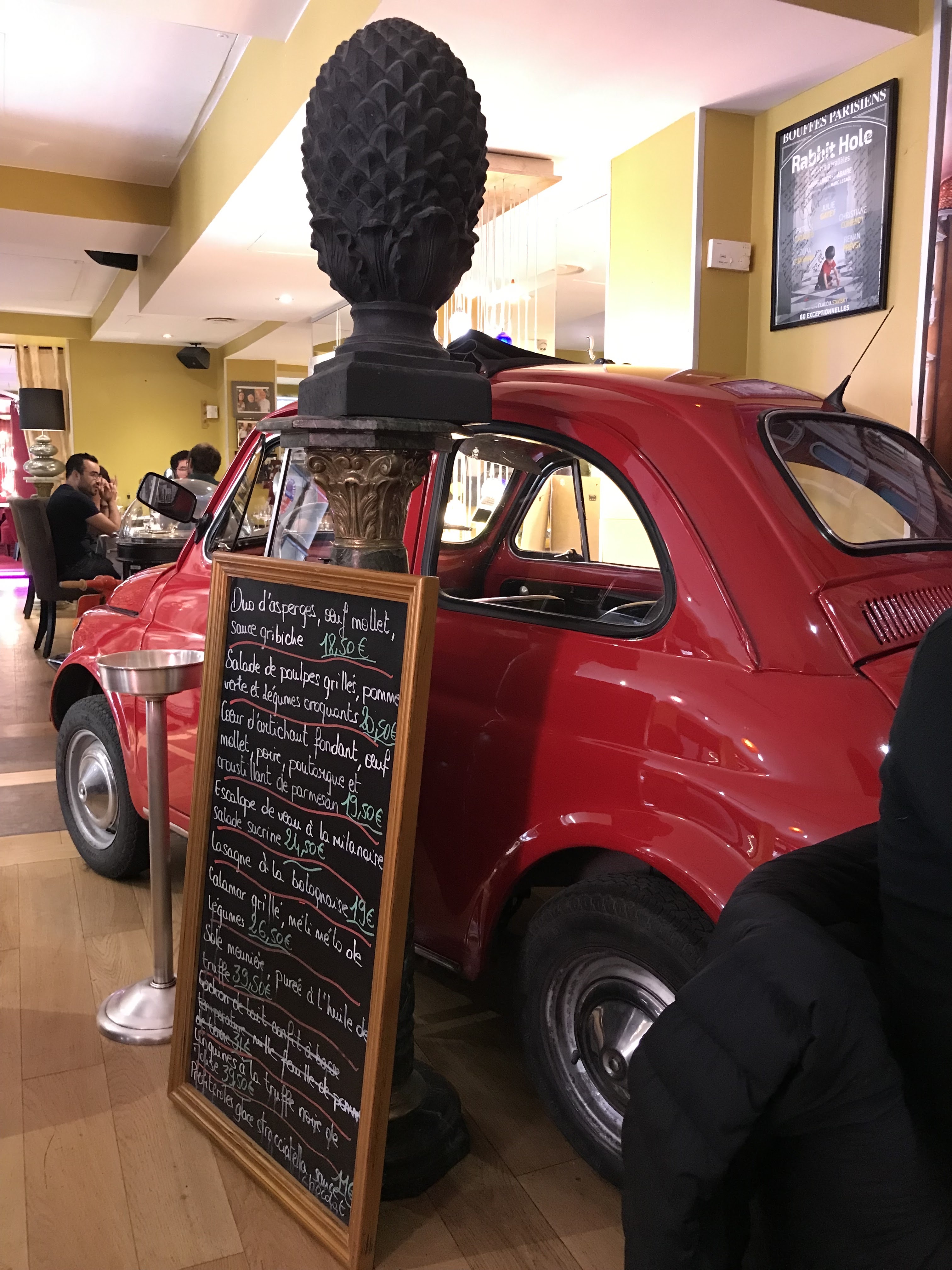 Super cadre avec une belle déco. Fiat 500 à l entrée pour vous accueillir. Le personnel est assez sympathique. La cuisine italienne est bonne . Son emplacement proche de tous les théâtres permet d y croiser quelques artistes.