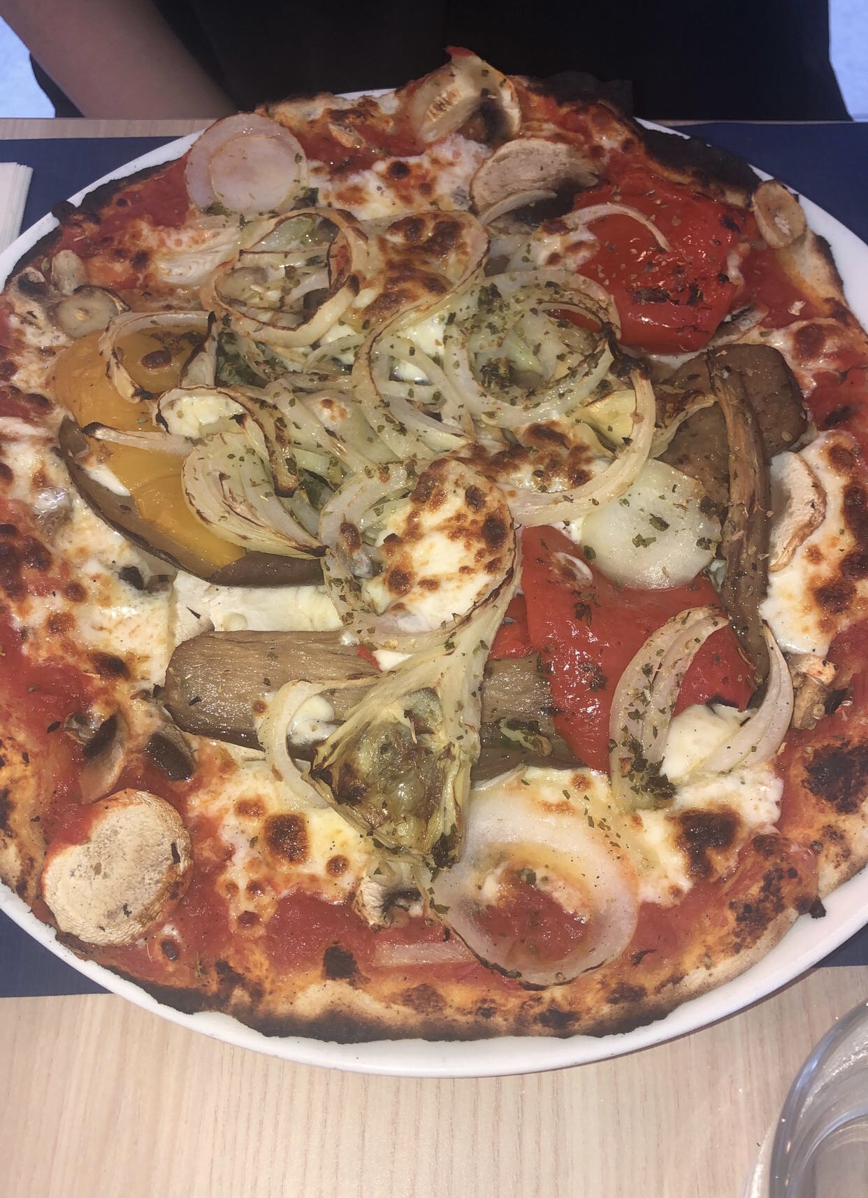 Pizza végétarienne excellente ! Poivrons et autres légumes dedans très bons !