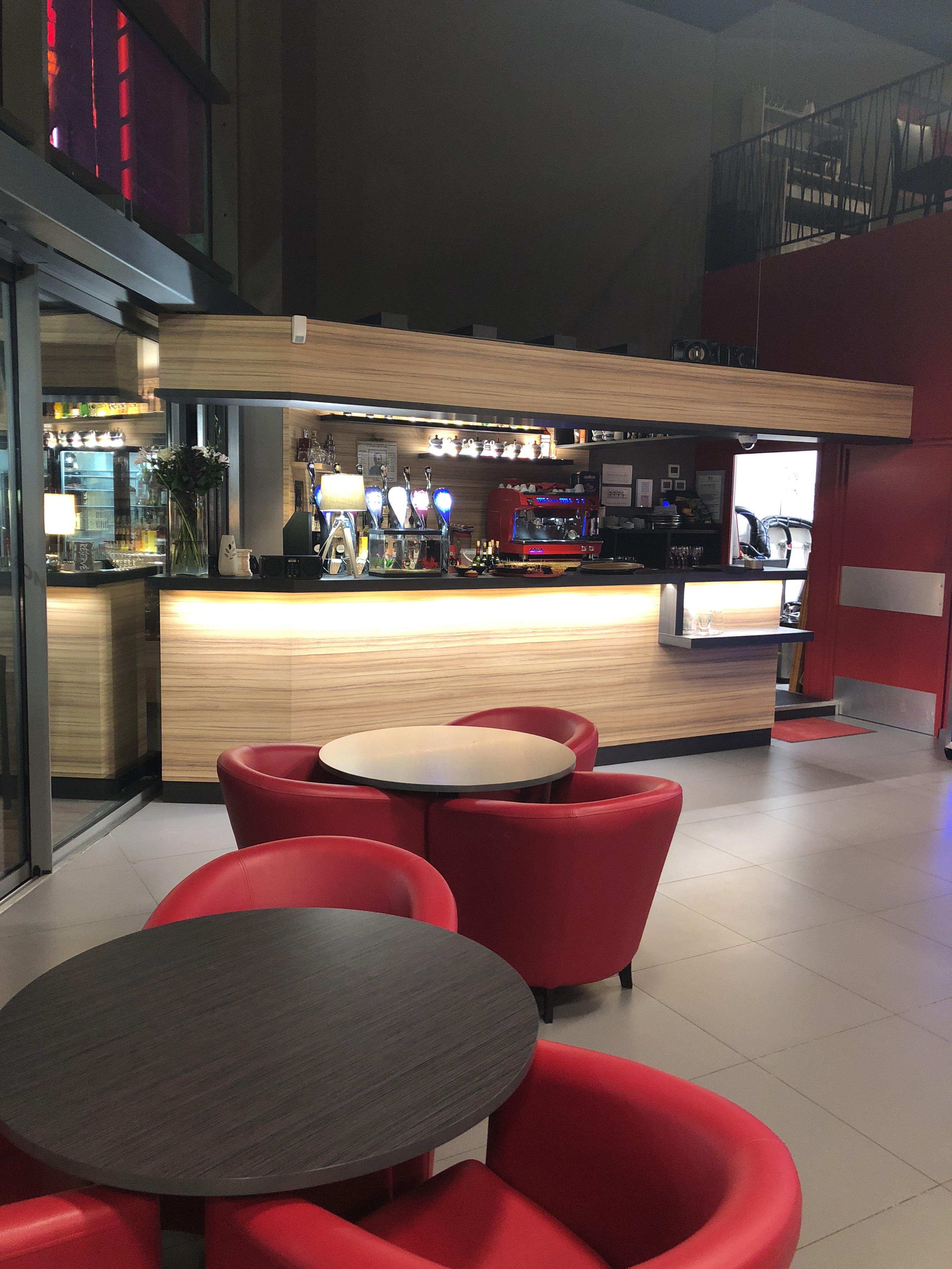 On y est allés en famille un samedi midi. on avait réservé à l'avance sur le site internet, facile, rapide, confirmé par mail et SMS, aucun doute du coup. L'équipe est souriante, un grand merci tout particulier à la si jolie pétillante Elodie ! Elle a été aux petits soins pour ma sœur handicapée qui fêtait son anniversaire. Les plats étaient bons (salades comme pizzas, glaces comme desserts gourmands-en photo c'est le Tiramisu Nutella). Sympa aussi de pouvoir acheter des places pour le cinéma à tarif réduit, on a pu en profiter dès l'après midi. J'enlève une étoile pour les prix que l'on a trouvé un peu excessifs... C'est la seule raison pour laquelle on y réfléchira avant d'y retourner. Merci encore une fois à l'équipe ! Souriante, rigolote, à l'écoute !