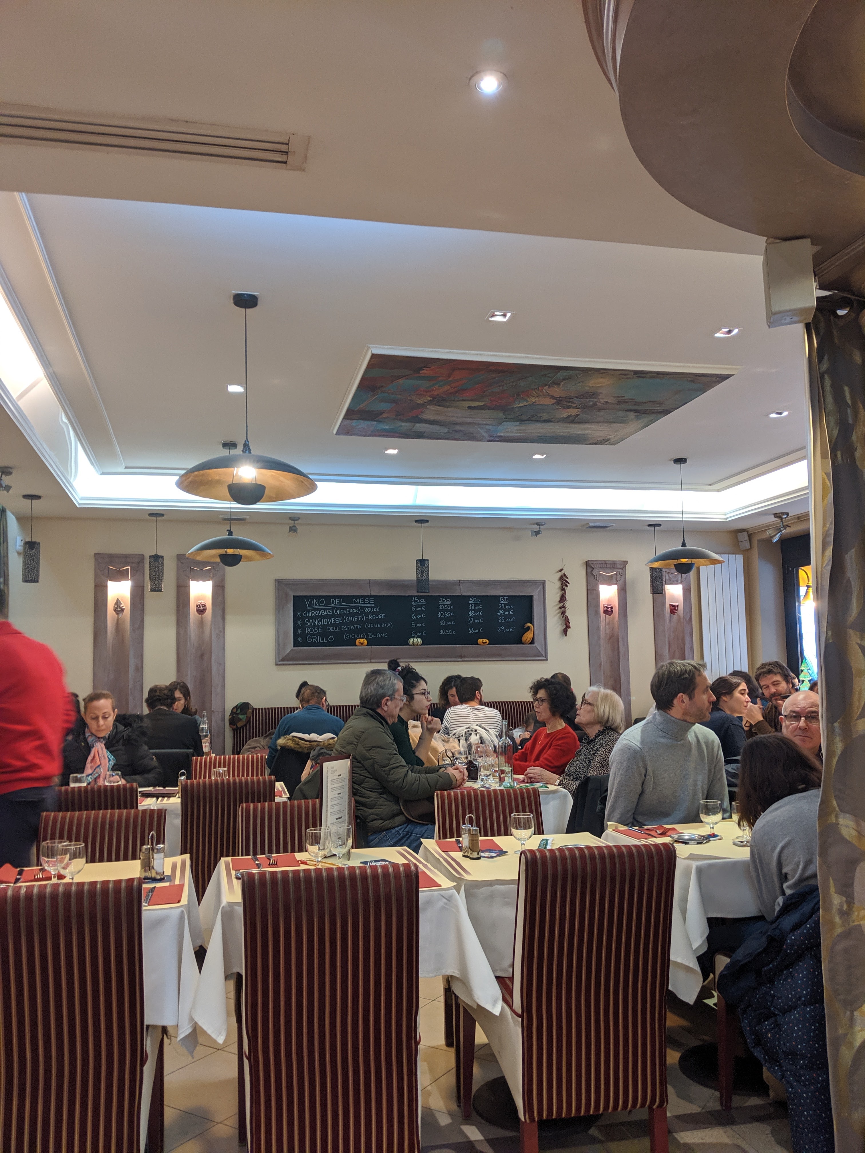 J'y ai récemment dîné avec des amis de Californie. Bonne table, bon service, salle spacieuse (nous étions 7 et nous avons eu une table dans une salle au calme, c'était en semaine). Bon plat, prix corrects, et serveur très 'comedia del arte' tout y était!