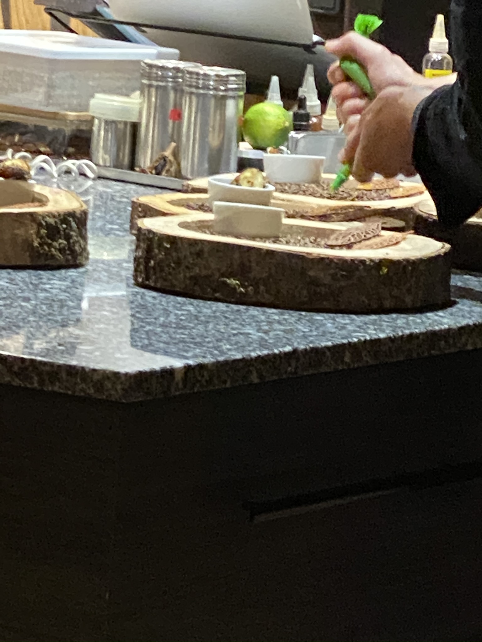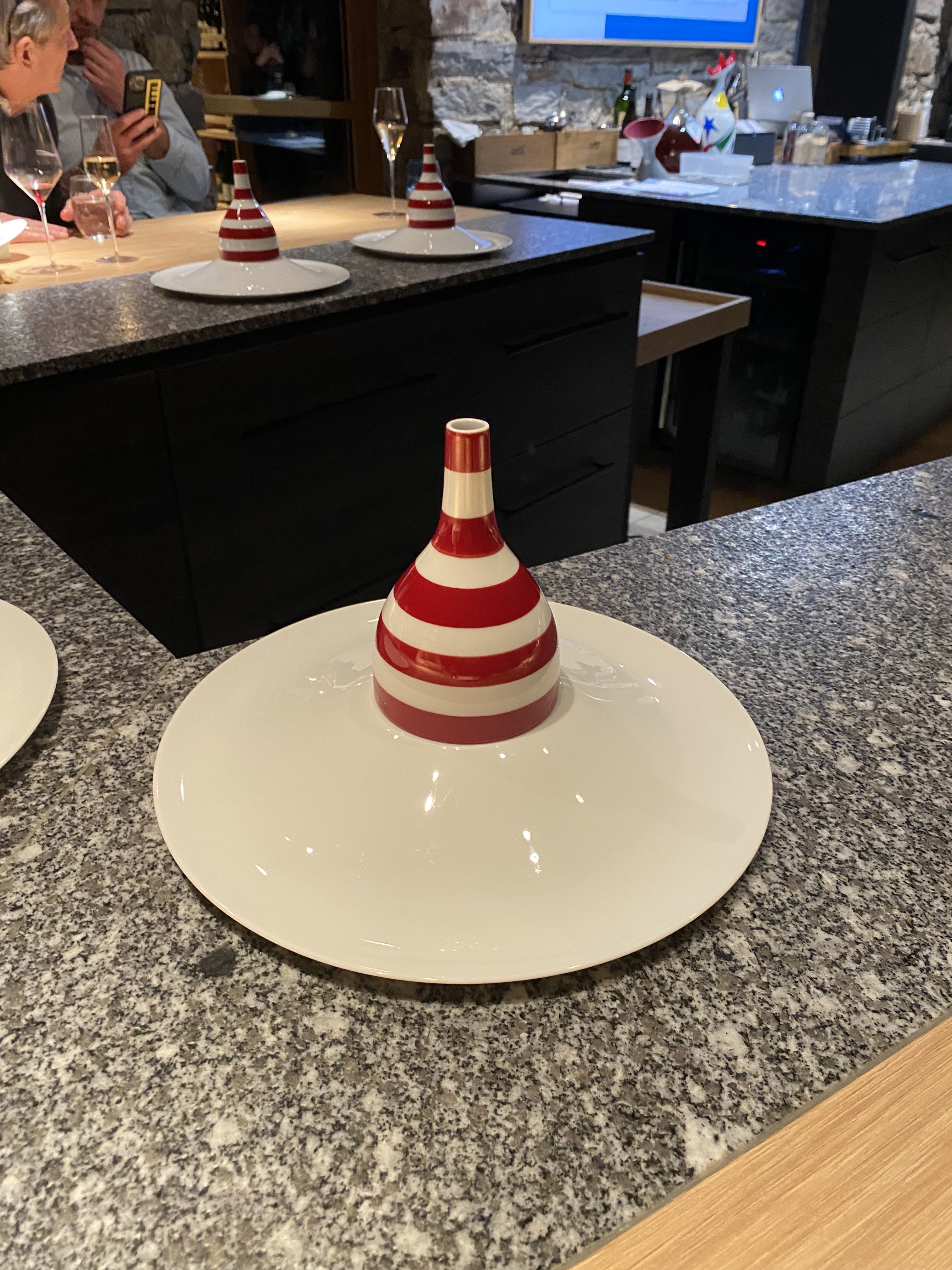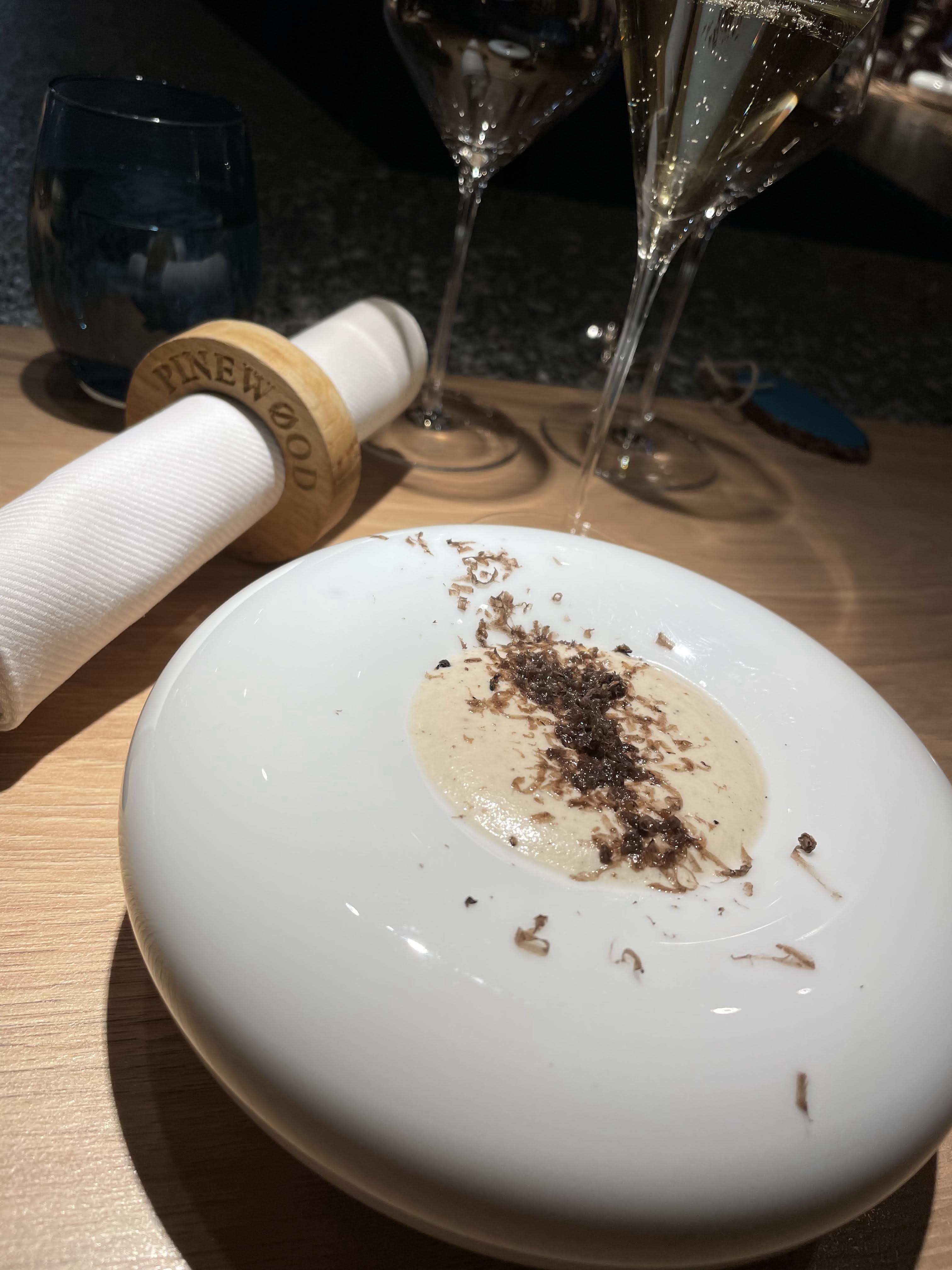 Une expérience culinaire exceptionnelle. Le restaurant est une table de chef de 14 places dans une cuisine moderne située dans une villa française. Notre menu était une dégustation de 15 plats accompagnée de 5 vins. Tous les ingrédients alimentaires étaient d'origine locale. Les plats individuels étaient étonnants par leur créativité, leur goût et leur présentation. Les propriétaires/chefs ont discuté des ingrédients, des sources et de la préparation pendant que nous mangions dans le menu. C'était assez fascinant d'apprendre comment ils ont créé ces plats étonnants à partir d'ingrédients rares trouvés dans la vallée du Tarn. Les vins étaient très bons, mais ce qui distingue vraiment Pinewood, c'est la magie des accords. Il était évident que les plats avaient été créés en pensant aux vins et cela montrait vraiment à quel point certaines saveurs et odeurs de plats ressortaient vraiment avec le vin associé. Un endroit très spécial.