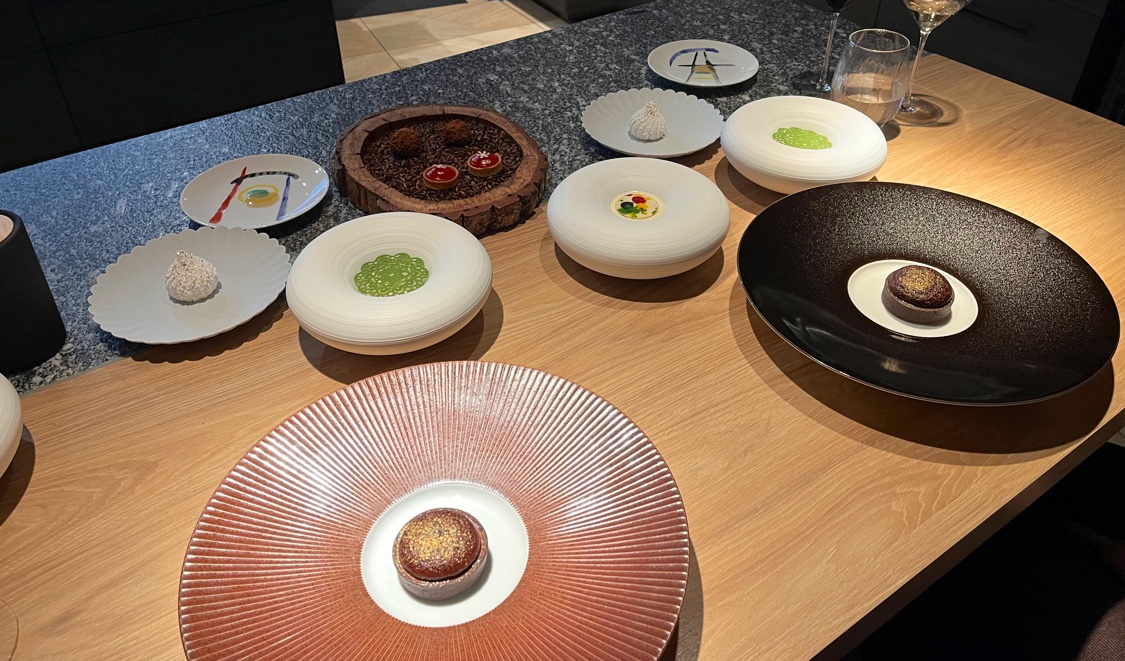 Une expérience unique, à la fois par la disposition de la table et le déroulement du service, permettant d'appréhender la réalisation de chaque met avant de le déguster. Chaque met dégusté est le fruit d'un travail millimétré réalisé, avec un produit du terroir, qui en fait découvrir toutes les saveurs