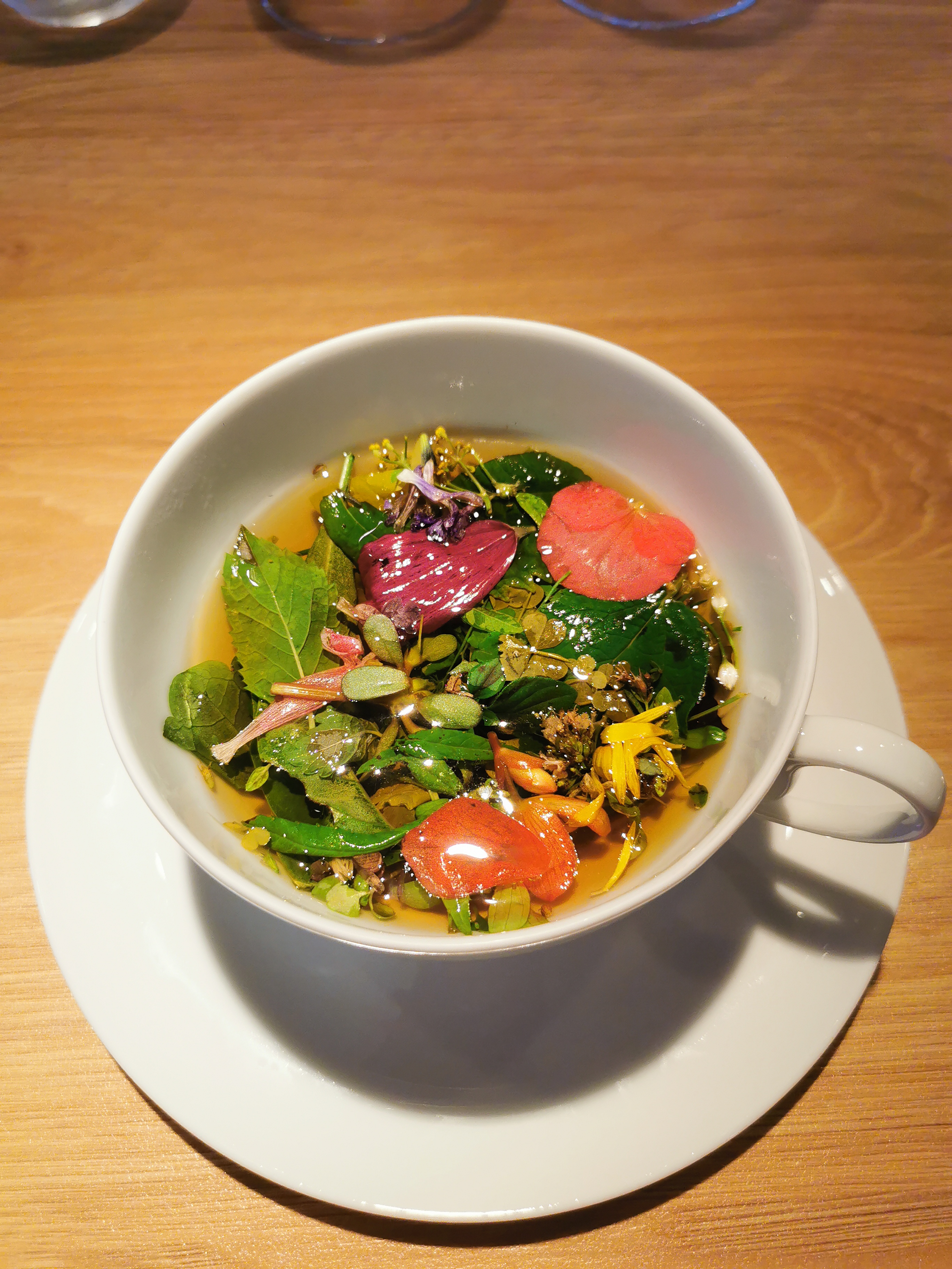 Lieu intimiste particulièrement adapté à ce type de service. Ce repas a été pour mon épouse et moi EXTRAORDINAIRE tant les plats et/ou les accompagnements à base de plantes ont été des découvertes, sont fins, goûteux, expressifs en goût et sortent du quotidien. Nous avions opté pour l’accord mets/vins ; c’est indispensable car sur ce dernier point les découvertes sont également légions.Brefs, ce repas fut un moment savoureux dans toutes les acceptations du terme…à découvrir d’urgence