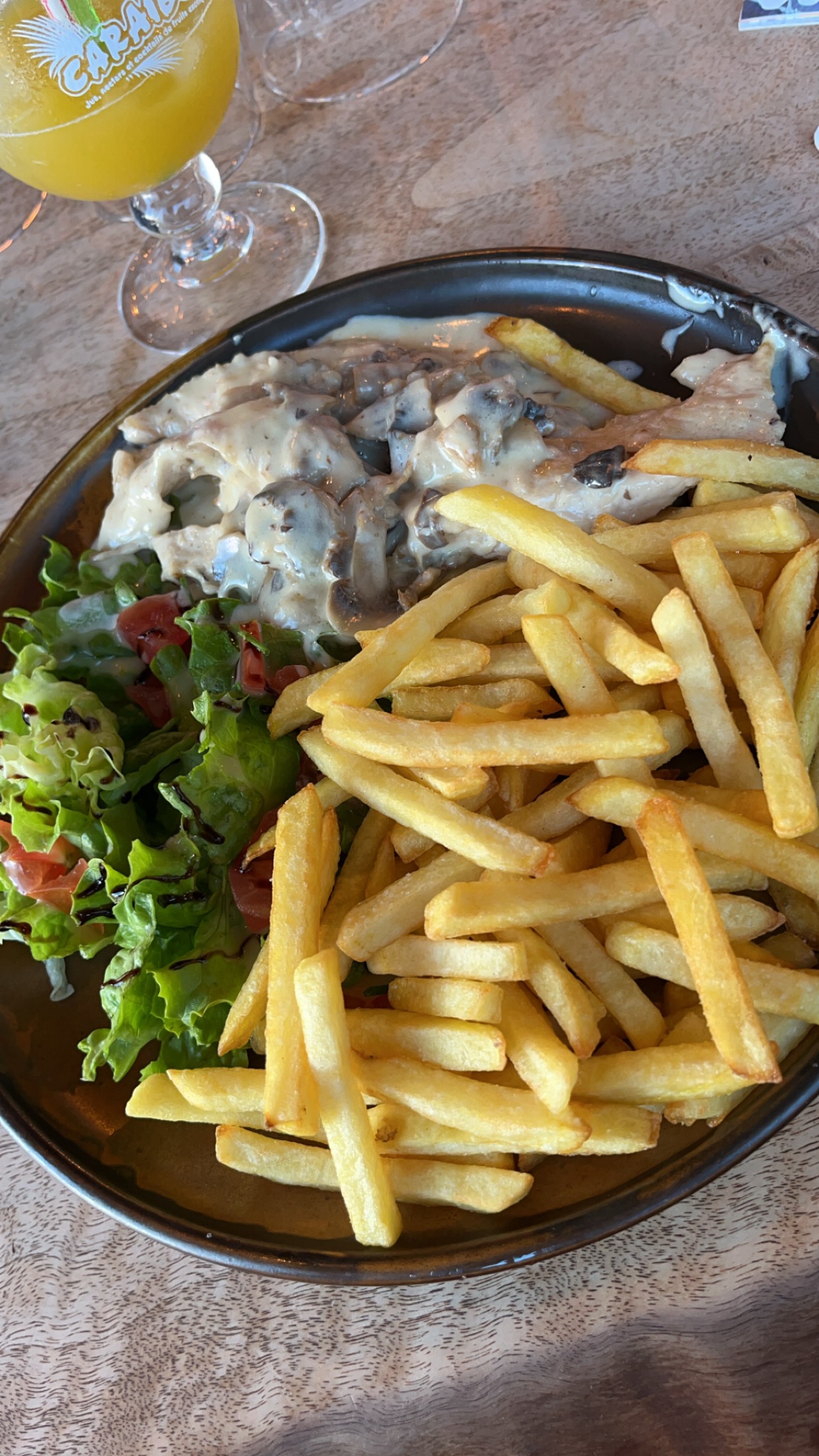 bonjour nous avons réserver pour 3 personnes Ma mère as pris: En entrée: Une douzaine d'escargots au beurre de maître d'hôtel En plat: un pavé de rumsteack avec des pommes de terres sautées avec sauce gorgonzola et une petite salade verte En dessert: une dame blanche Moi j'ai pas pris d'entrée mais j'ai pris en plat: hamburger avec un steack haché et des pommes de terres sautées En dessert: une glace sorbet framboise Mon père as pris: en entrée: une salade de chèvre chaud En plat: une entrecote avec pommes de terres sautées et sauce gorgonzola En dessert :une dame blanche avec un café et un get 27 Et nous nous sommes régalés et nous avions presque tout essayer ce qu'il y avait sur la carte et franchement c'est trop Bon au top nous reviendrons je vous conseille ce restaurant si vous avec l'occasion de tester le restaurant