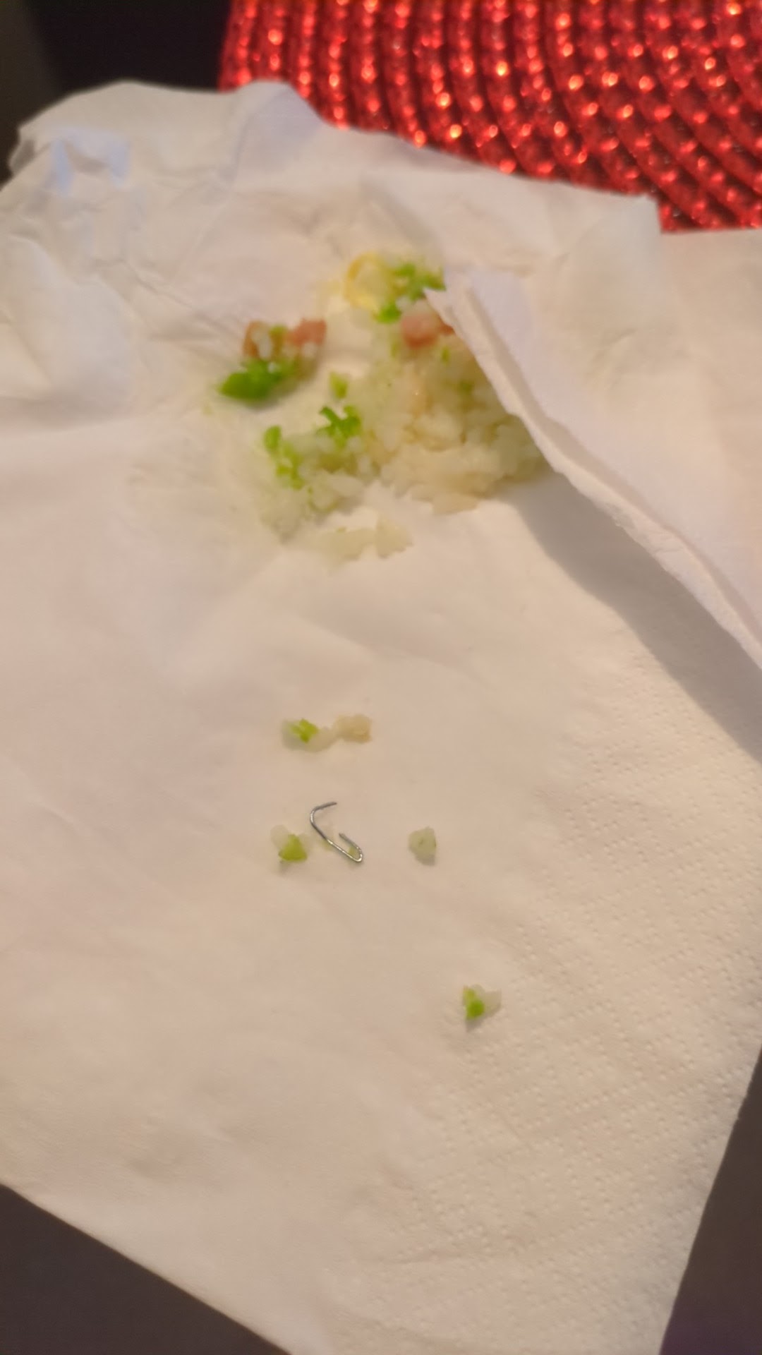 J'ai commandé aujourd'hui du riz cantonais et heureusement que j'ai recraché ce que j'avais dans la bouche parce que c'était une agrafe une agrafe... Meme moi j'en reviens pas. C'est la première fois que ça m'arrive. Ça fait des années que je commence chez eux. J'ai jamais eu aucun souci mais là c'est très dangereux